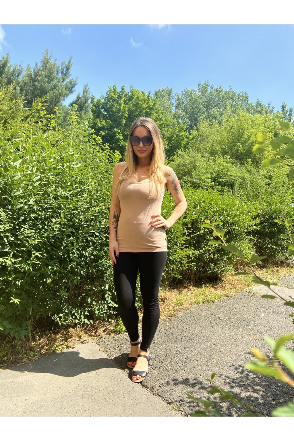 Klasické vyštíhlené tílko, které se hodí snad ke všemu. Má delší střih a materiál je slabší úplet bavlna/elastan.