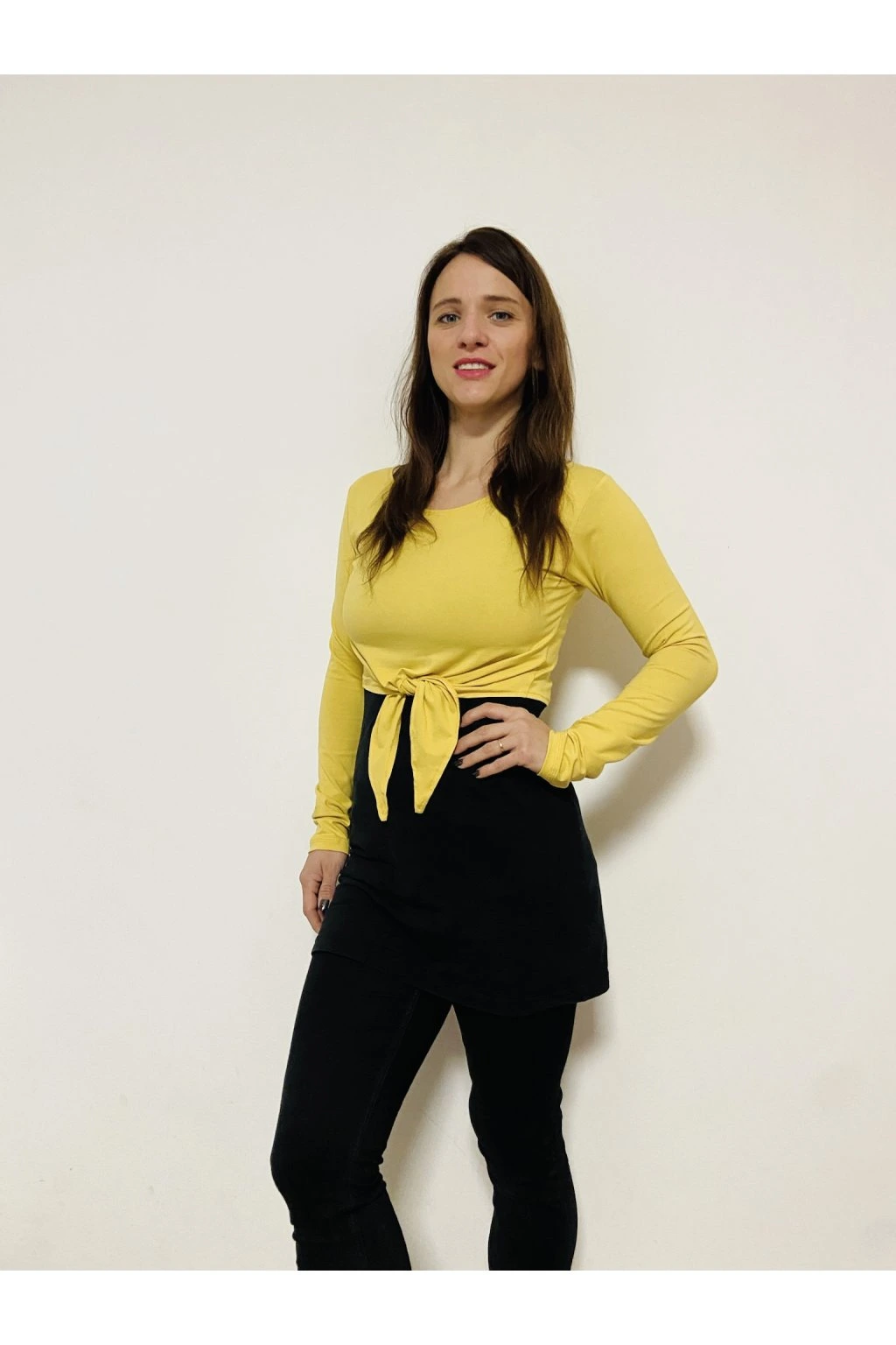 Výrobek sedí hezky natělo, díky menšímu výstřihu nemusí sedět ženám s velkým poprsím, popřípadě volit větší velikost. Modelka na fotografii měří 165 cm a na sobě má velikost S.
