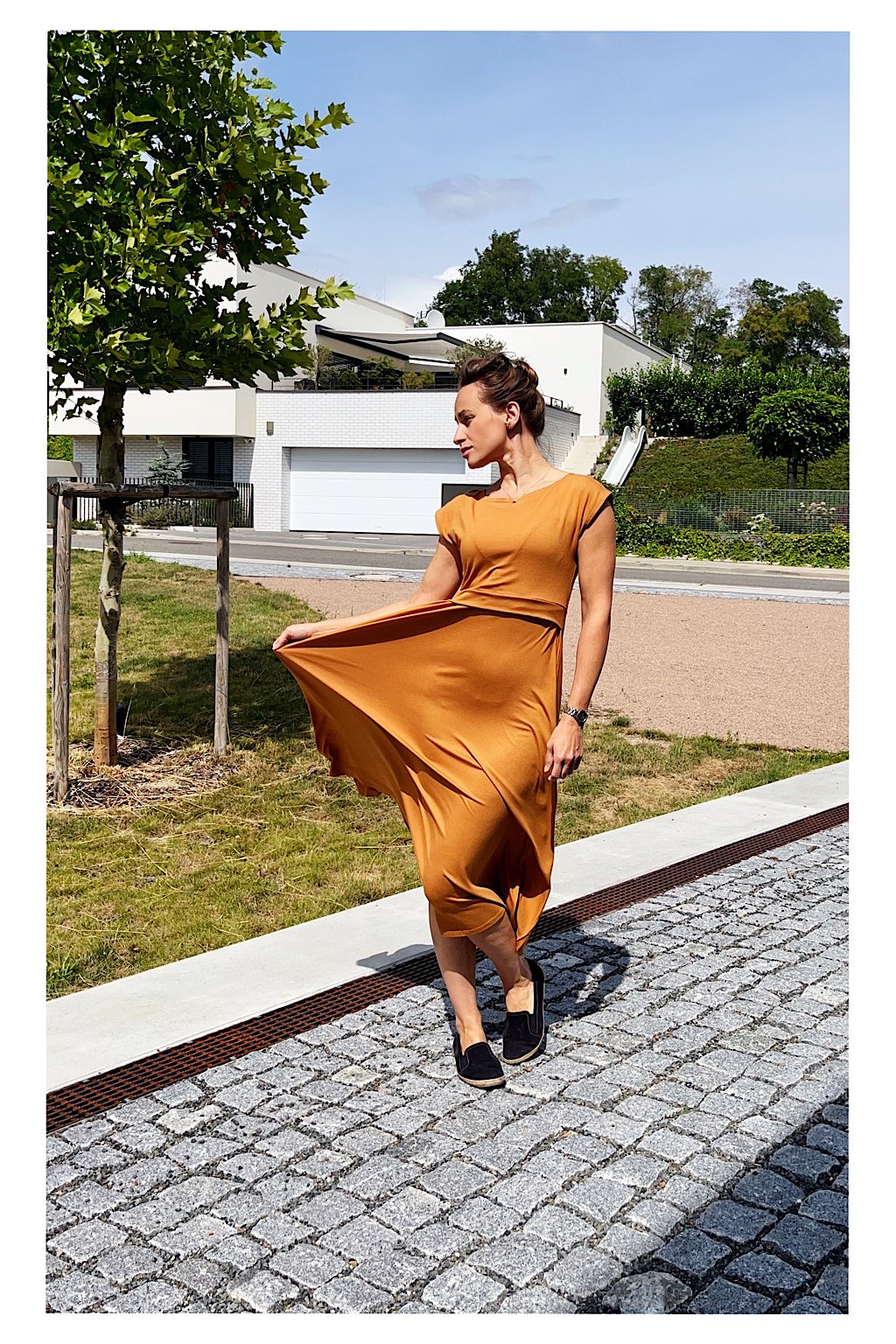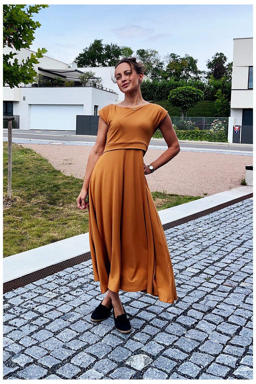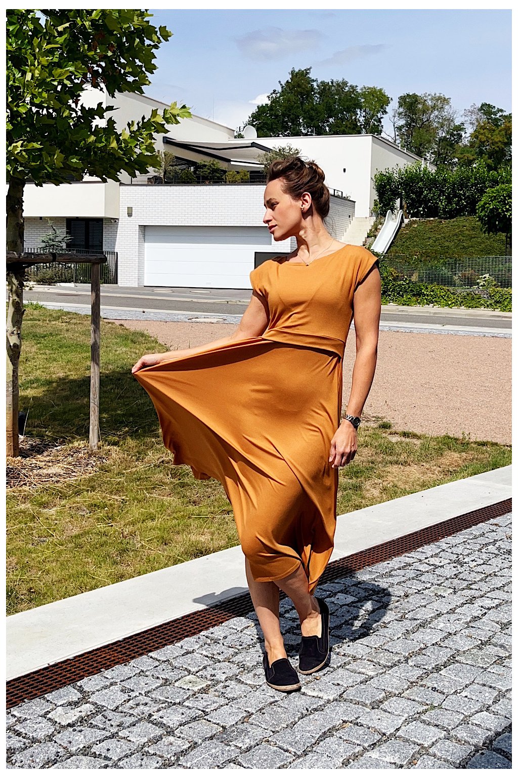 2) Vrchní část pod prsy je zakončena ŠIROKÝM 3CM LEMEM. Ten je nejen praktický pro snadný přístup ke kojení, ale právě díky své šíři krásně vrátí top na obvod hrudníku. Šaty tak dělají krásnou postavu i s poporodním bříškem.