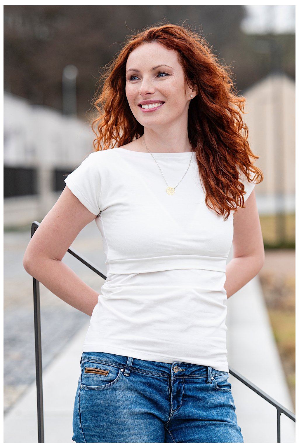 Nadčasové bílé tričko s kimono rukávem, lodičkovým výstřihem a dvojitým předním dílem je navrženo pro Váš nejvyšší komfort při kojení miminka - je hebké, lehce hřejivé, prodyšné a nenáročné na údržbu. Ale především se v něm budete cítit opravdu výjimečně.