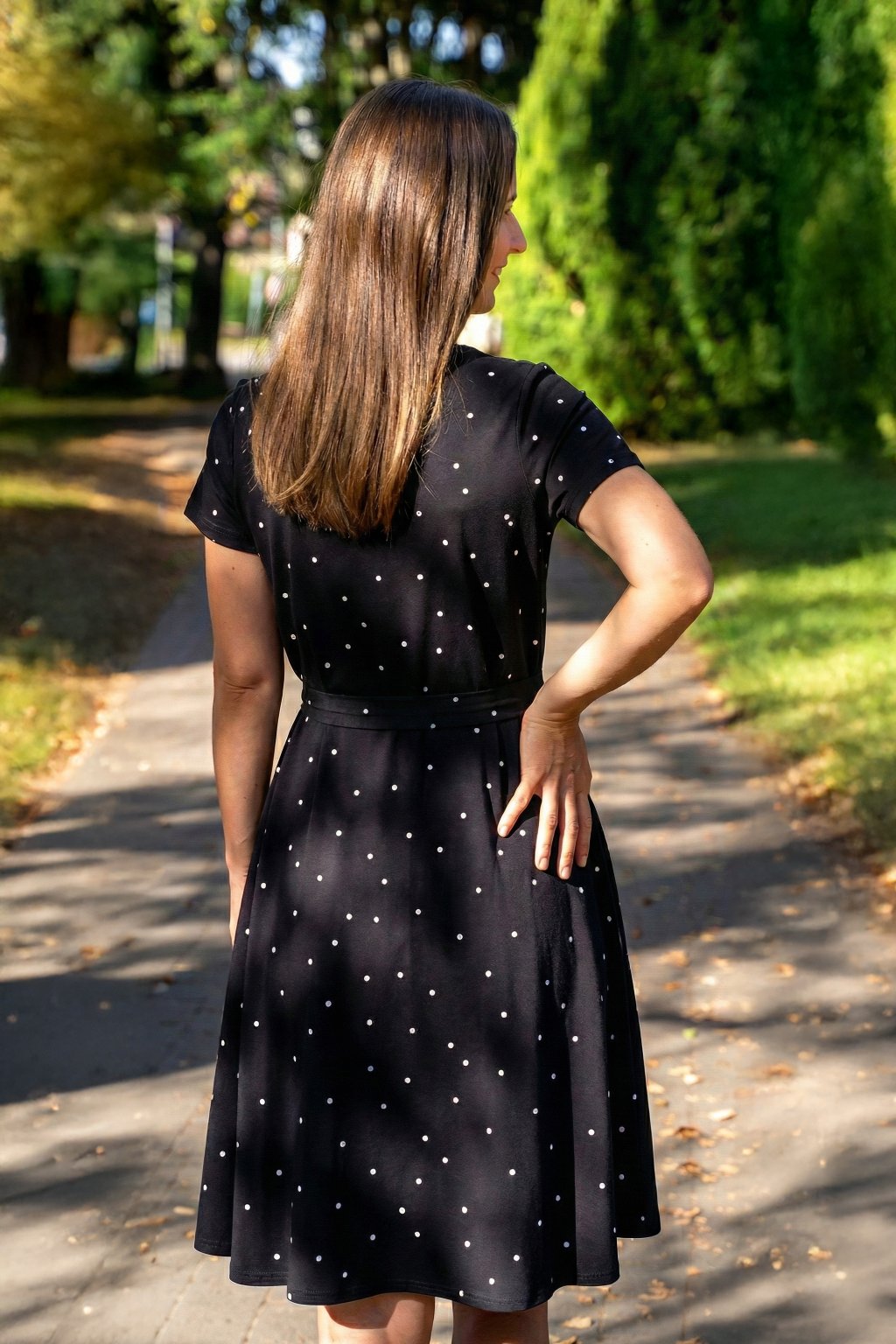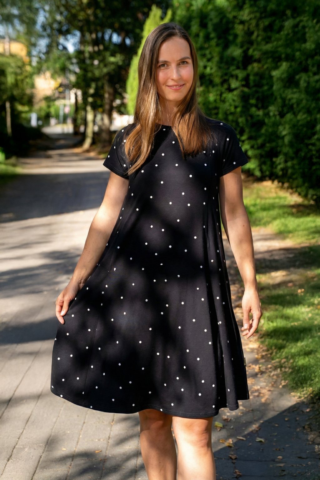 Šaty mají hluboké kapsy skryté ve švech, krátký rukáv a délku v úrovni kolen – pokud jste vyšší, počítejte s délkou nad kolena, nižším ženám bude sukně sahat níže. A protože tento model šijeme tak, aby každý kousek seděl hned dvěma velikostem (viz velikostní tabulka), nemusíte si dělat hlavu s každou změnou na těle.