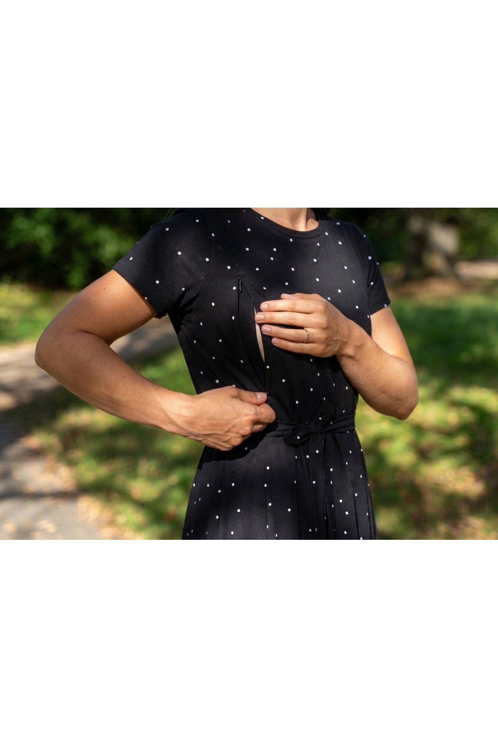 Bavlněné kojicí šaty se skrytými zipy – černé s puntíky (zkušební vzorek)