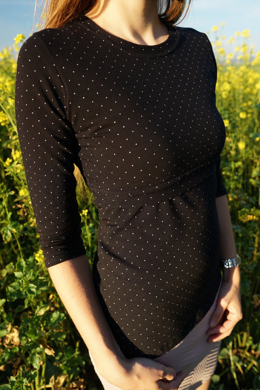 Triko má 3/4 rukáv a nenajdete u něj boční řasení pro těhotenské bříško, jež útlým pasům plandá a špatně sedí, ale naopak projmutý střih, který zaručí dokonalé přilnutí k tělu.