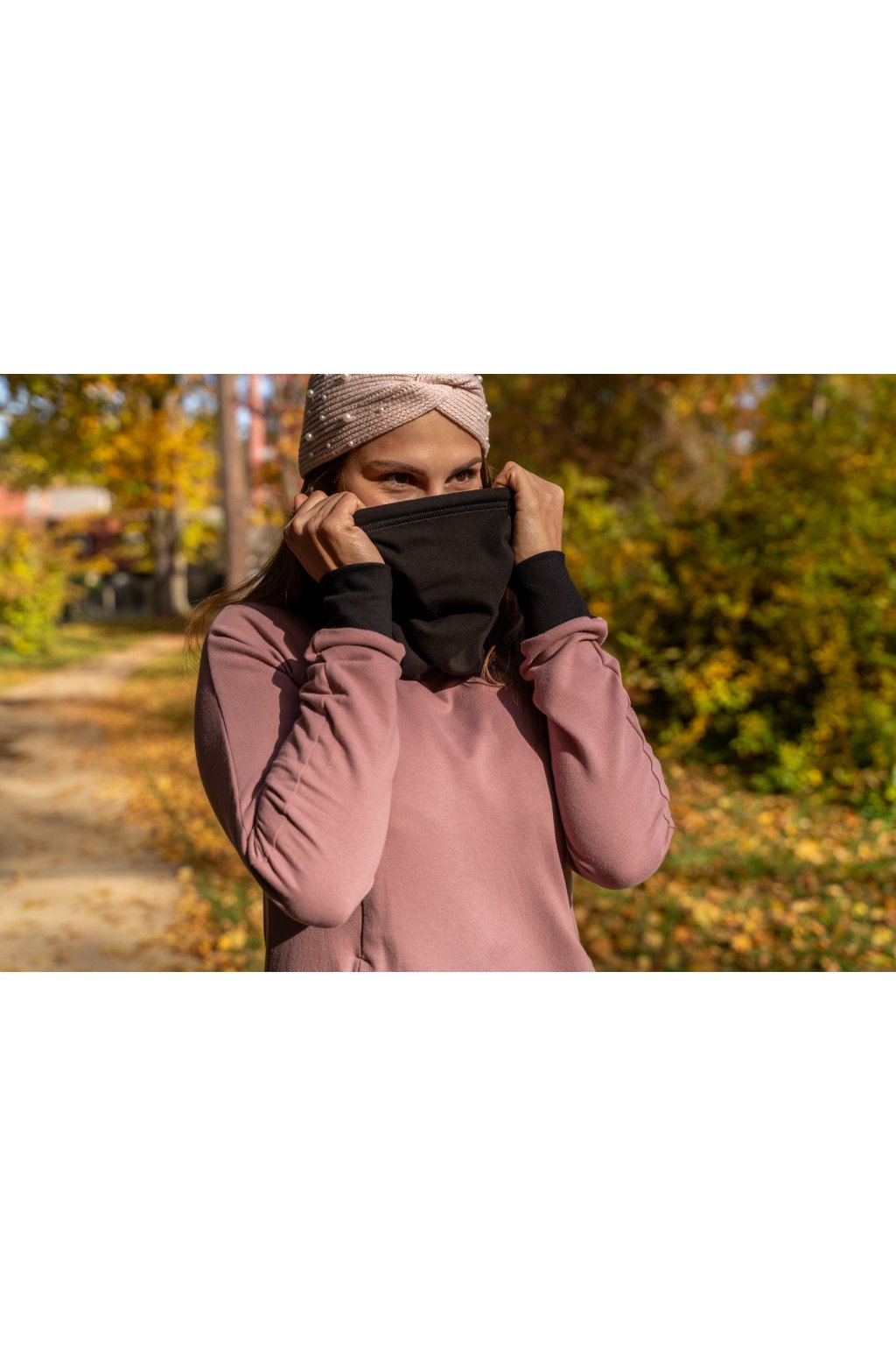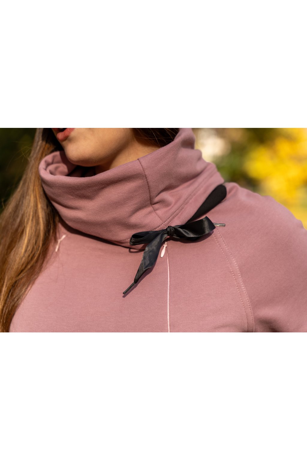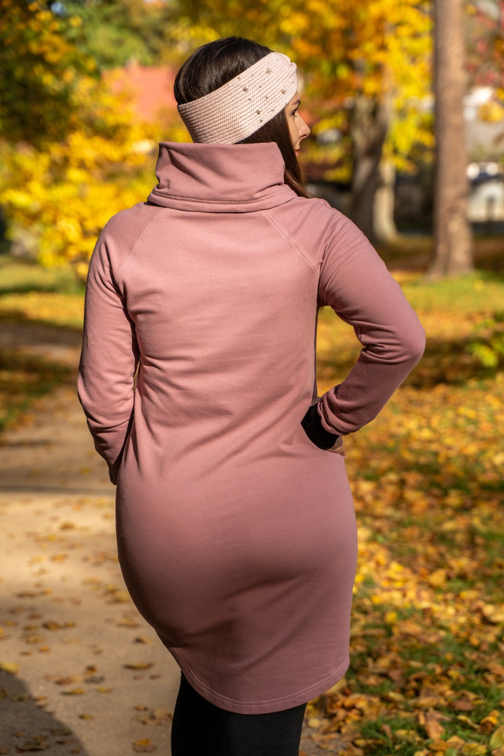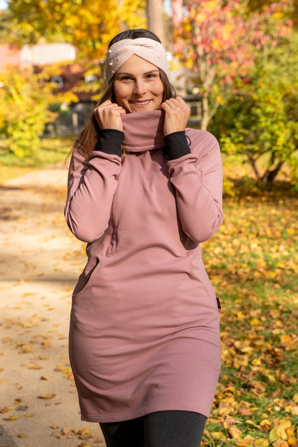 Na tyto šaty jsme použili jemnou počesanou BIO teplákovinu, která se výborně hodí pro celoroční oblečení. Šaty mají praktický límec, který pod bundou nepřekáží a zároveň výborně ochrání váš krk před nastydnutím. Studený vítr nebude mít šanci. Široký límec si můžete zvednout až k bradě a stáhnout podle potřeby pomocí elegantní stuhy uvázané na mašličku, která spolu s límcem zvýrazní vaši ženskost, půvab a celkově vám dodá moderní, atraktivní vzhled.