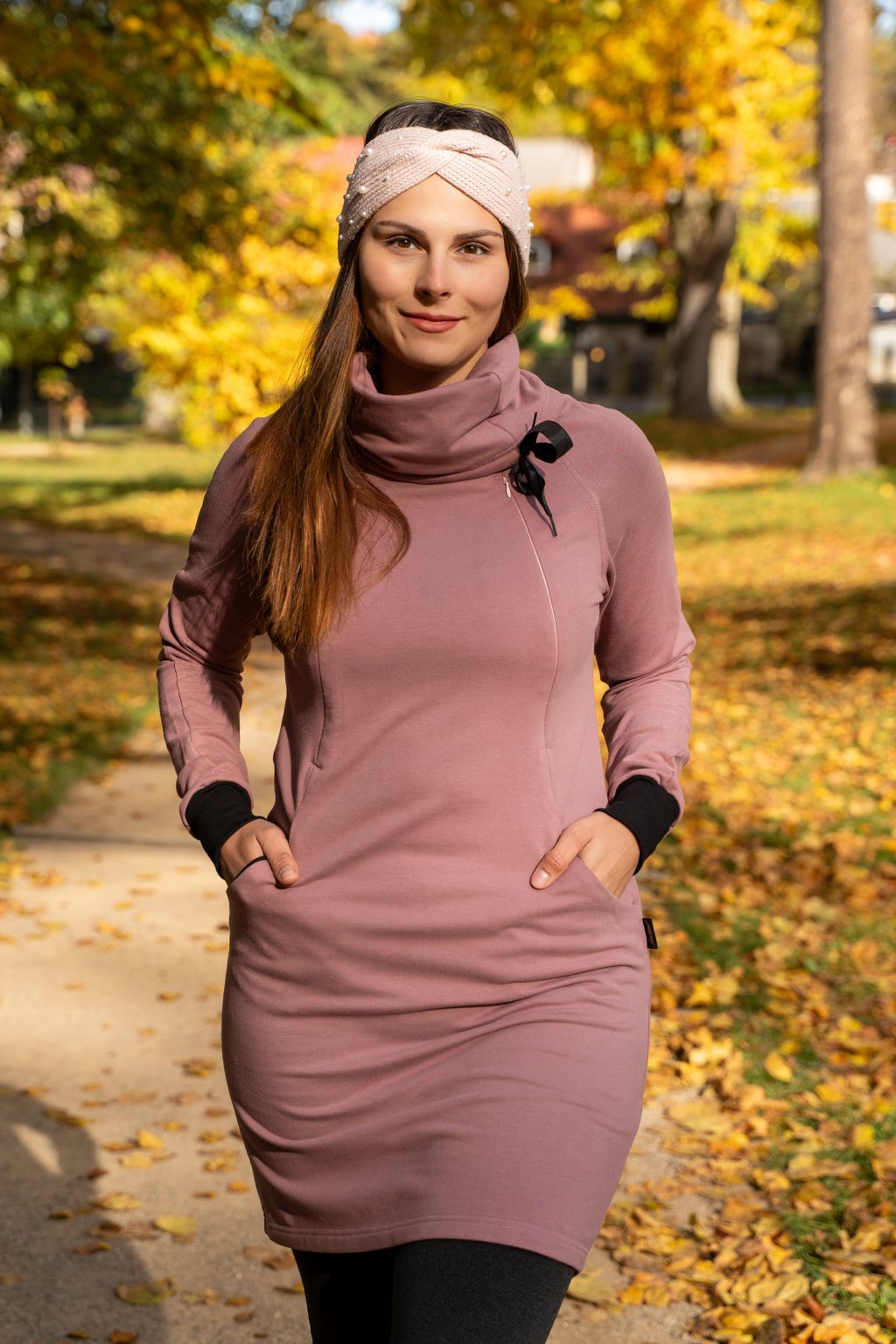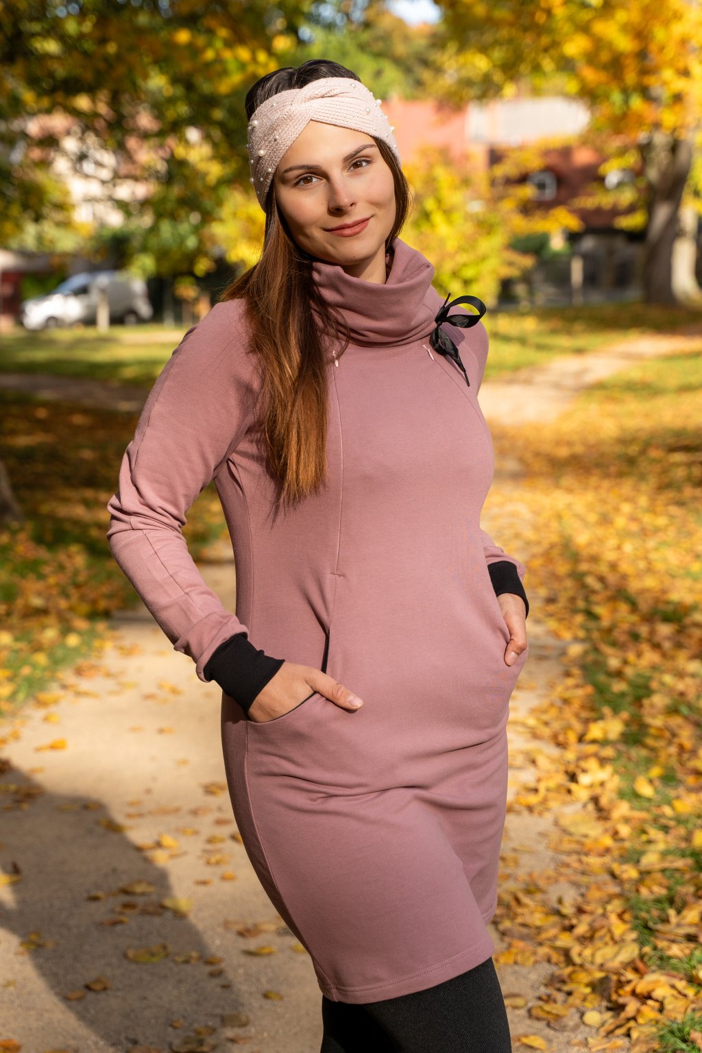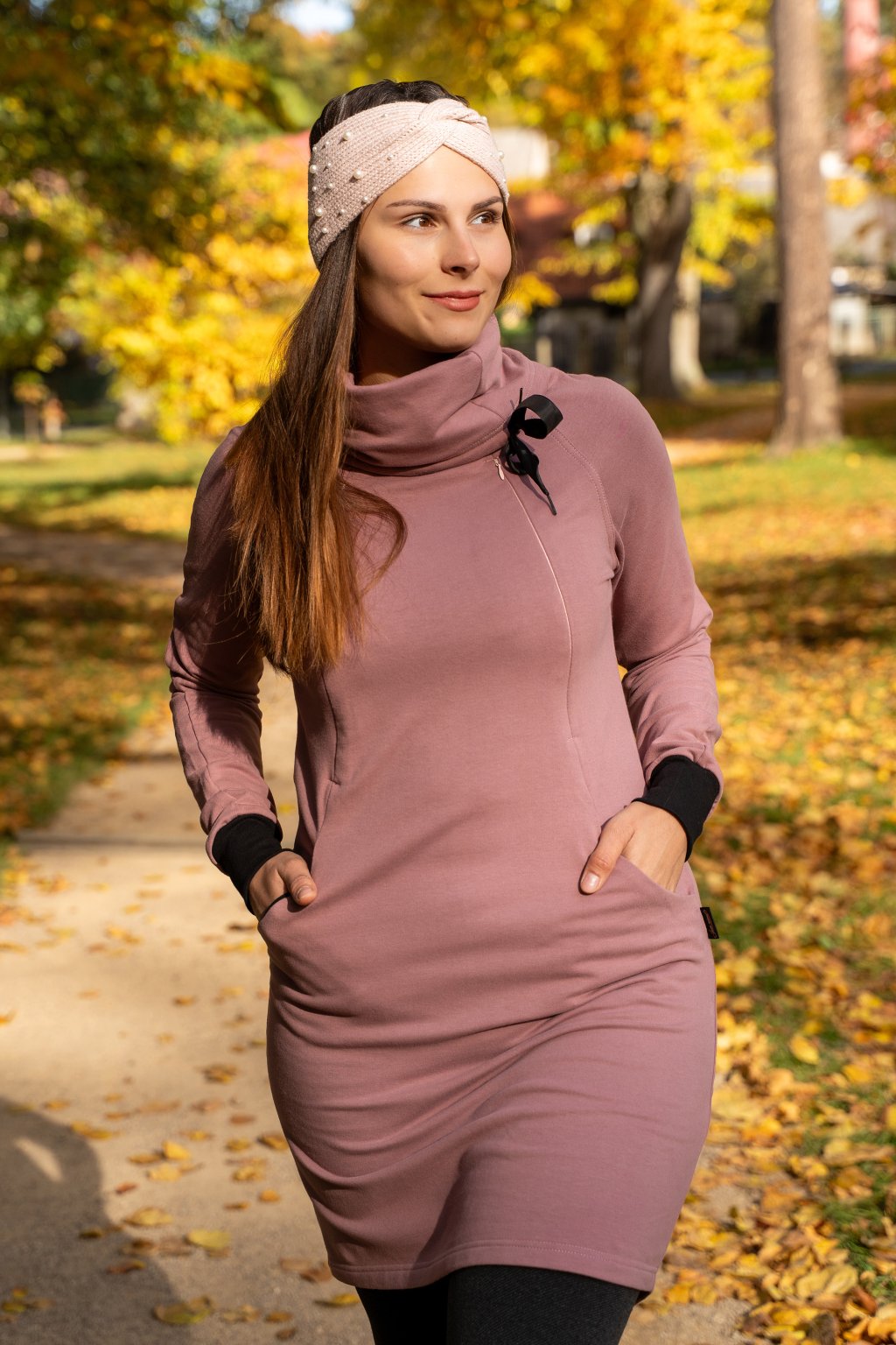 BIO kojicí mikinové šaty se skrytými zipy – starorůžové