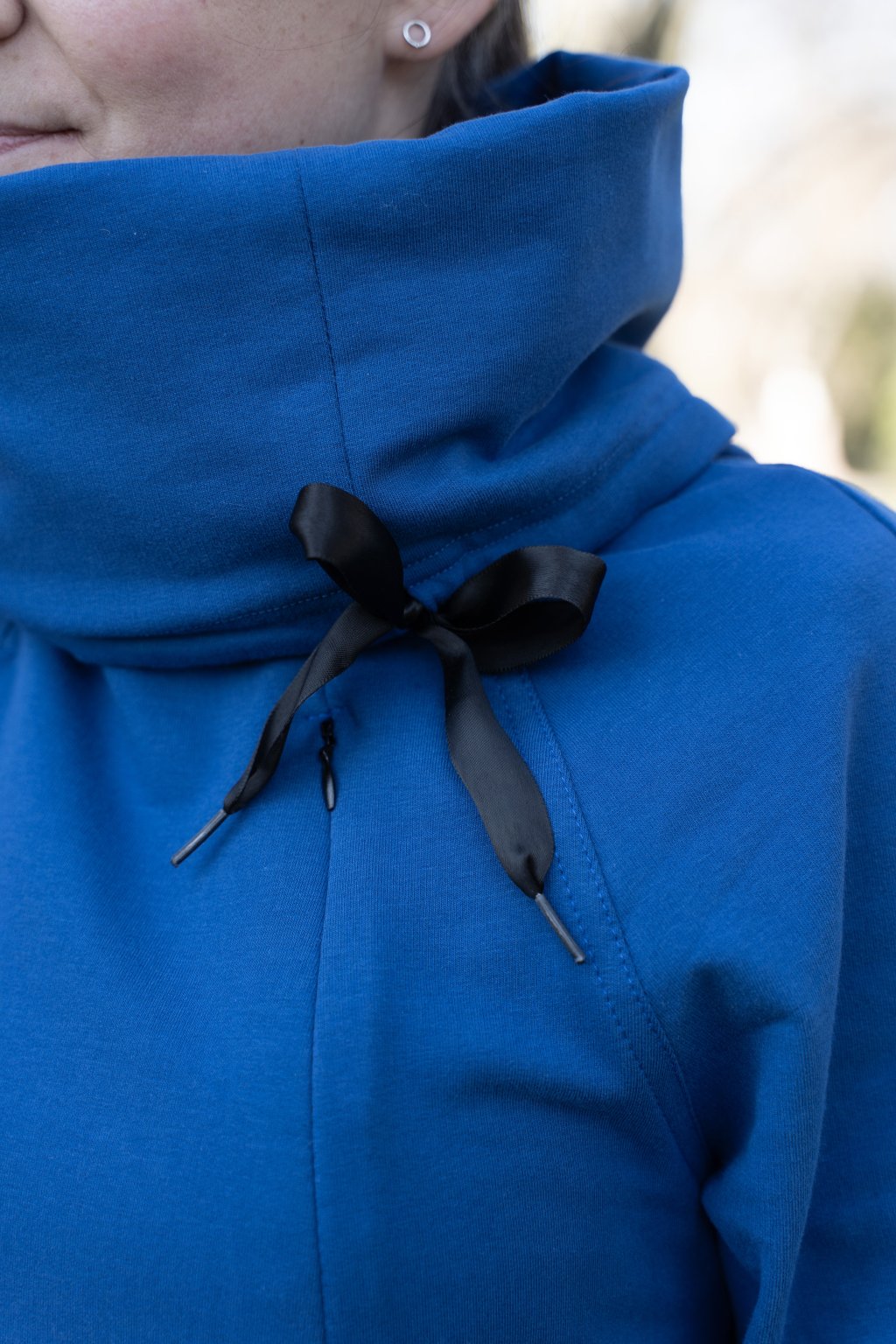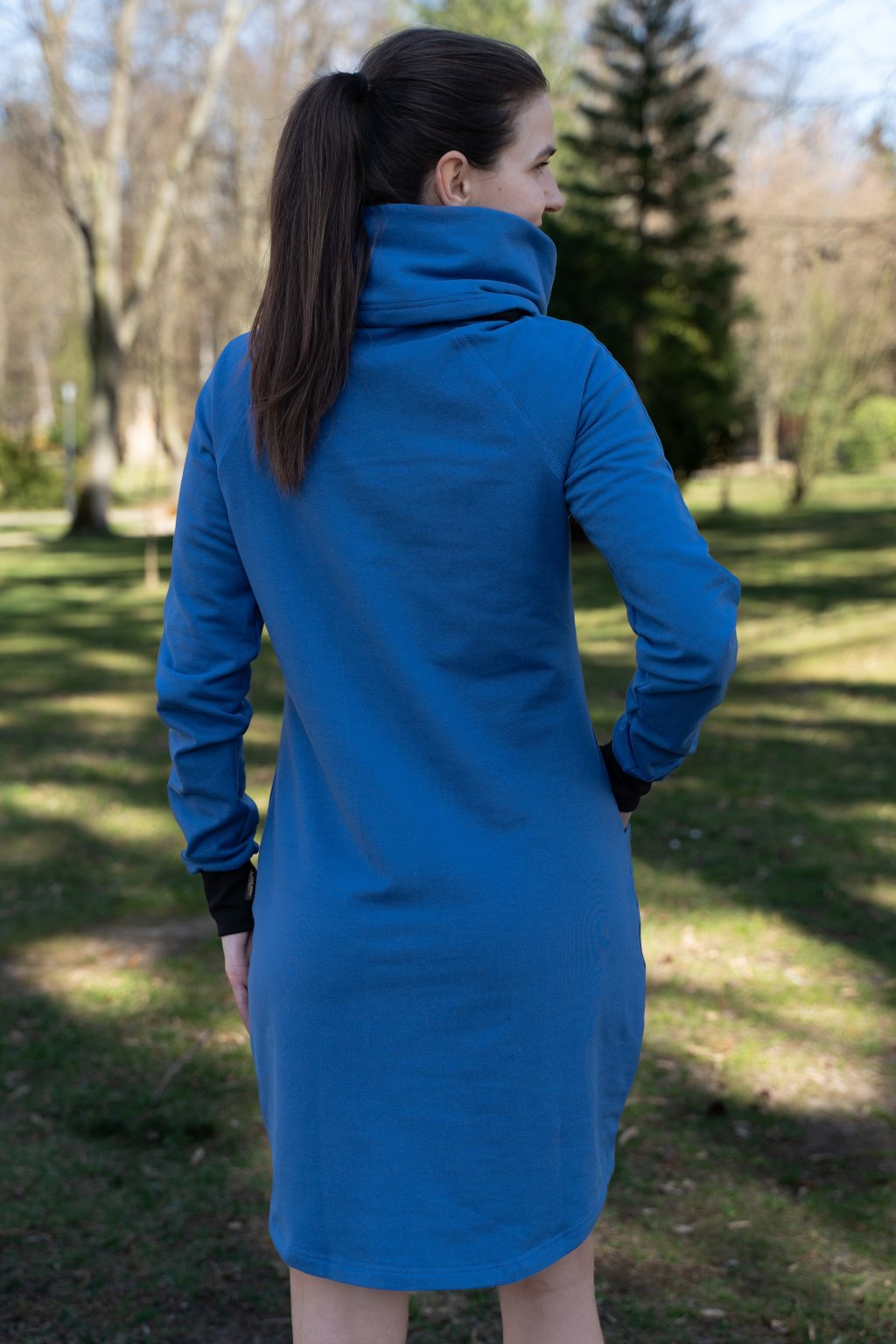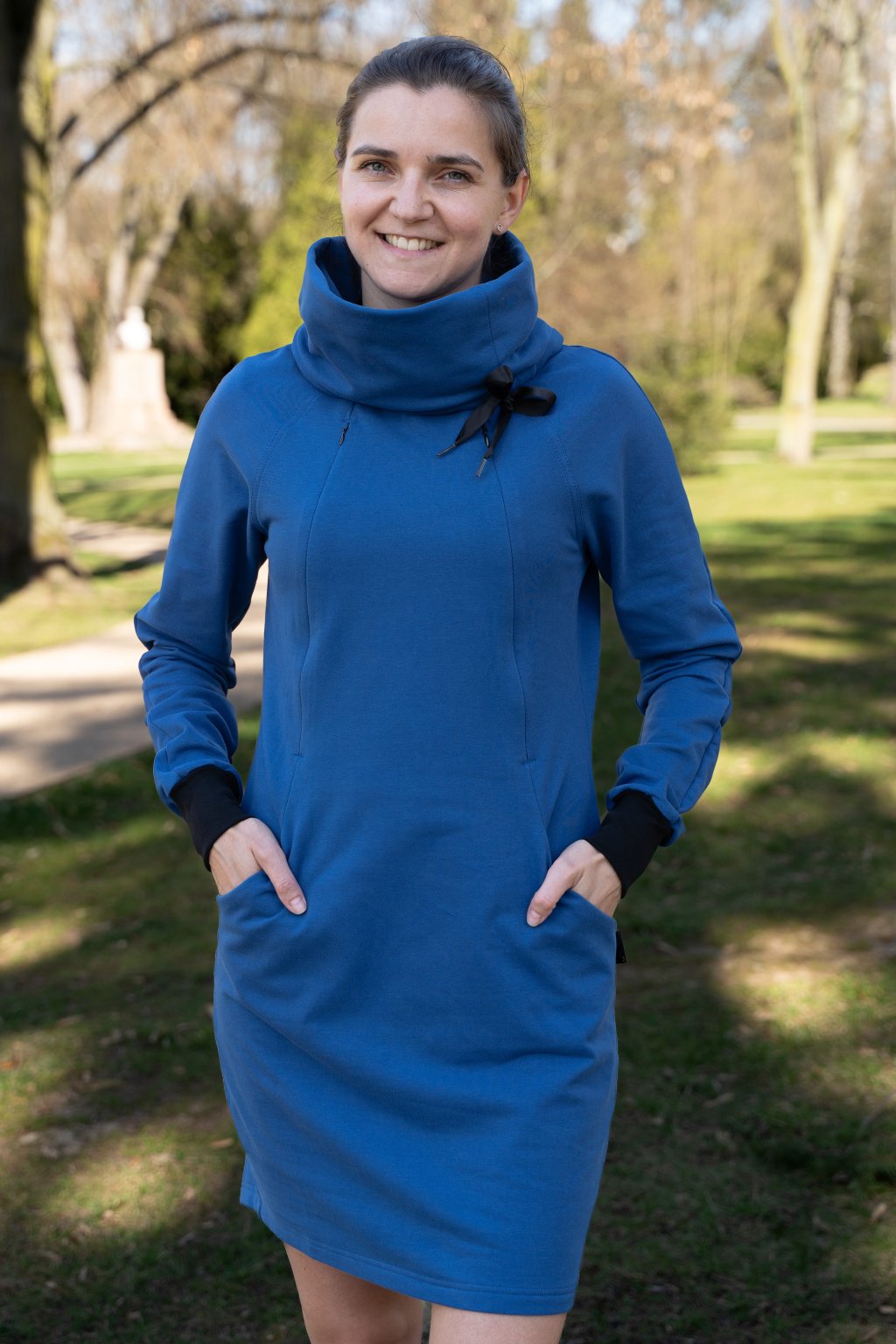 Na tyto šaty jsme použili jemnou počesanou BIO teplákovinu, která se výborně hodí pro celoroční oblečení. Šaty mají praktický límec, který pod bundou nepřekáží a zároveň výborně ochrání váš krk před nastydnutím. Studený vítr nebude mít šanci. Široký límec si můžete zvednout až k bradě a stáhnout podle potřeby pomocí elegantní stuhy uvázané na mašličku, která spolu s límcem zvýrazní vaši ženskost, půvab a celkově vám dodá moderní, atraktivní vzhled.