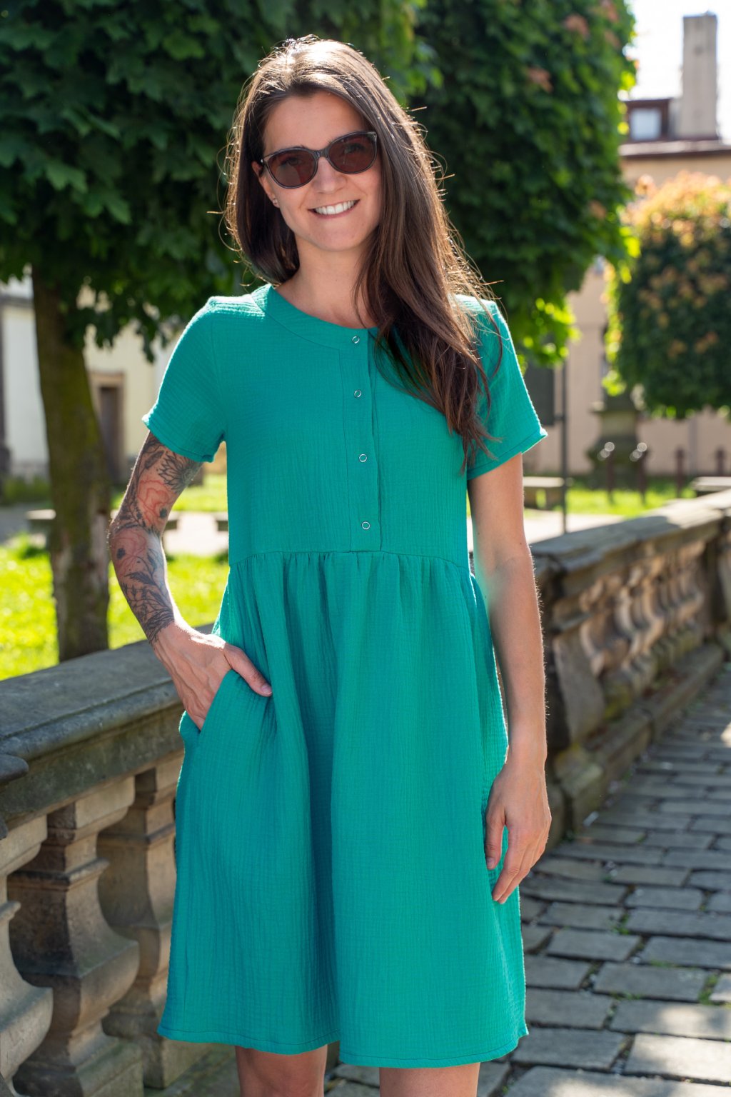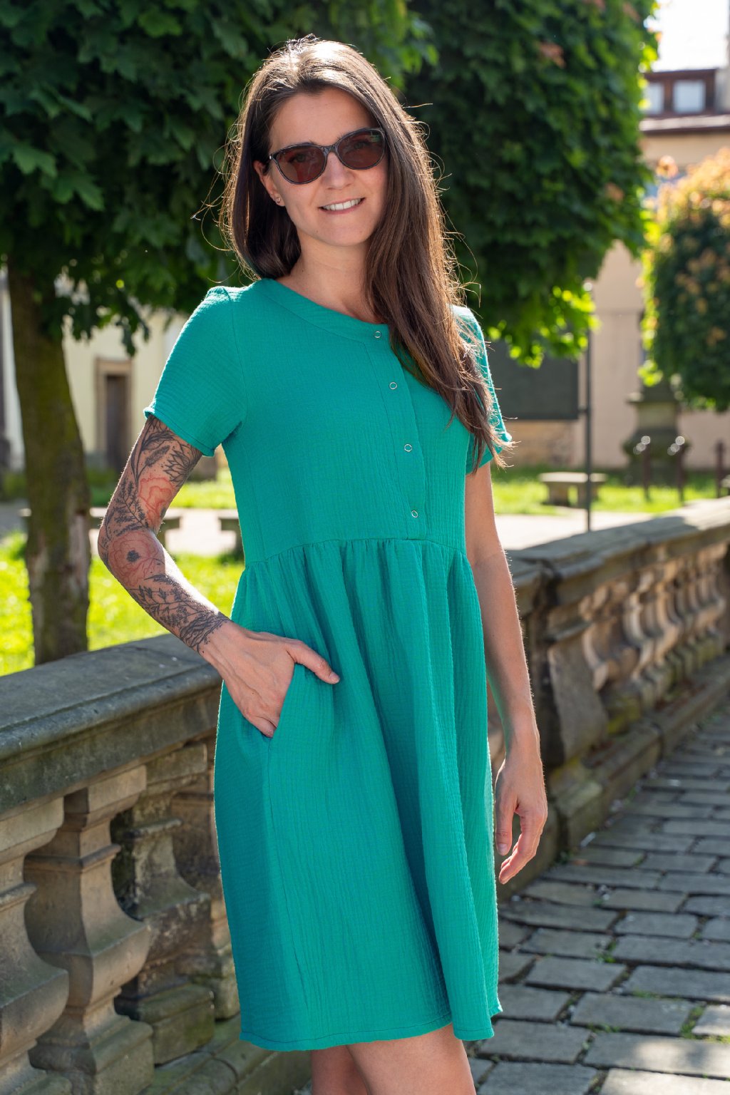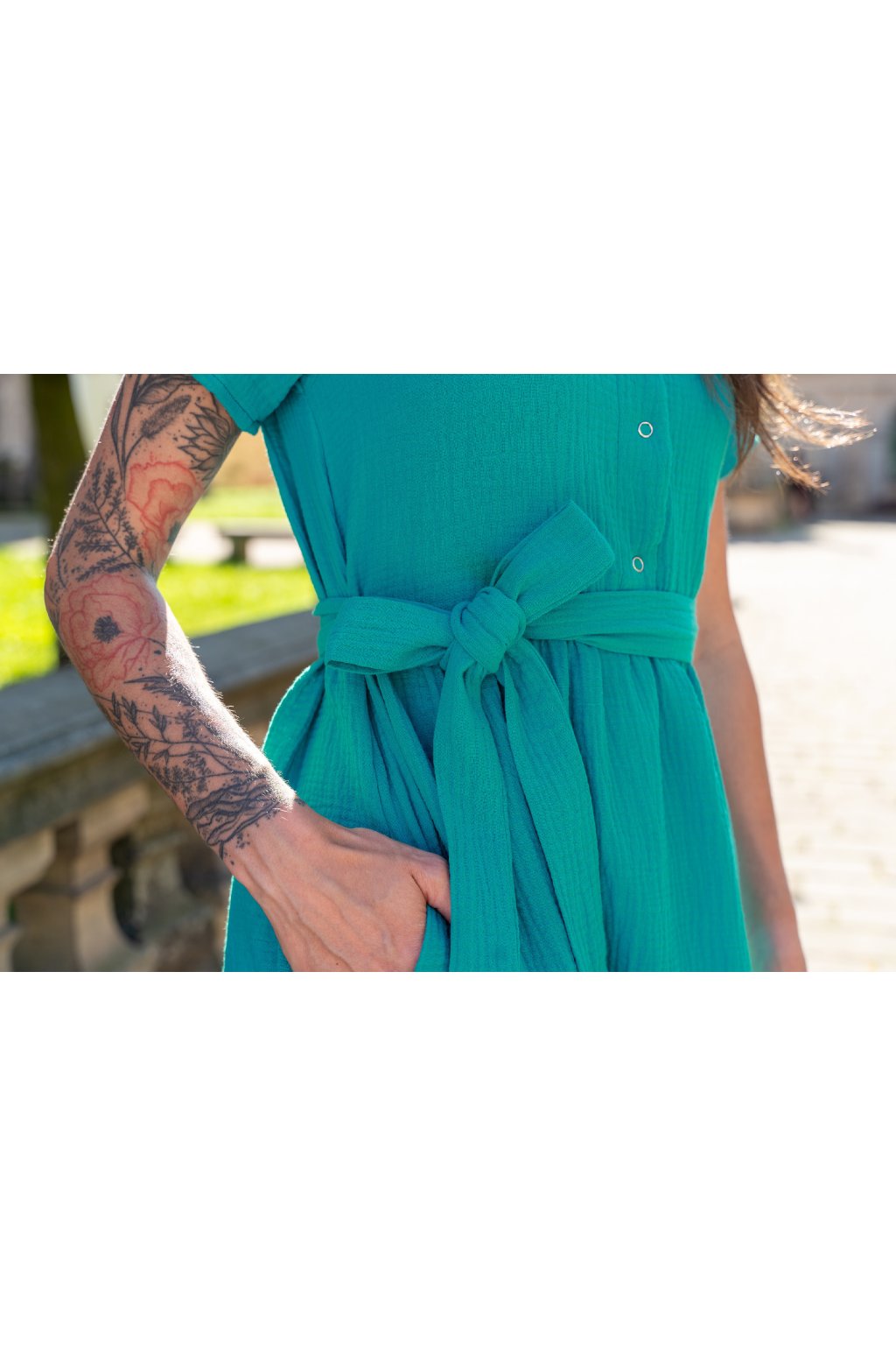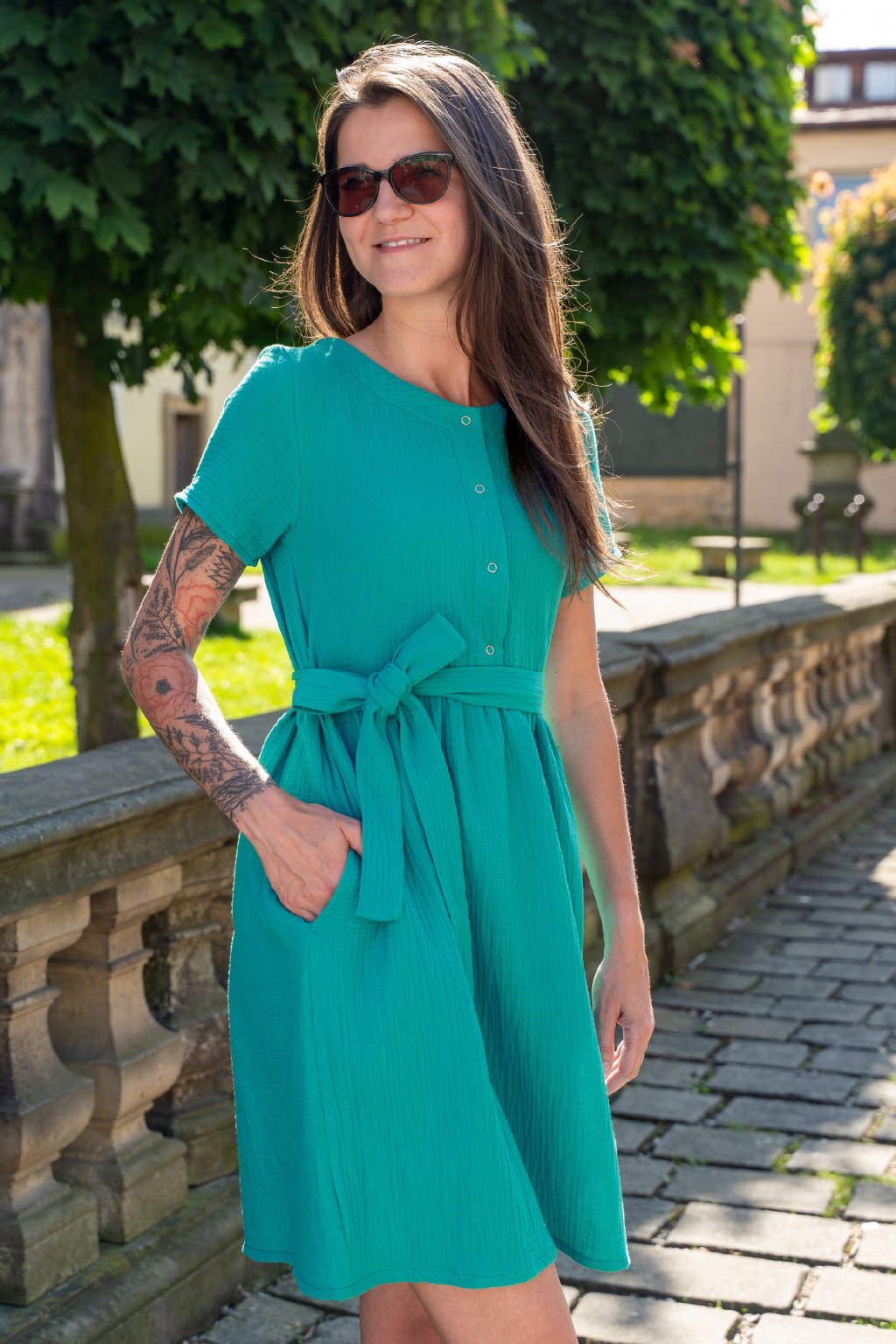 BIO mušelínové kojicí šaty s mašlí Tmavý tyrkys