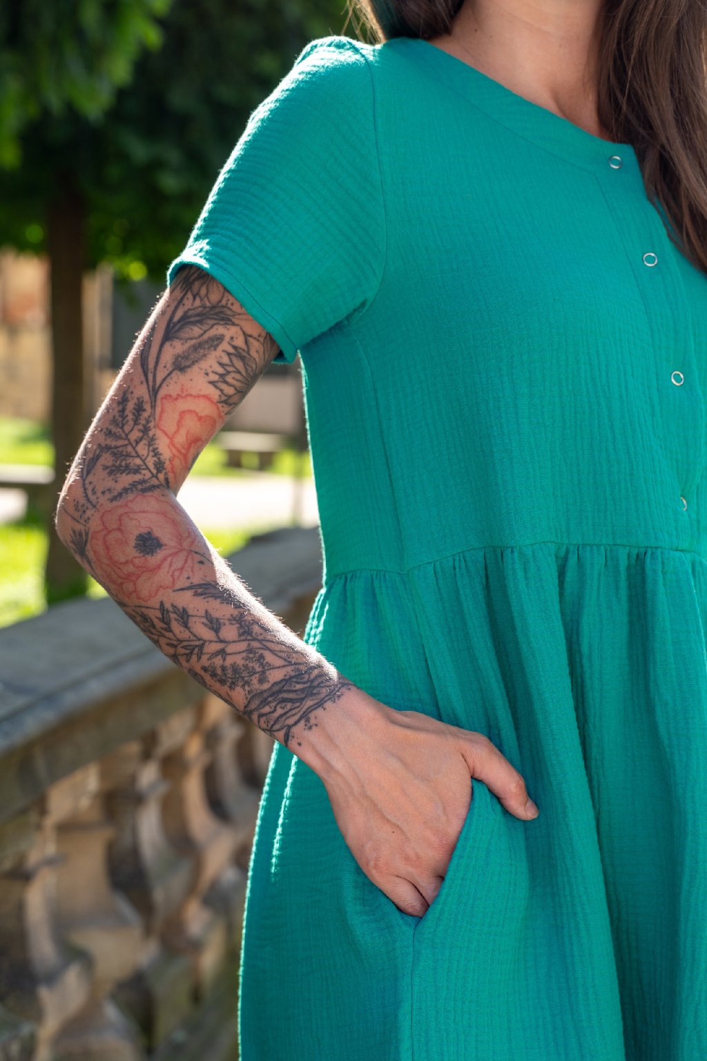 U těchto mušelínových šatů oceníte i praktické kapsy, do kterých schováte různé drobnosti.