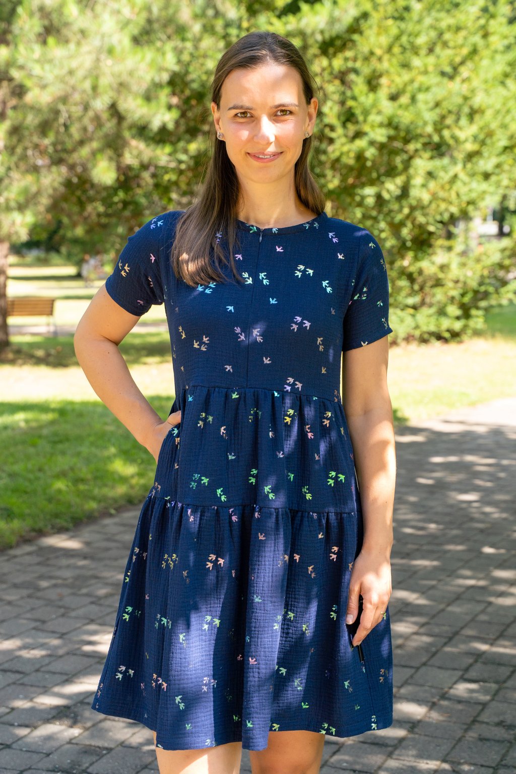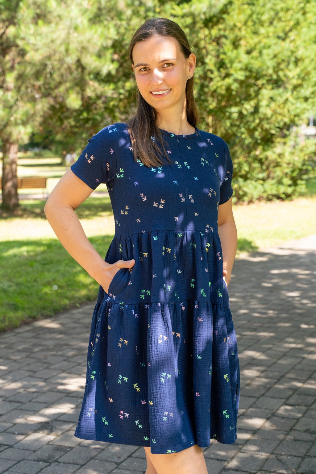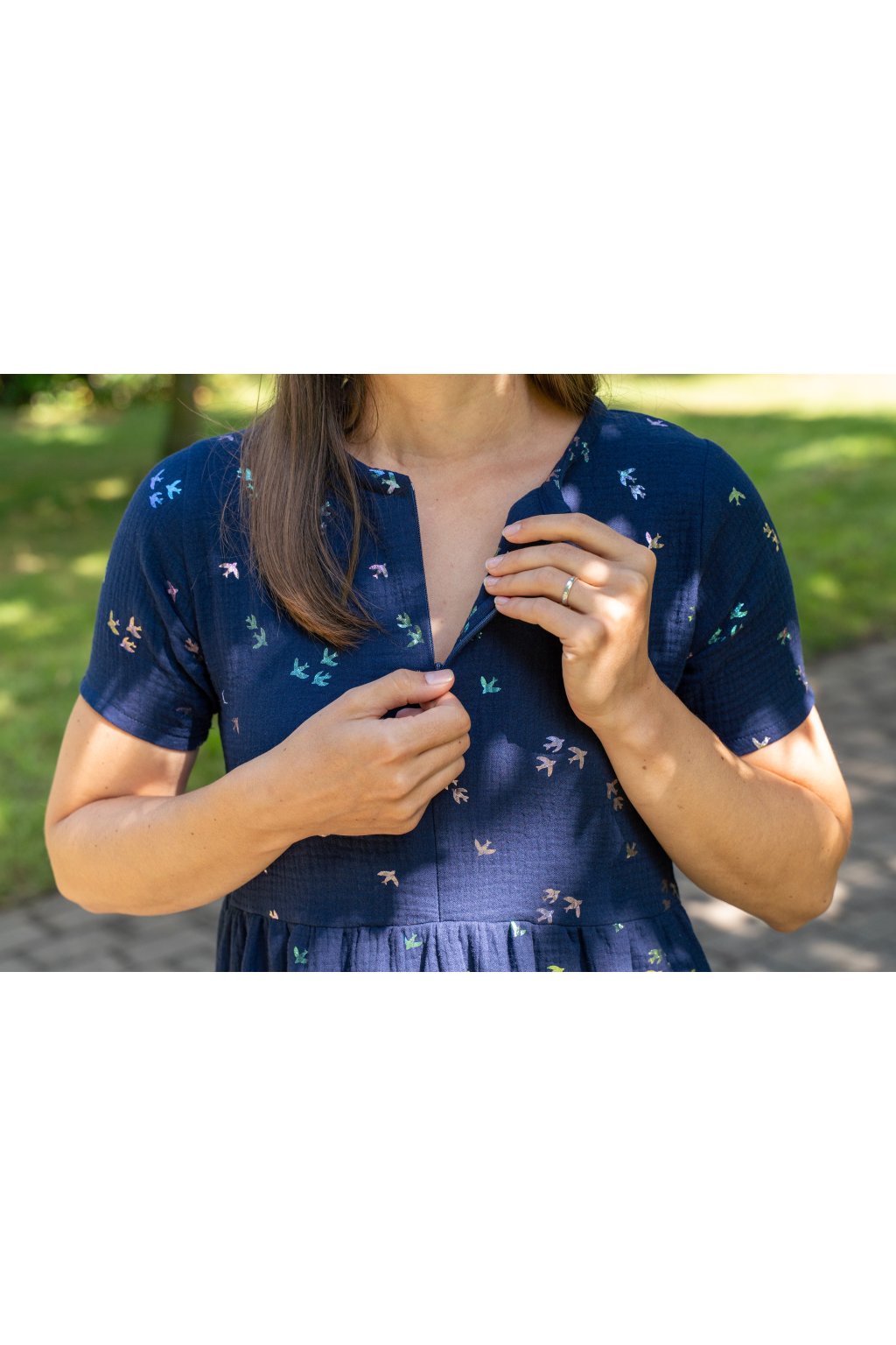 BIO mušelínové kojicí šaty se skrytým zipem – Tmavě modré s vlaštovkami