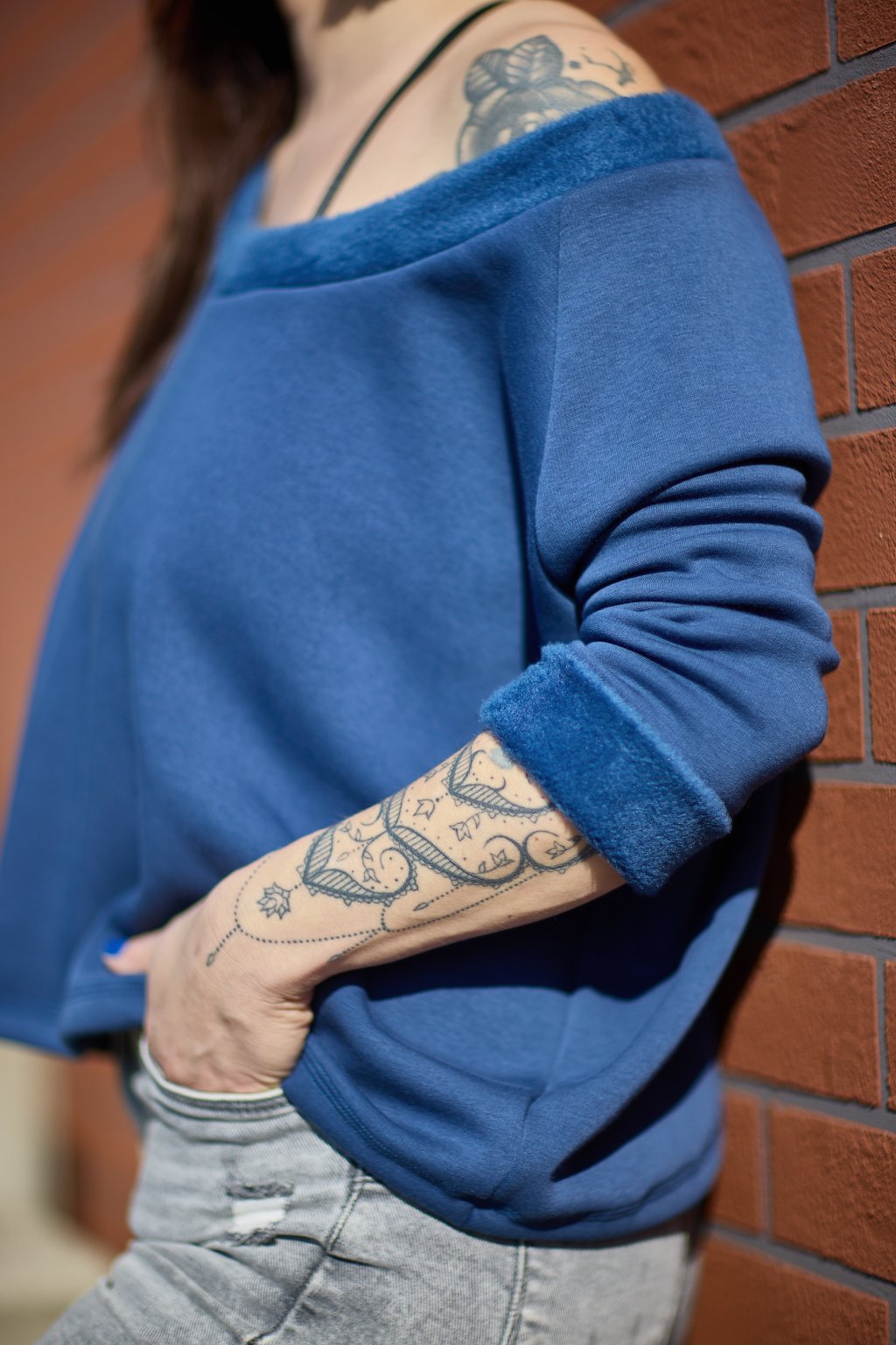 Krátká mikina se spadlým ramenem. Material je modrý warmkeeper s elastanem. Rukávy jsou na ohrnutí.