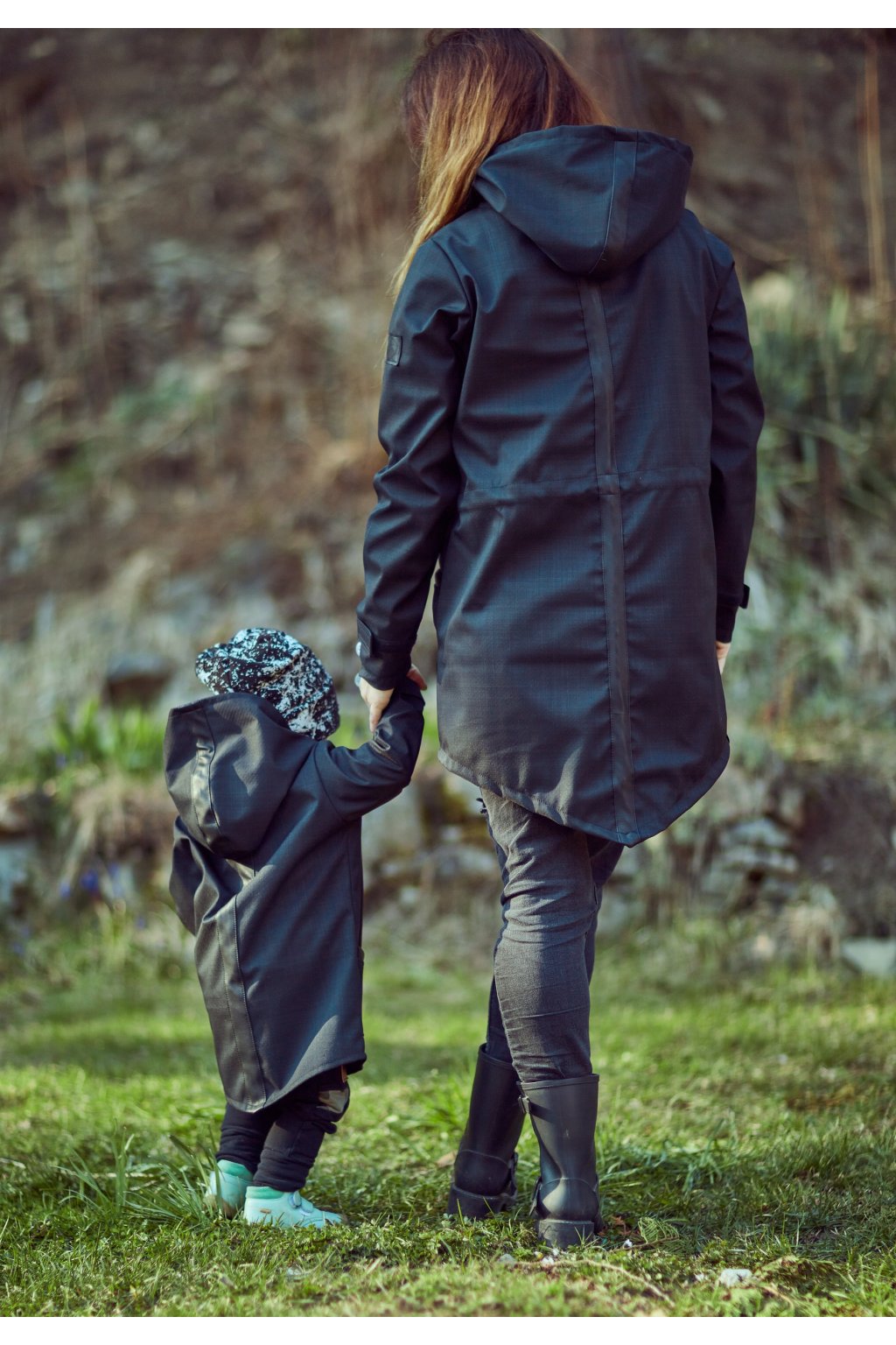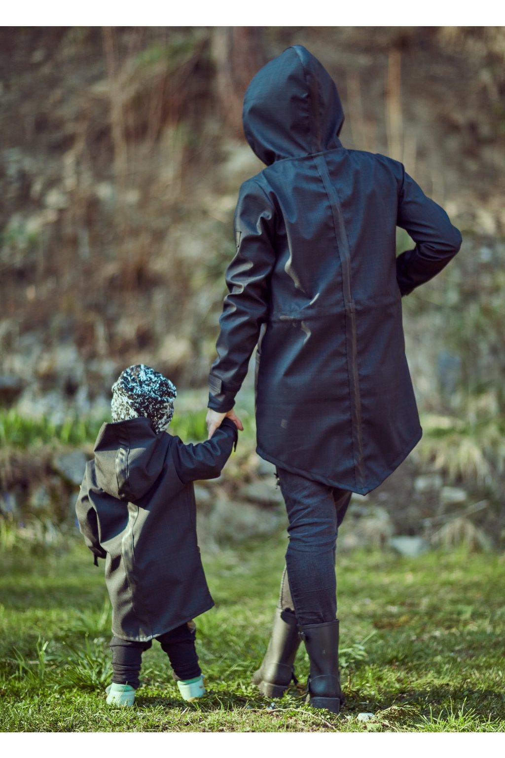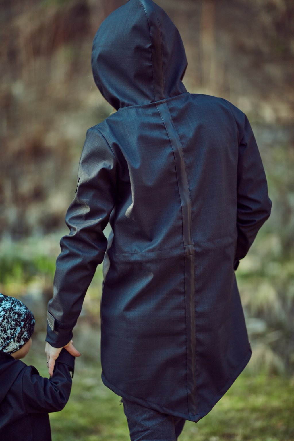 Vpředu je na zip a s kapsami, v pase je tunýlek se šňůrkou. Barva je černá se vzorkem doplněná černou koženkou. Pruhz černé koženky vede přes celá záda a kapuci. Parka se dá nosit na jaře, na podzim, s teplejšími vrstvami i v zimě.