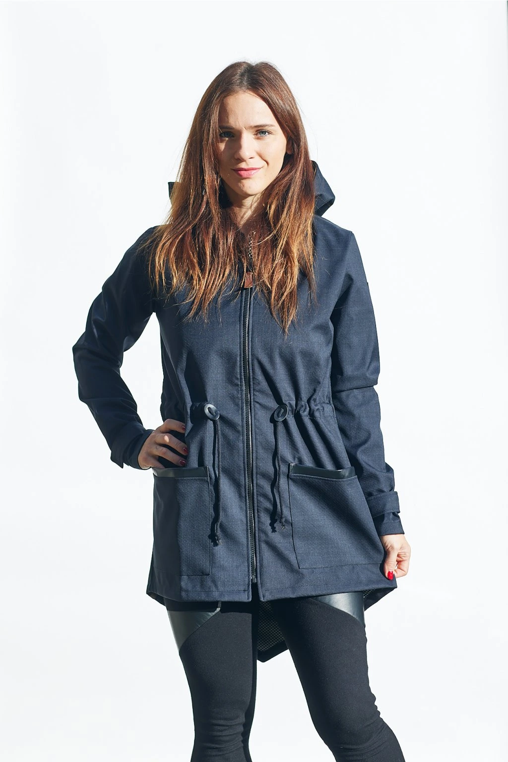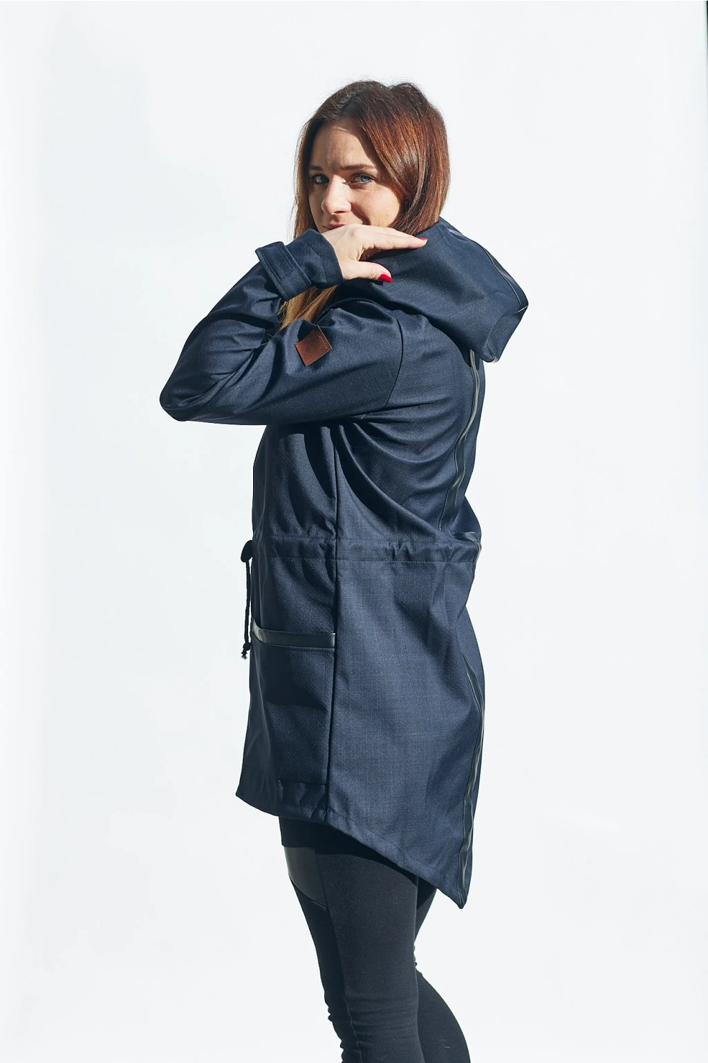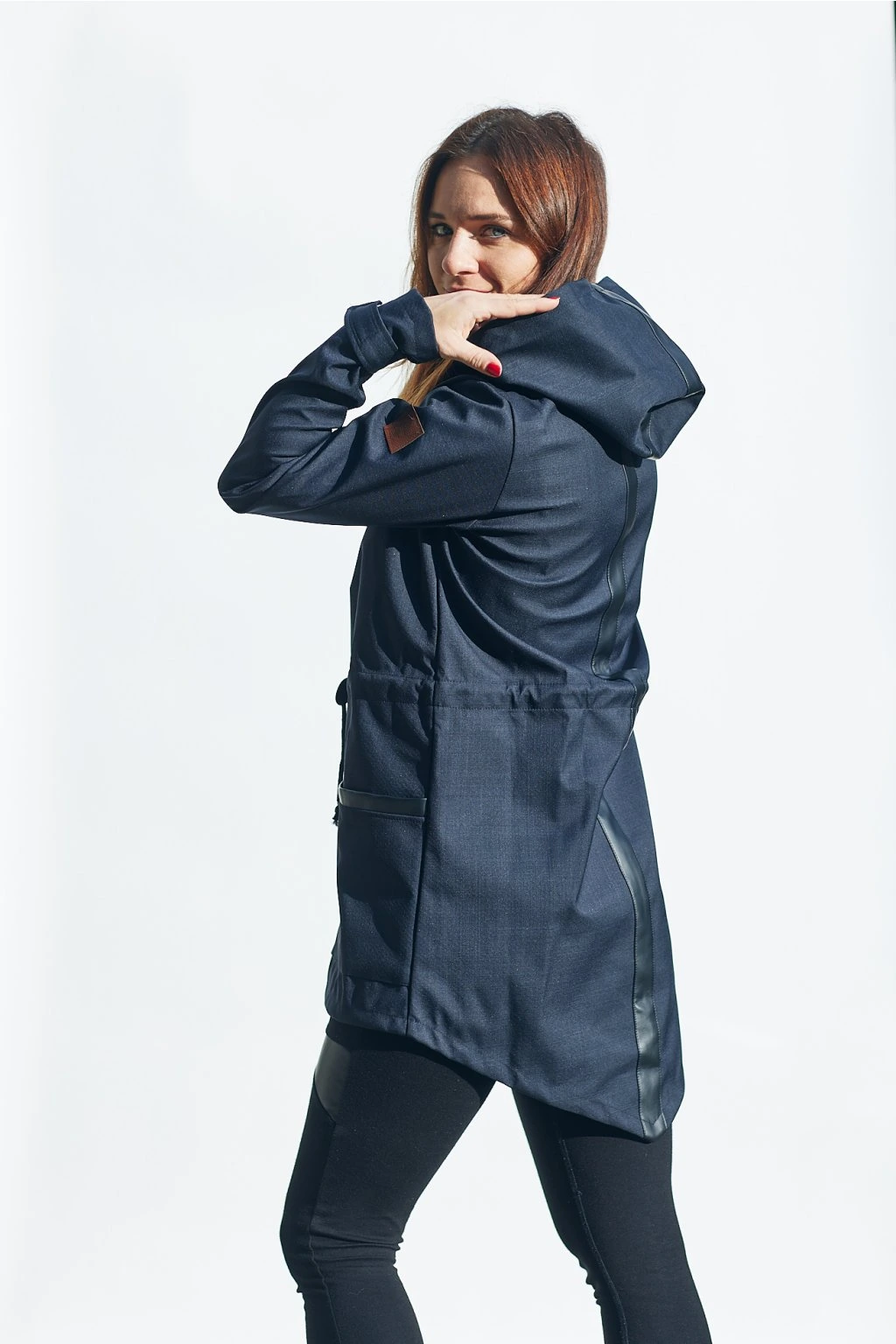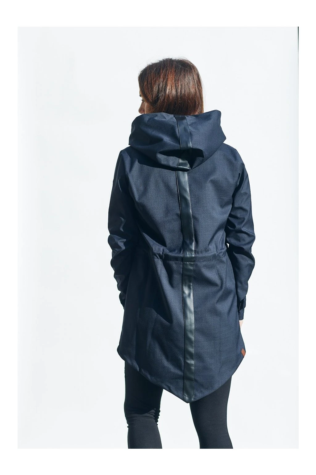 Vpředu je na zip a s kapsami, v pase je tunýlek se šňůrkou. Barva je černá se vzorkem doplněná černou koženkou. Pruhz černé koženky vede přes celá záda a kapuci. Parka se dá nosit na jaře, na podzim, s teplejšími vrstvami i v zimě.