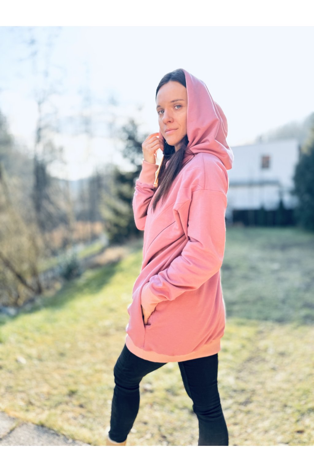 Stylová delší mikina má volnější střih a je ušitá z růžové silnější, počesané teplákoviny. Rukávy a spodek jsou do žebrovaných nápletů. Mikina má na předním díle šipky a u té úplně spodní je všitý skrytý zip, který rozepnete, a můžete pohodlně nakojit. Mikina má kapuci, ta je vpředu překřížená. V postranních švech jsou všité kapsy. Mikina má pohodlný střih i materiál.
