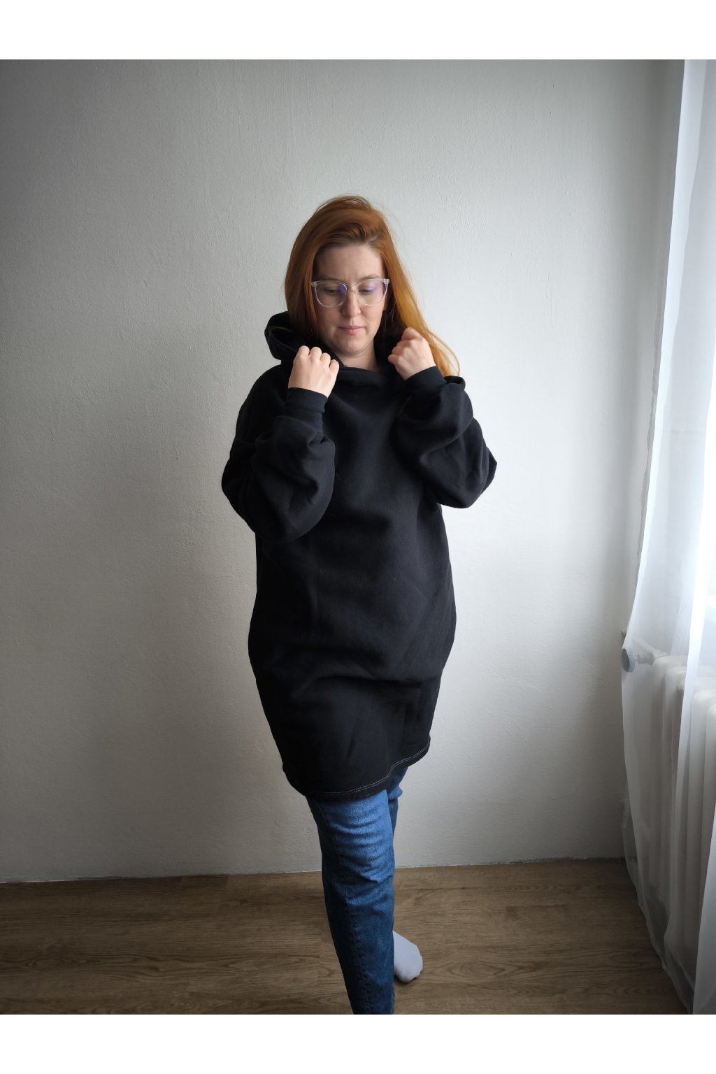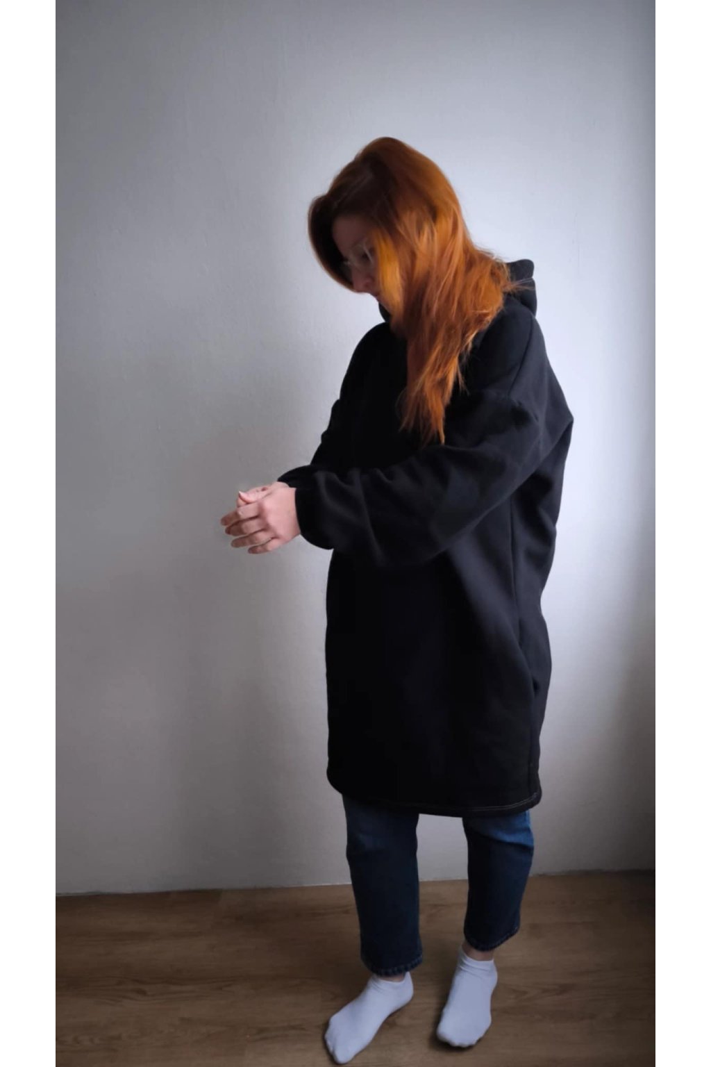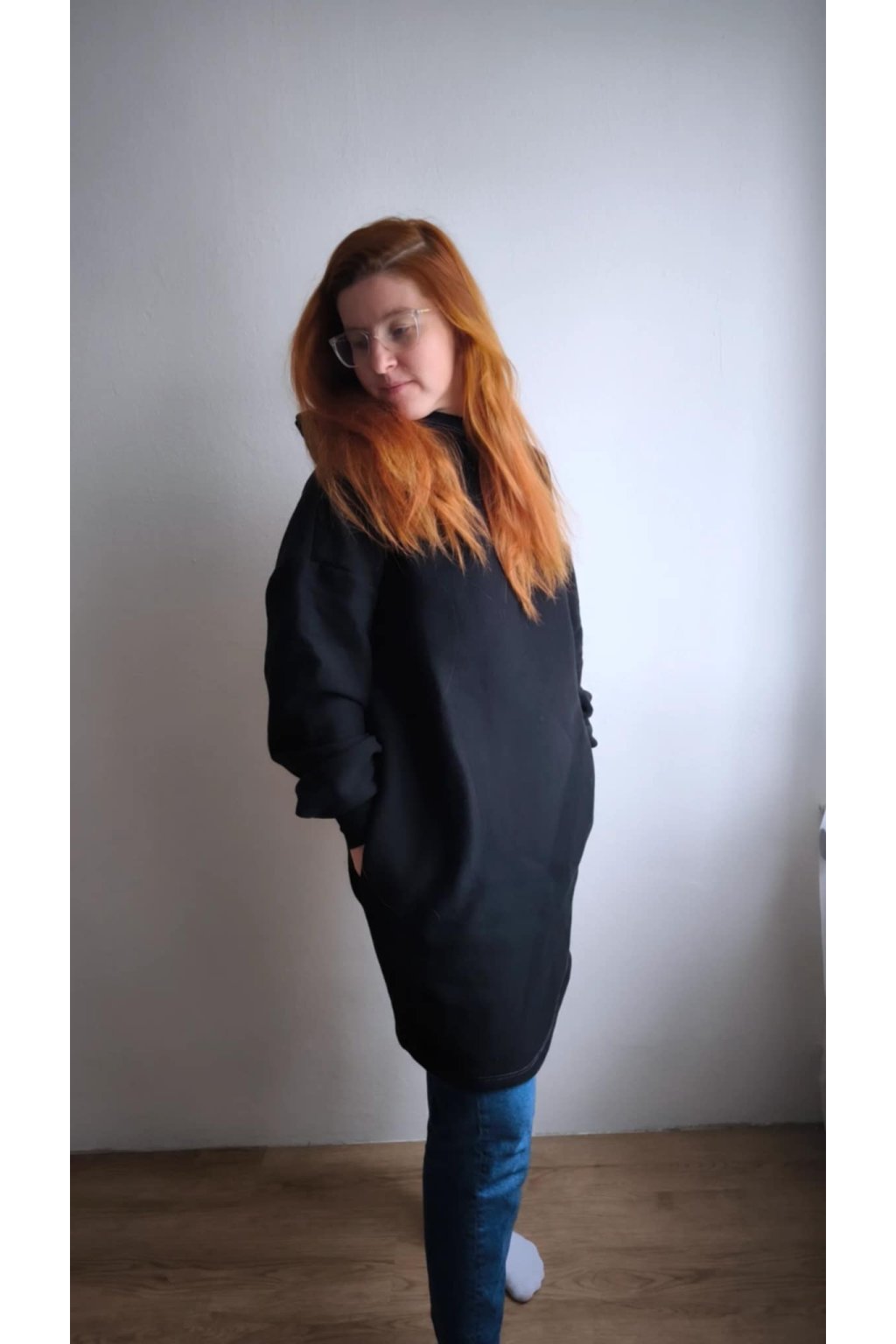Pro dokonalost této mikiny je možné na přání ušít i skryté kapsy na bocích u varianty mikiny ke kolenům.