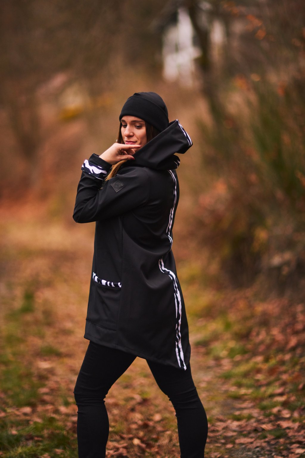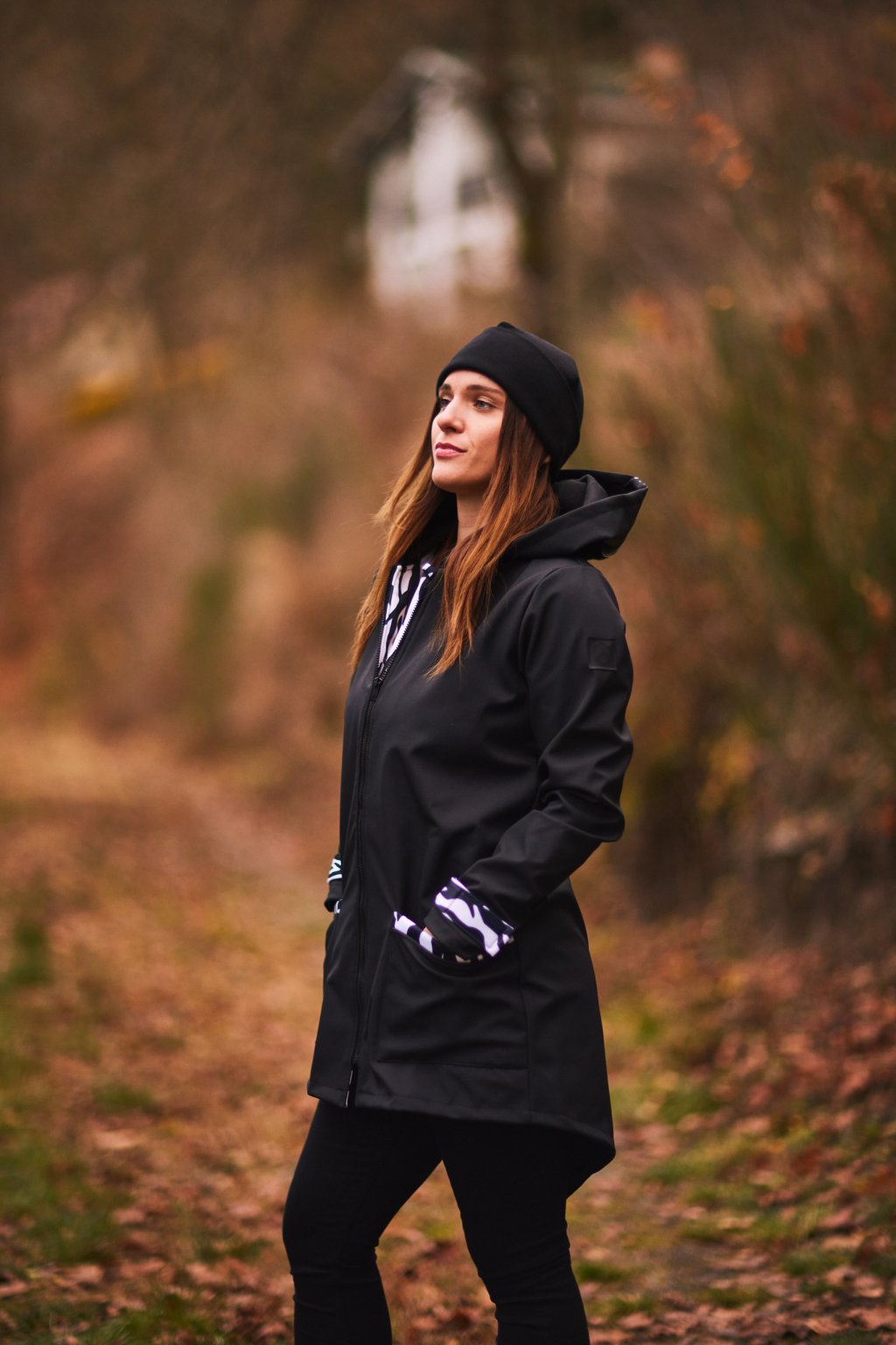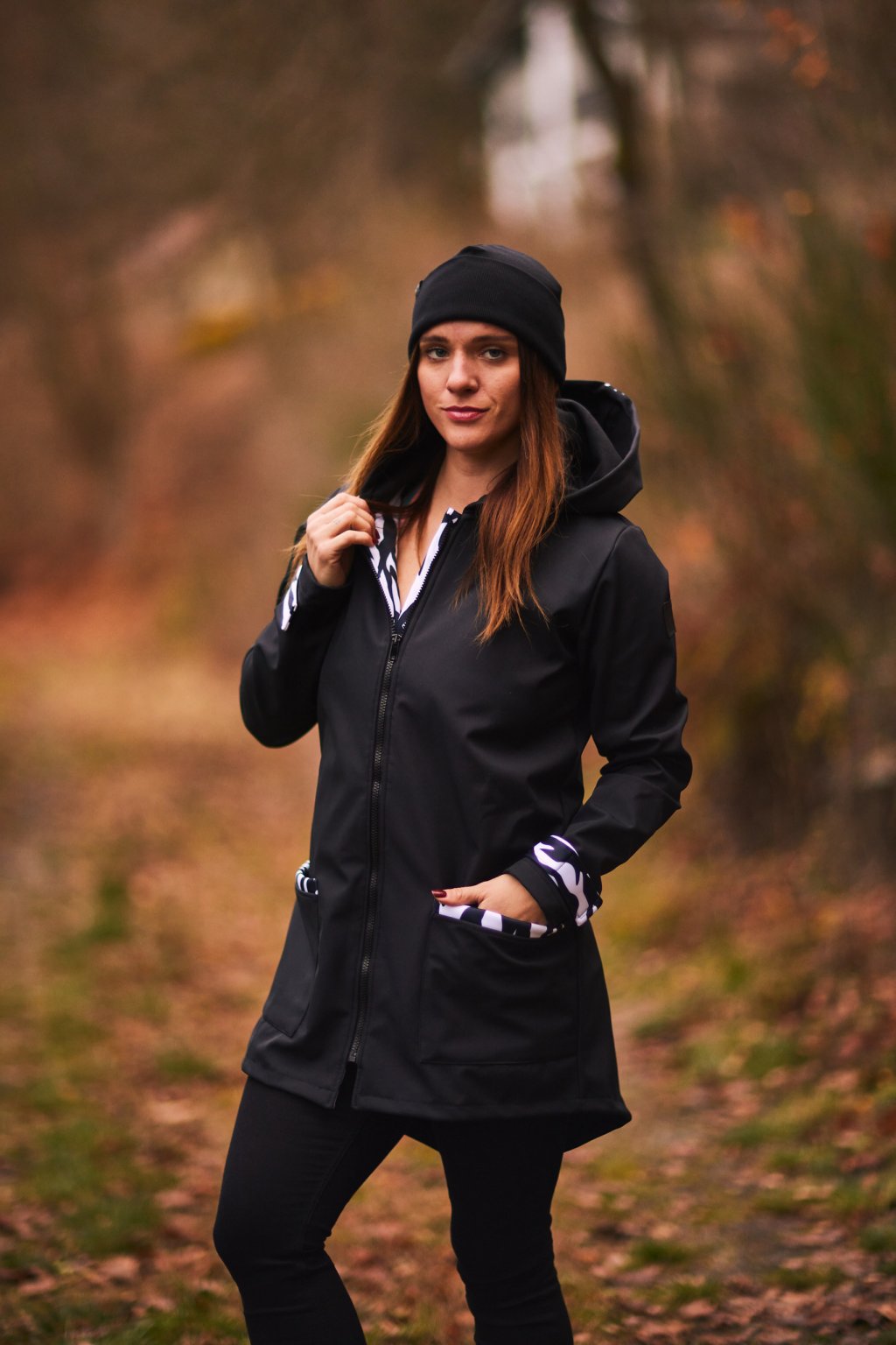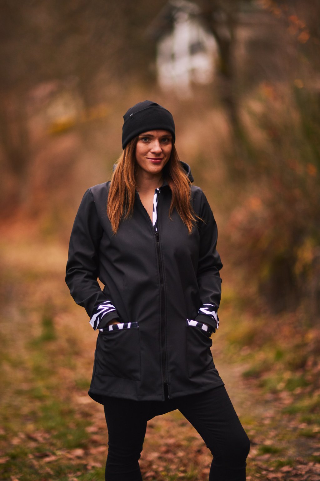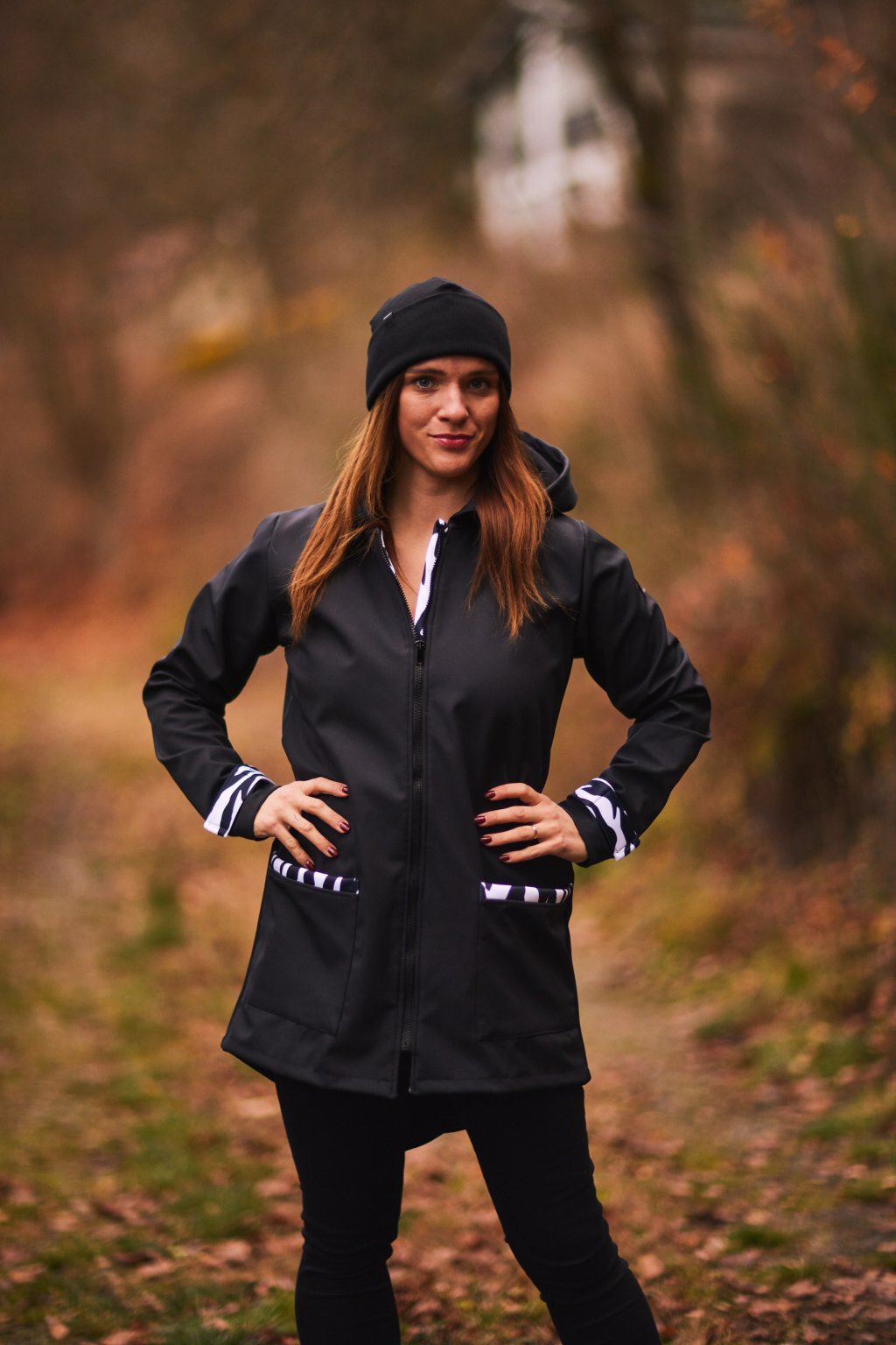 Vpředu je na zip a kapsy. Barva je černá kombinovaná se softshellem potiskem zebry, kterým jsou lemované kapsy a suché zipy na stahování rukávu. Parka se dá nosit na jaře, na podzim, s teplejšími vrstvami i v zimě.