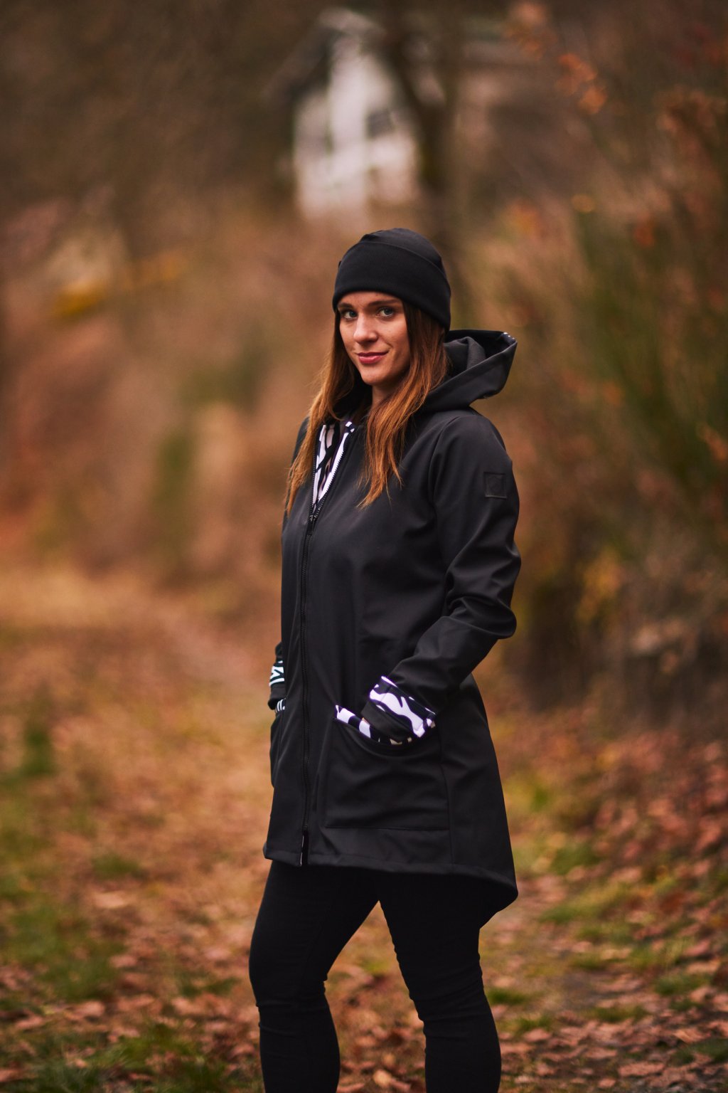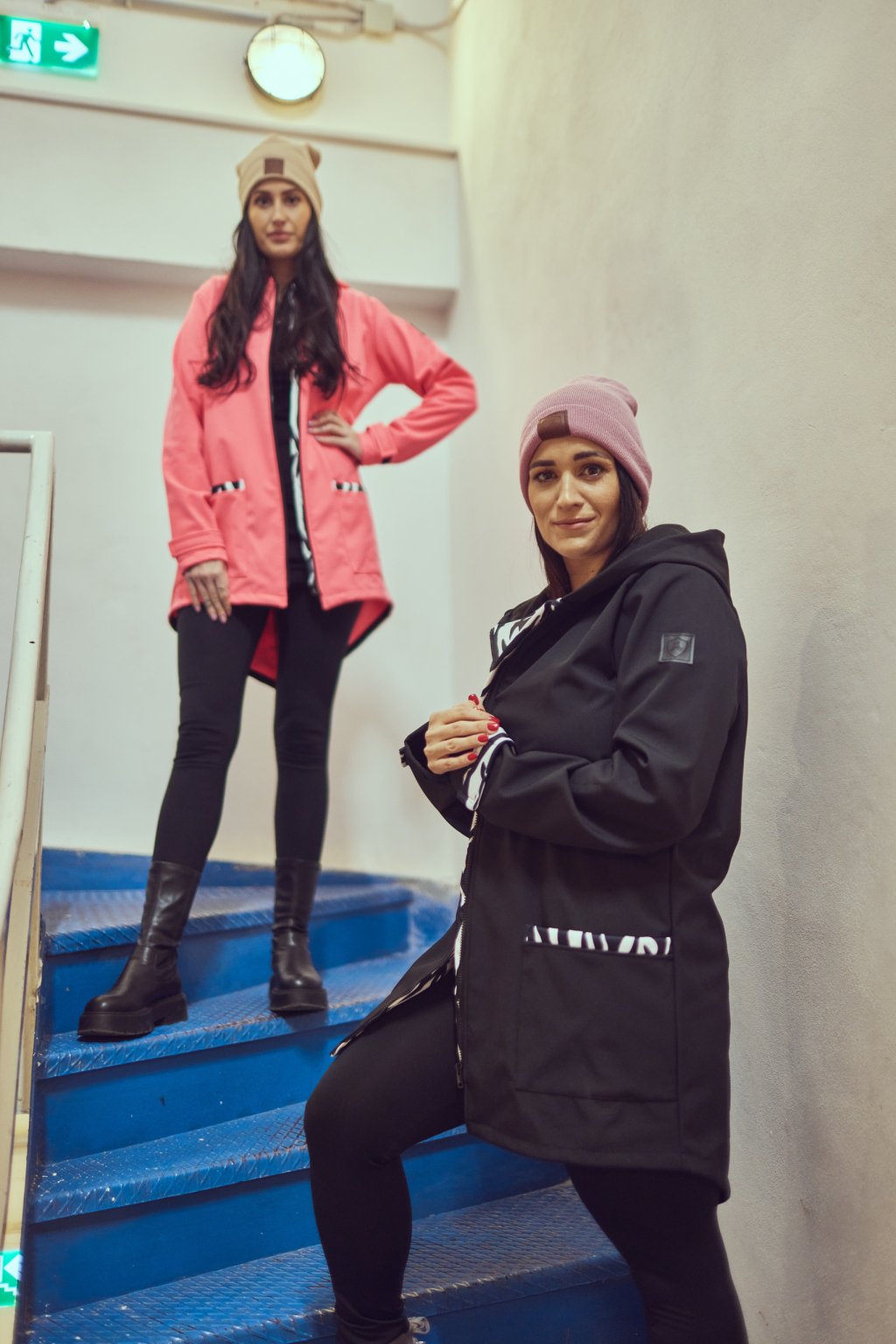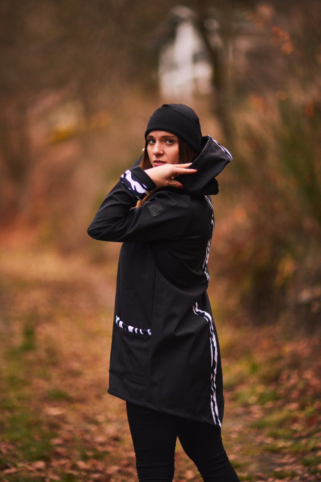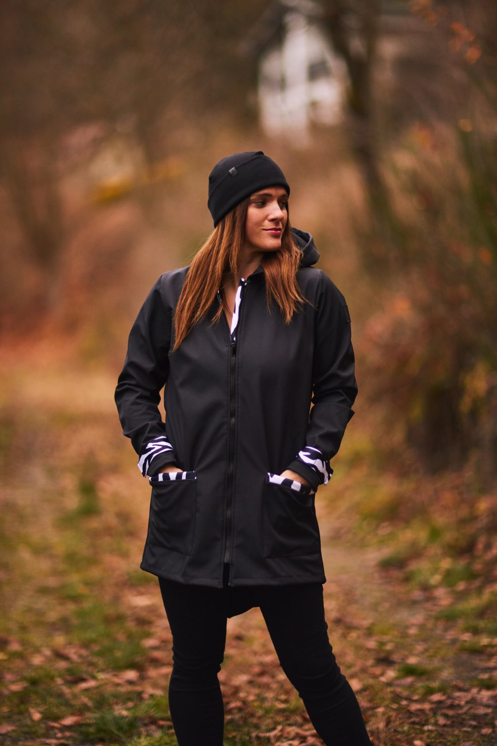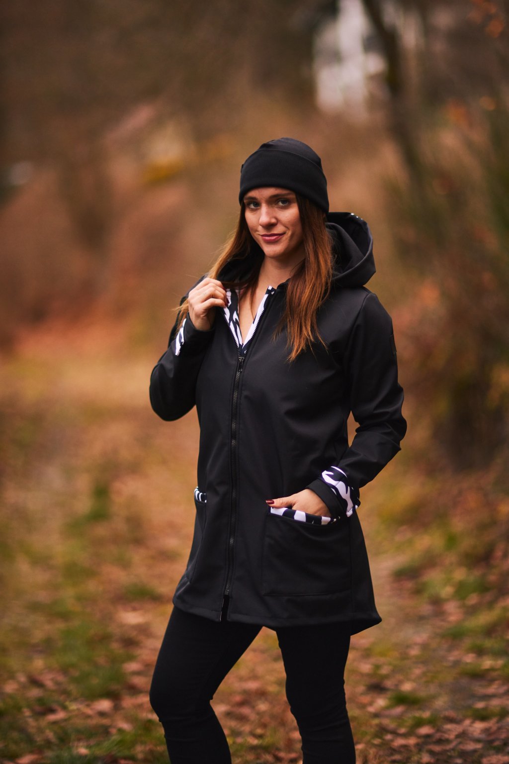 Vpředu je na zip a kapsy. Barva je černá kombinovaná se softshellem potiskem zebry, kterým jsou lemované kapsy a suché zipy na stahování rukávu. Parka se dá nosit na jaře, na podzim, s teplejšími vrstvami i v zimě.