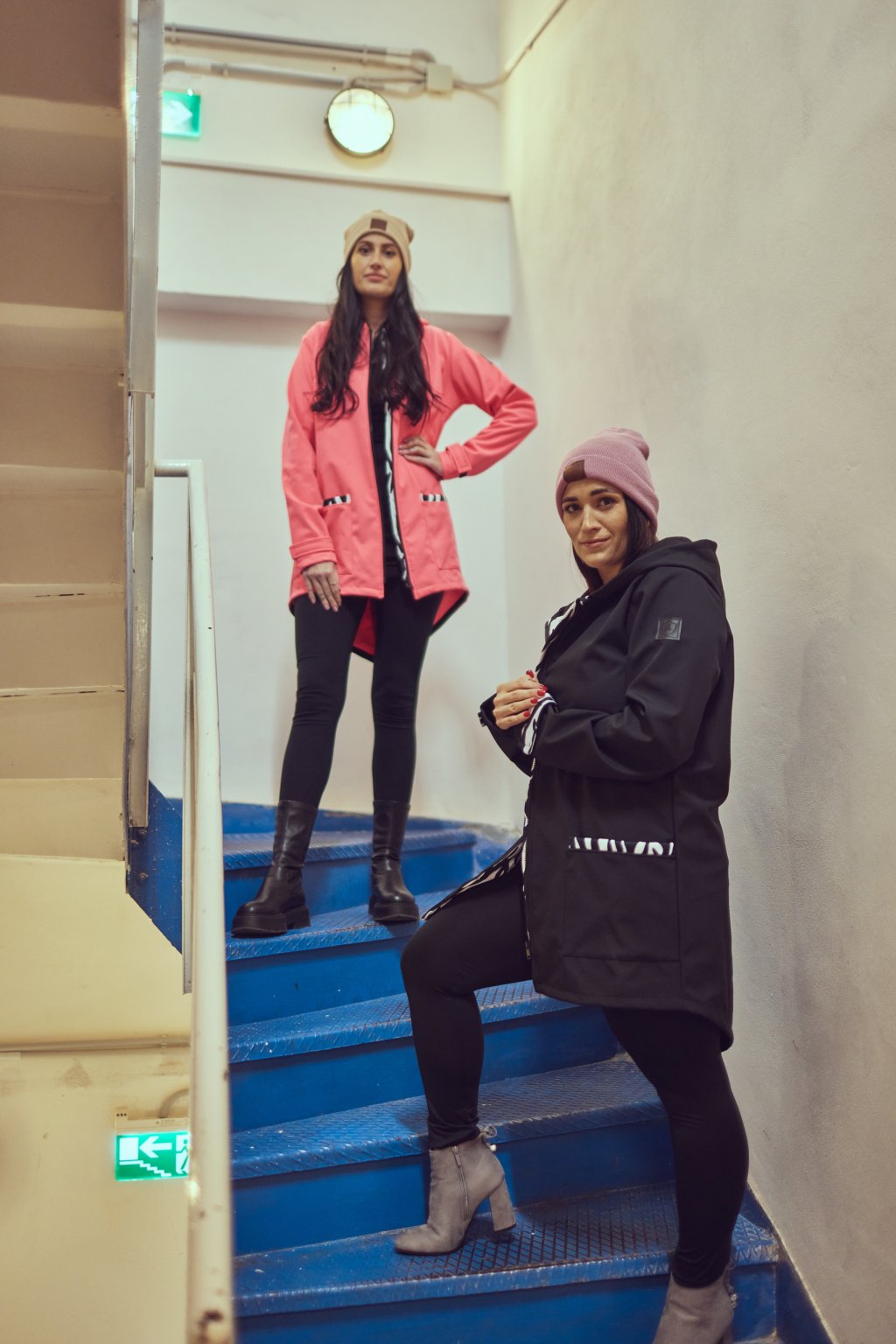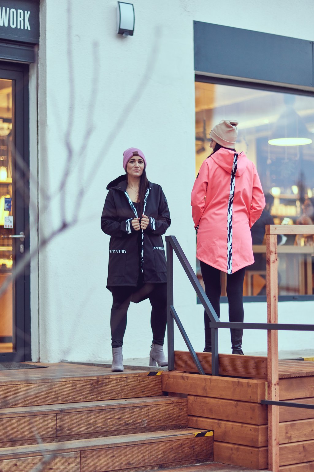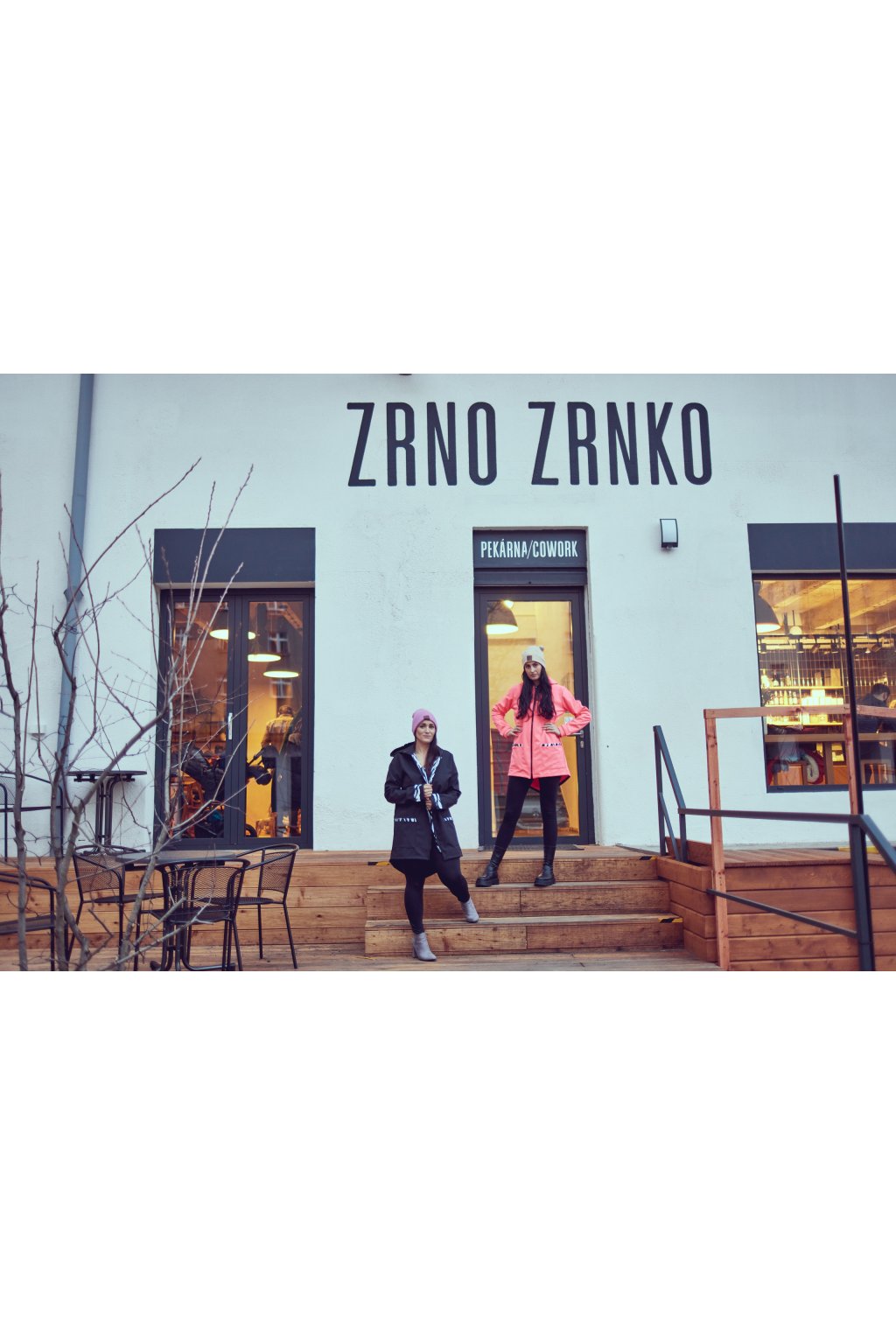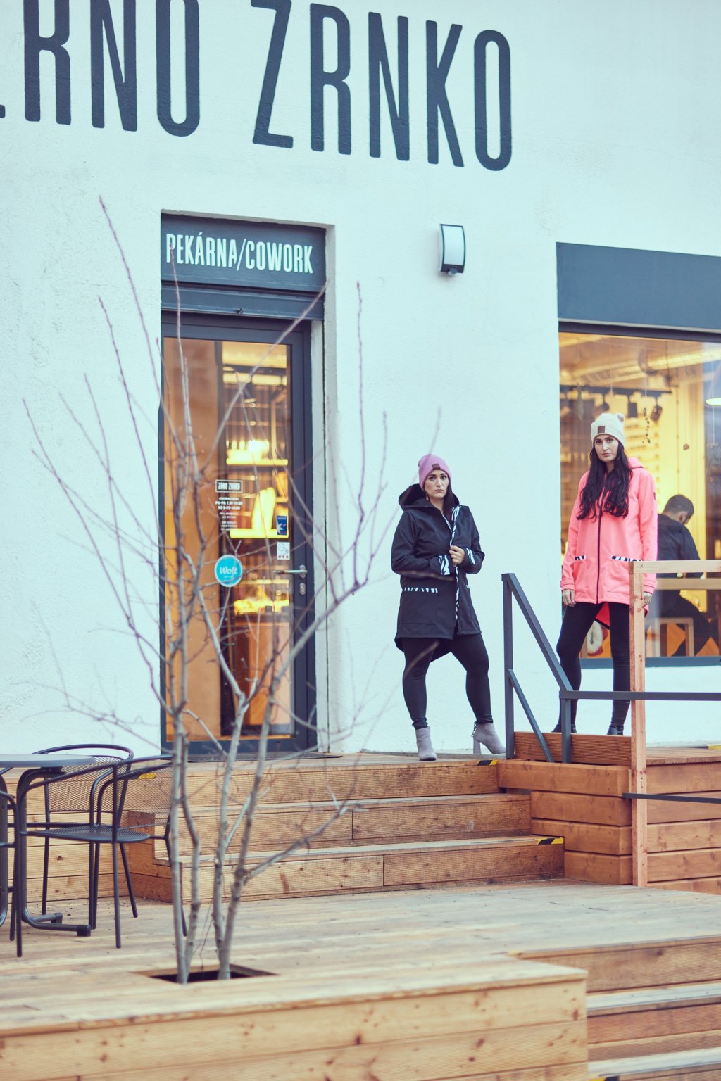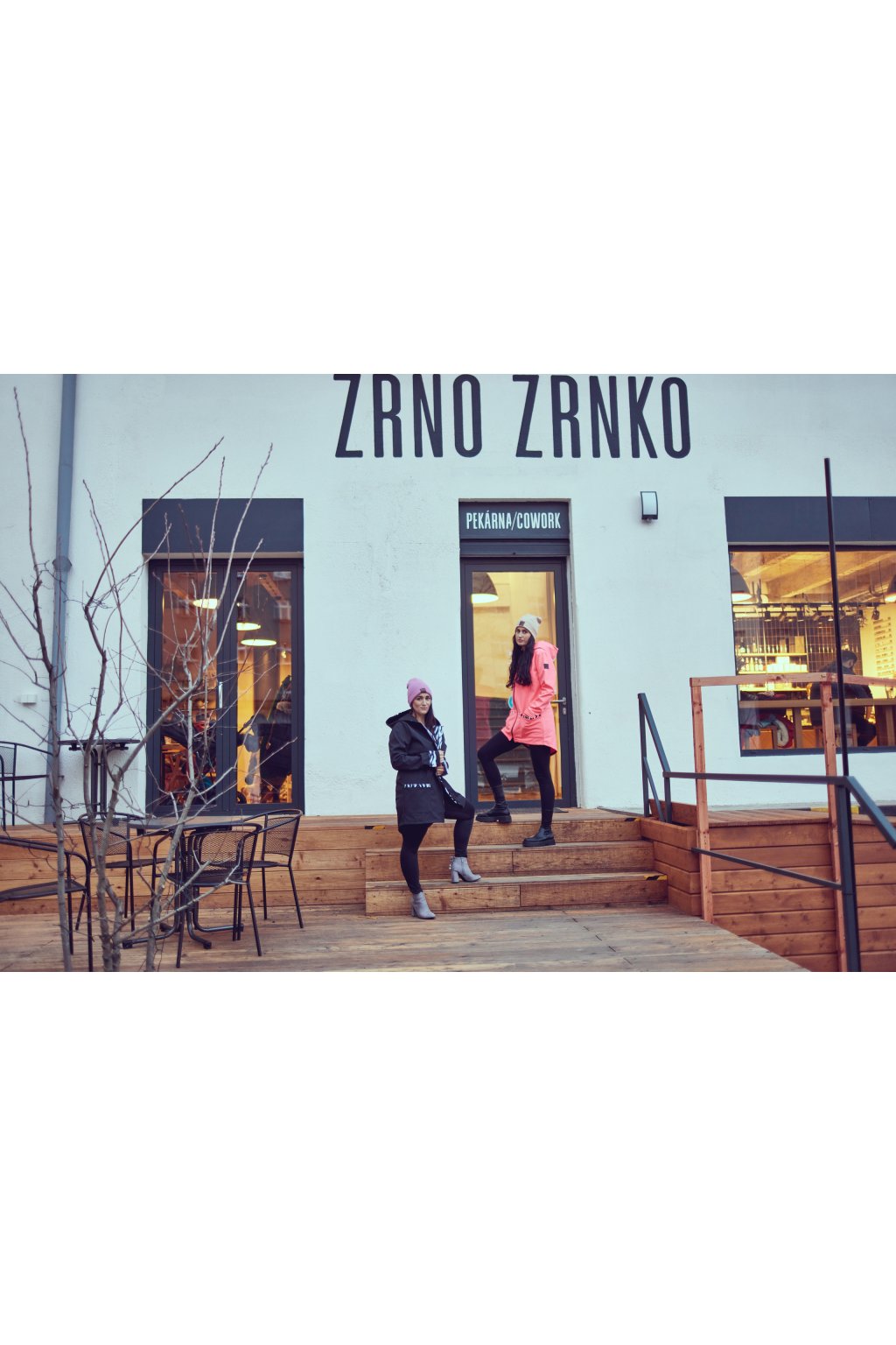 Vpředu je na zip a kapsy. Barva je černá kombinovaná se softshellem potiskem zebry, kterým jsou lemované kapsy a suché zipy na stahování rukávu. Parka se dá nosit na jaře, na podzim, s teplejšími vrstvami i v zimě.
