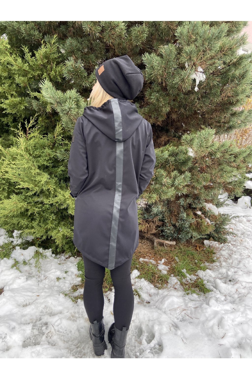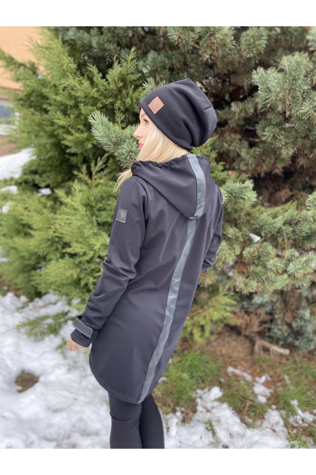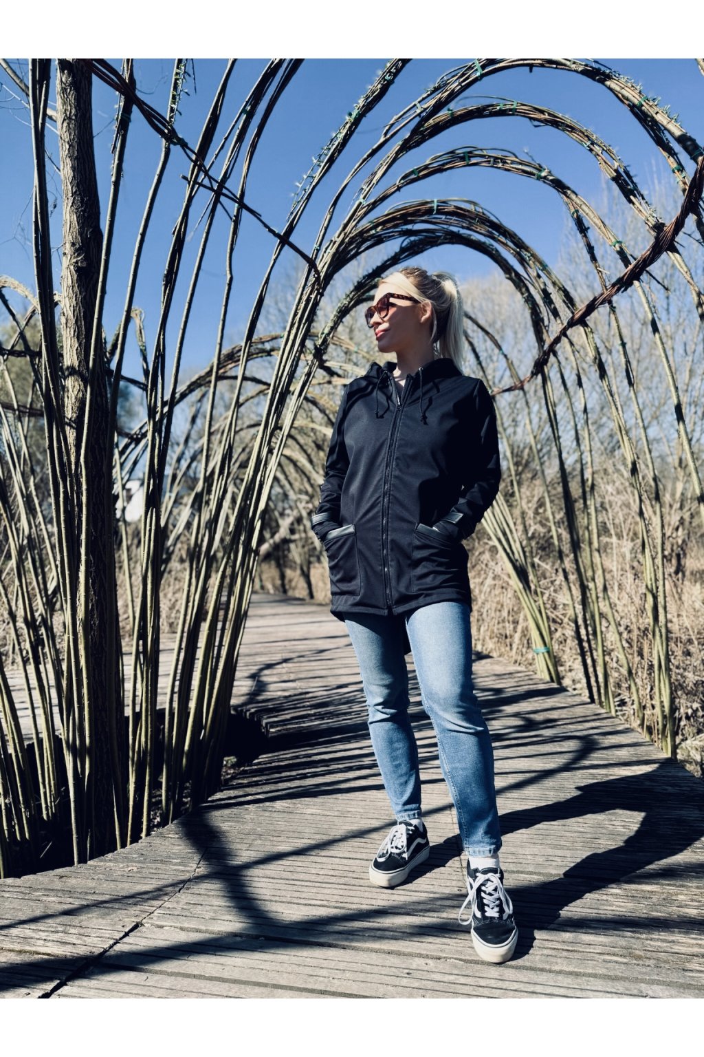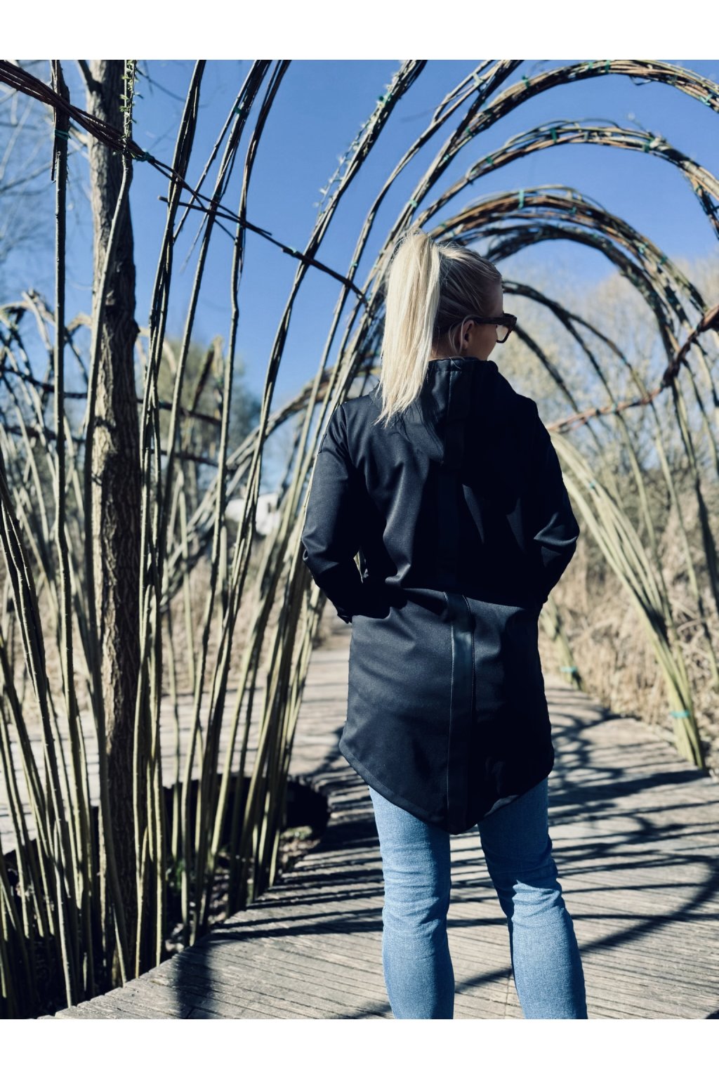 Vpředu je na zip a kapsy. Barva je černá kombinovaná s černou koženkou, kterou jsou lemované kapsy a suché zipy na stahování rukávu a pruh přes kapucu a záda. Parka se dá nosit na jaře, na podzim, s teplejšími vrstvami i v zimě.