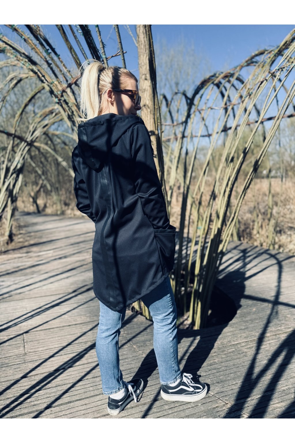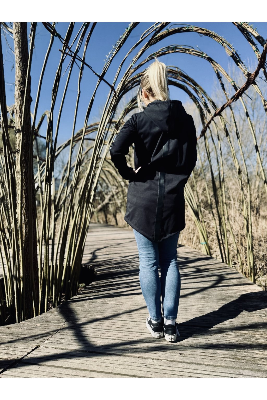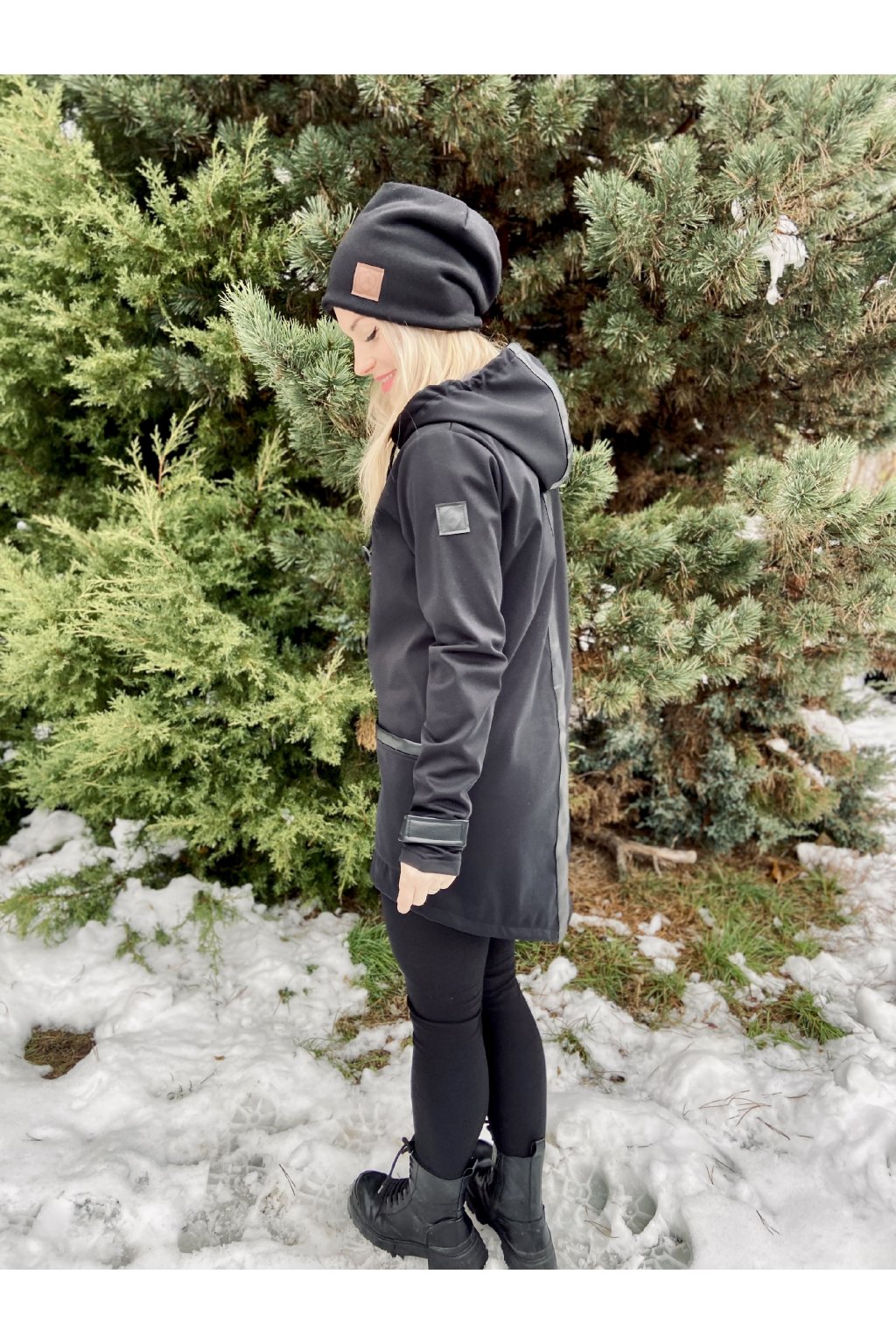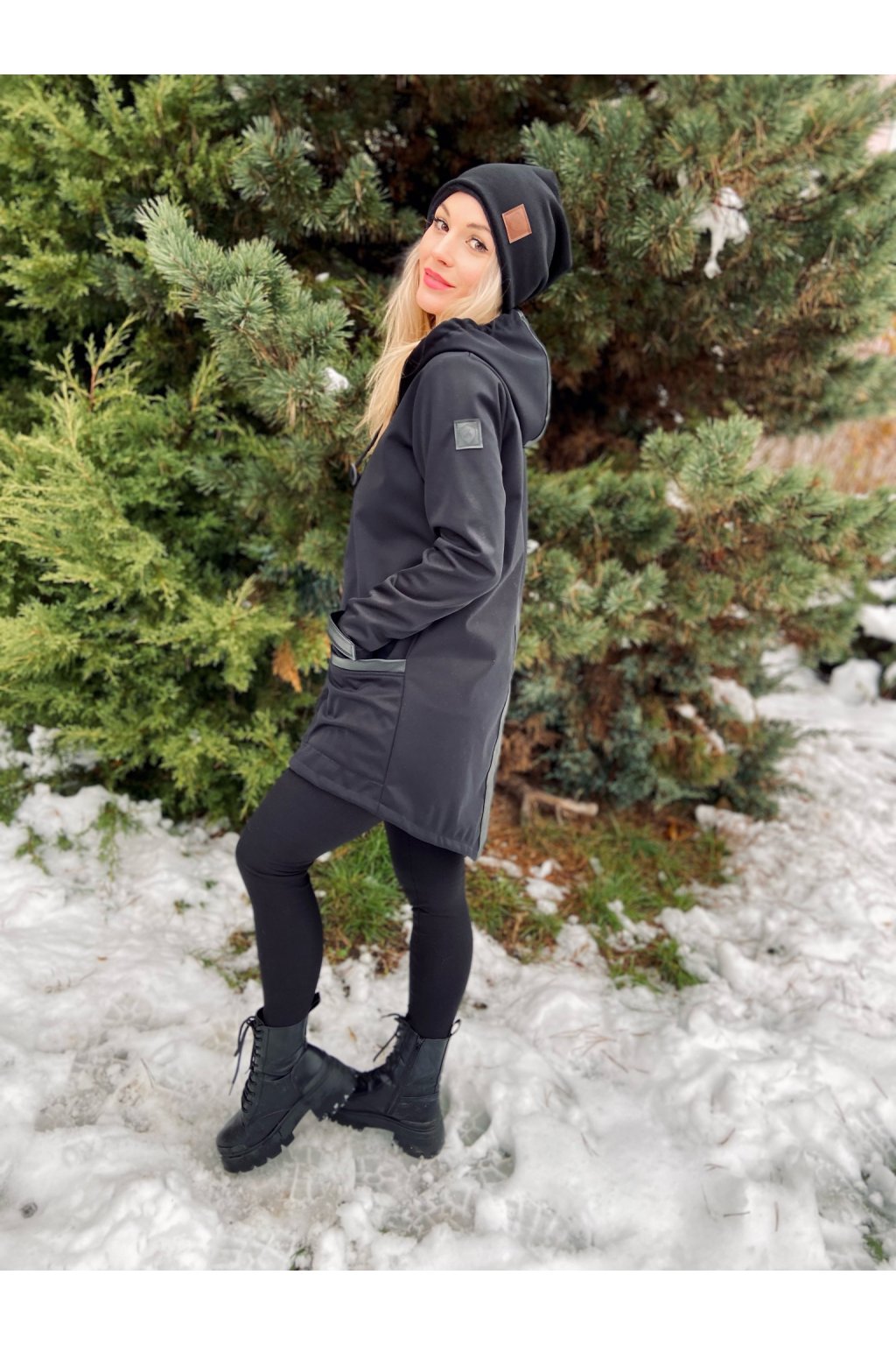 Vpředu je na zip a kapsy. Barva je černá kombinovaná s černou koženkou, kterou jsou lemované kapsy a suché zipy na stahování rukávu a pruh přes kapucu a záda. Parka se dá nosit na jaře, na podzim, s teplejšími vrstvami i v zimě.