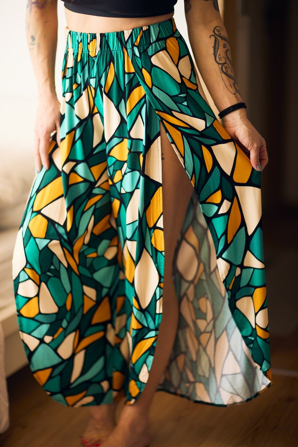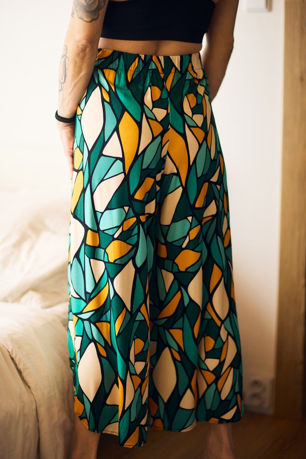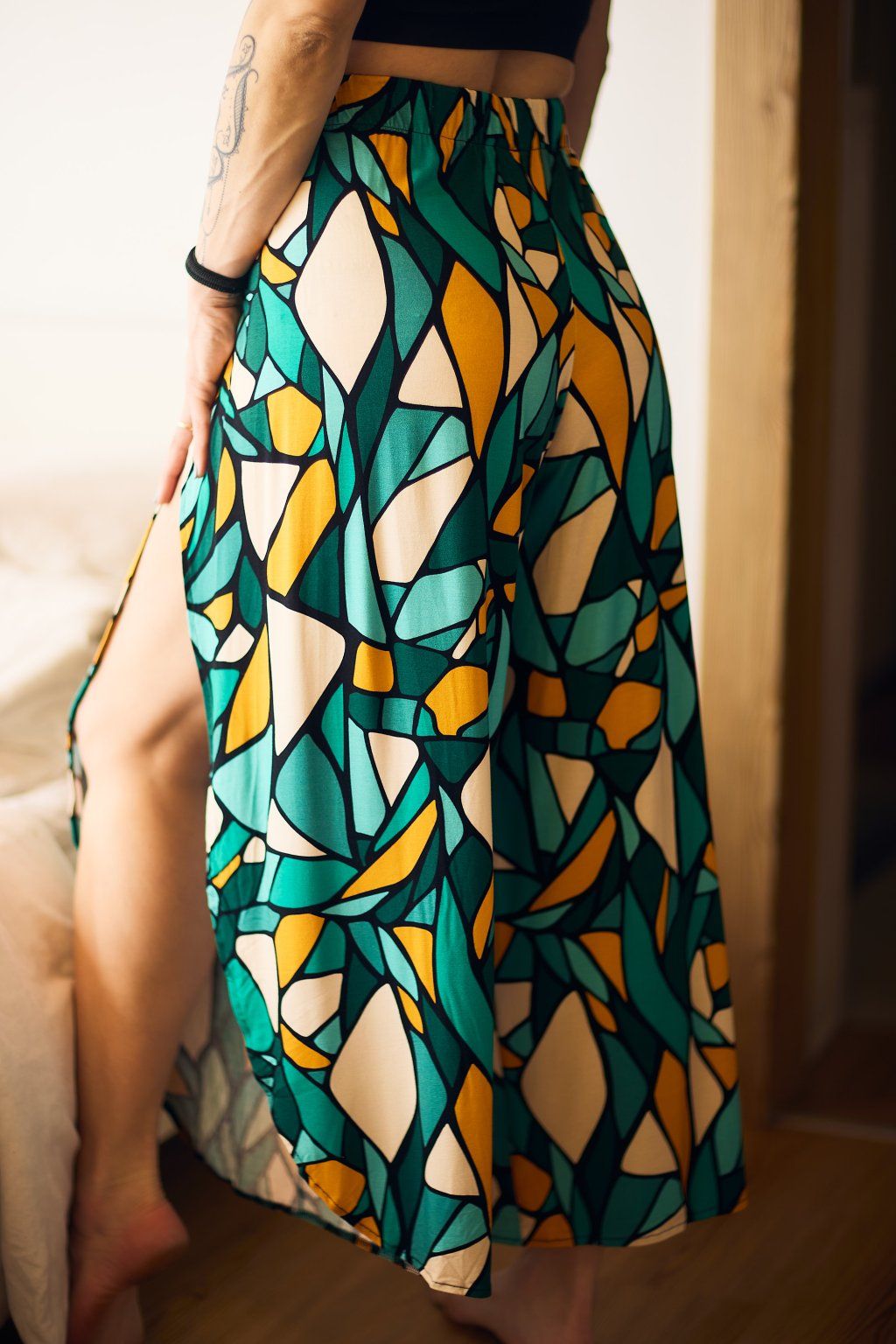 Kalhoty Vivienne jsou ušité z elastické, splývavé viskózy, která je ideální na teplé letní dny. V pase jsou do gumy a vpředu mají vysoké rozparky.