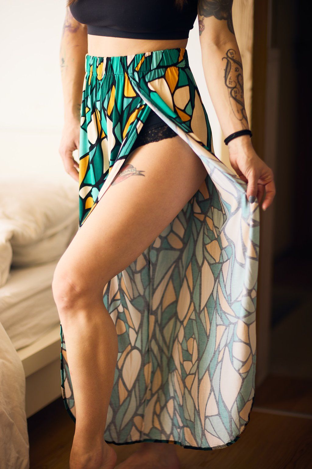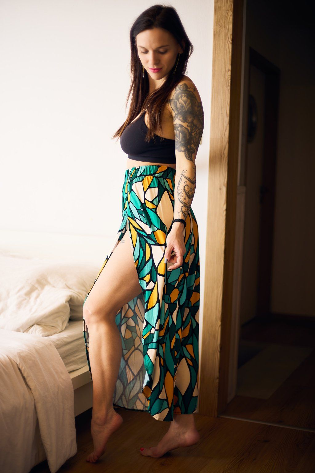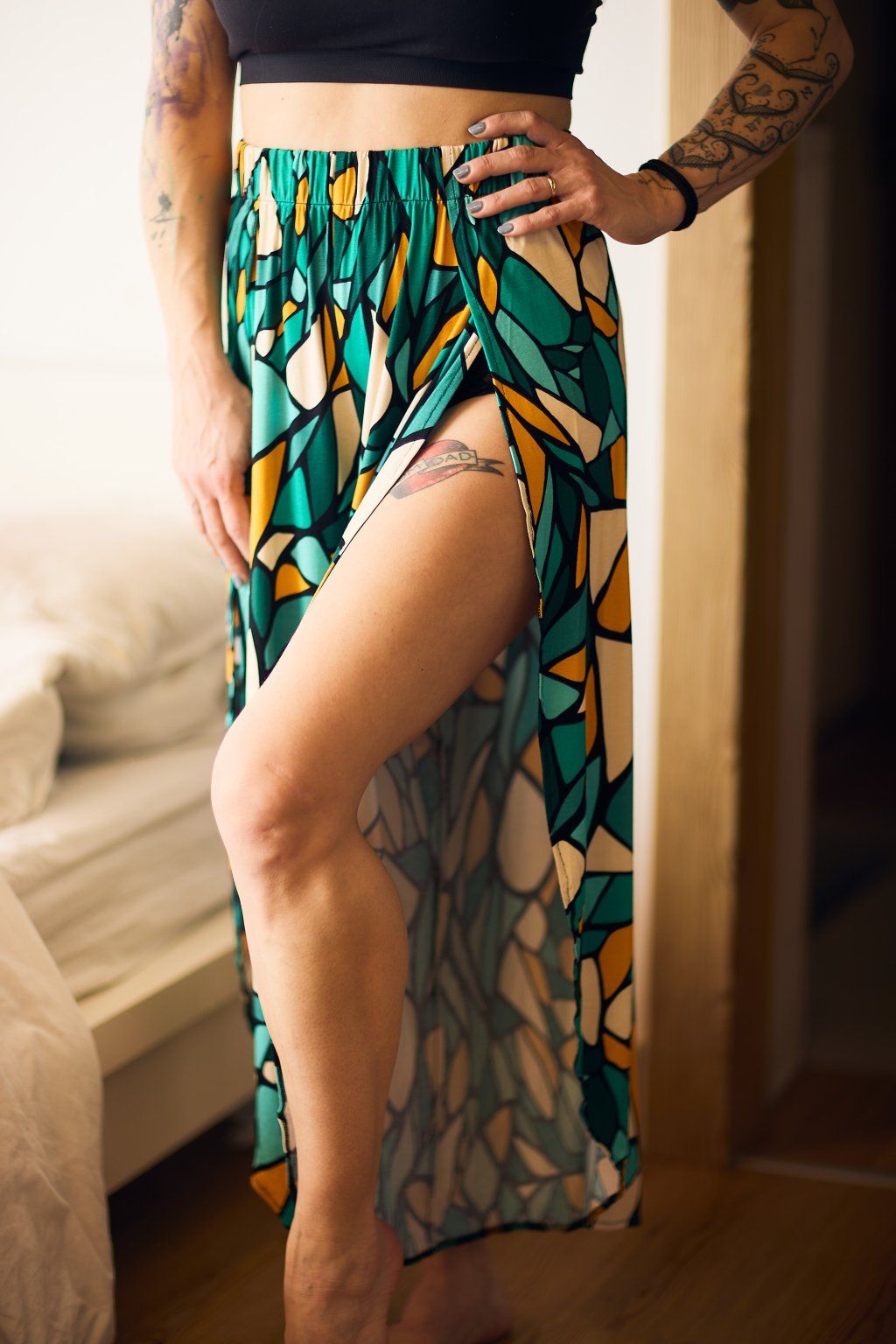 Kalhoty Vivienne jsou ušité z elastické, splývavé viskózy, která je ideální na teplé letní dny. V pase jsou do gumy a vpředu mají vysoké rozparky.