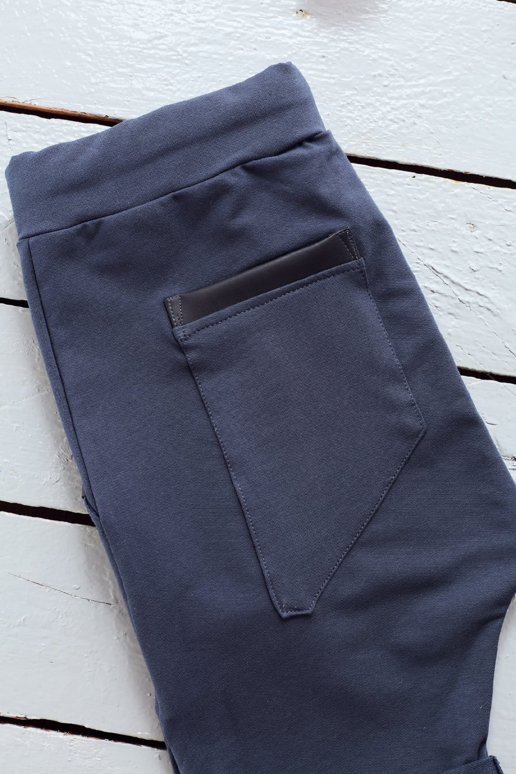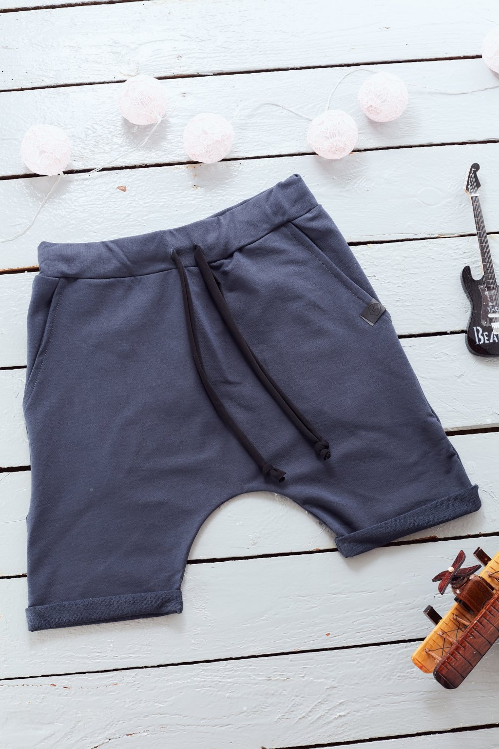Kraťasy jsou z příjemné modré teplákoviny. V pase jsou na gumu, mají černou úpletovou tkanici a vzadu dvě kapsy s lištama z černé koženky.