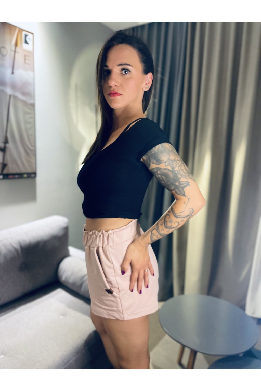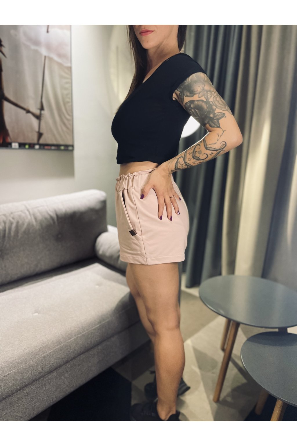 Kraťasy s z růžové teplákoviny. Mají dvě boční kapsy a nařasený horní lem.