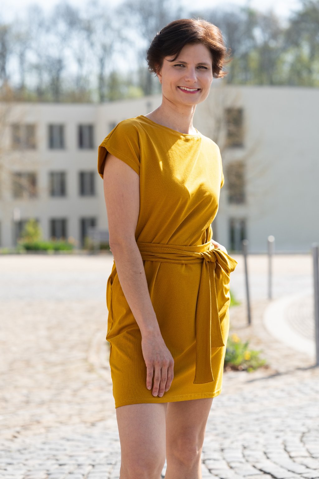 Střih šatů Aida je promyšlený do detailu. Bavlněný úplet s elastanem vybrala Veru pro tyto šaty skvěle – jsou díky němu krásně pružné a přizpůsobivé.