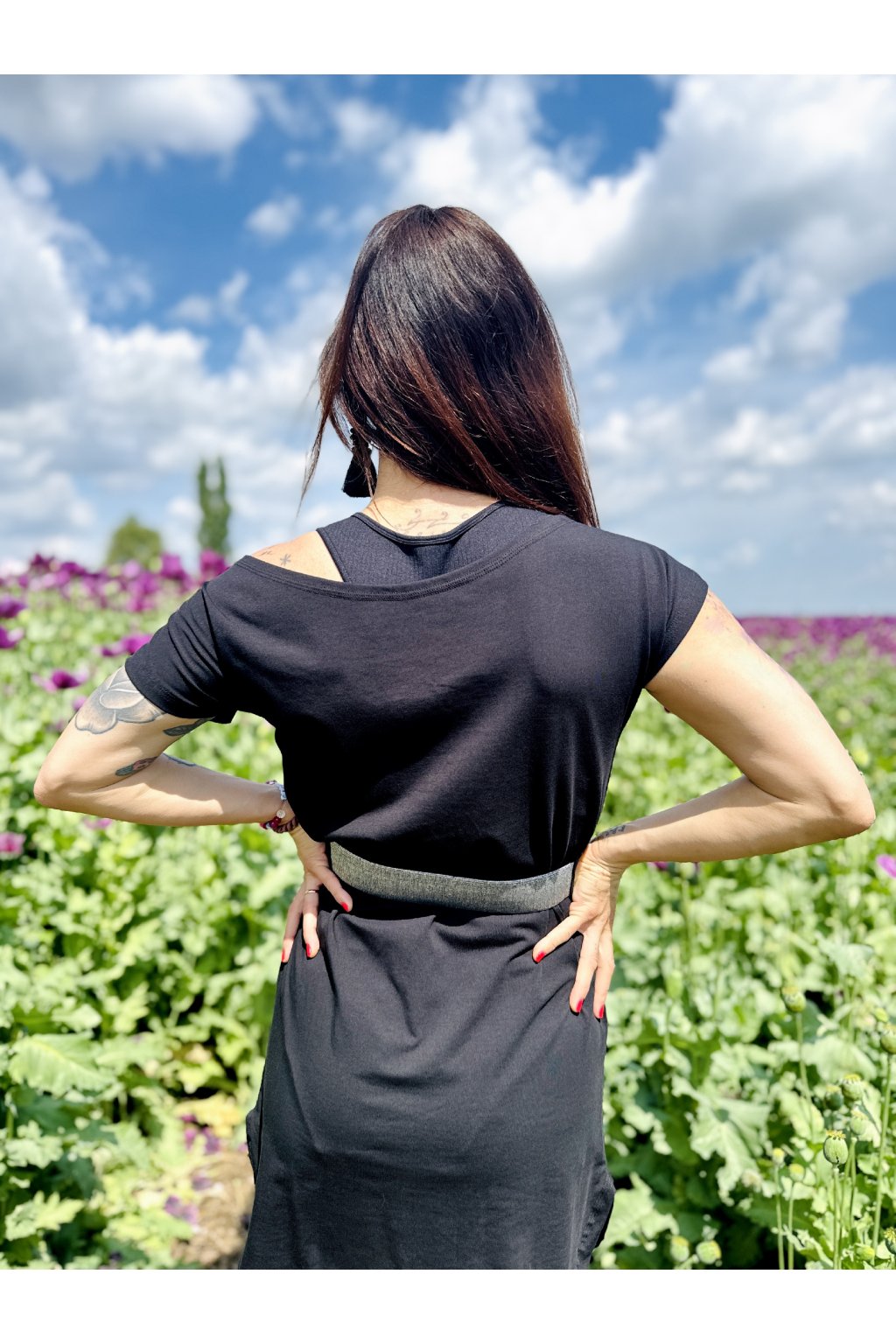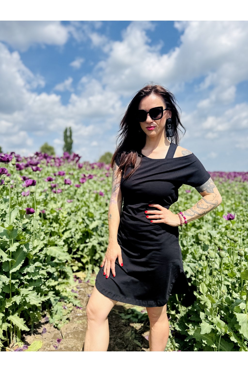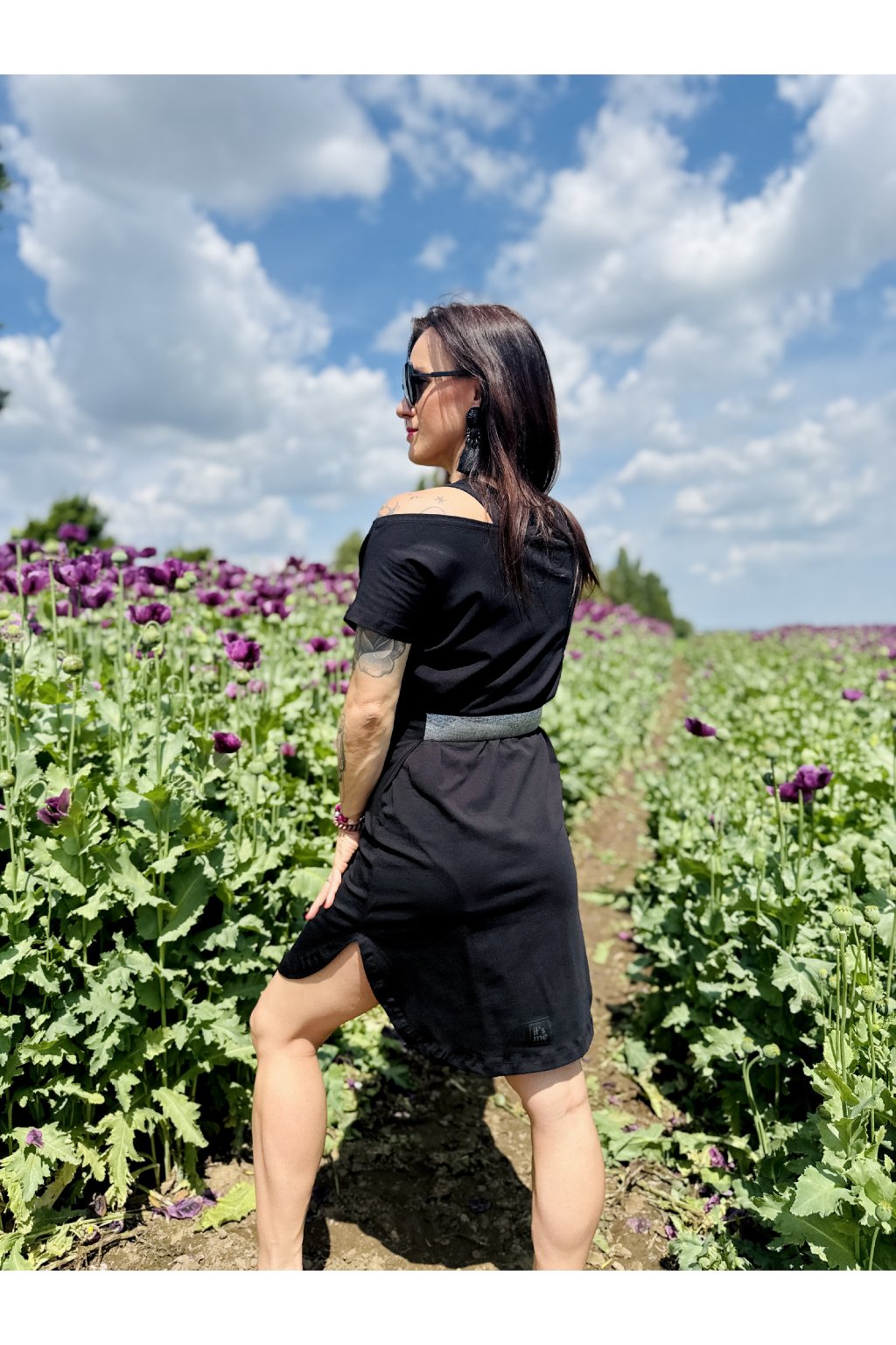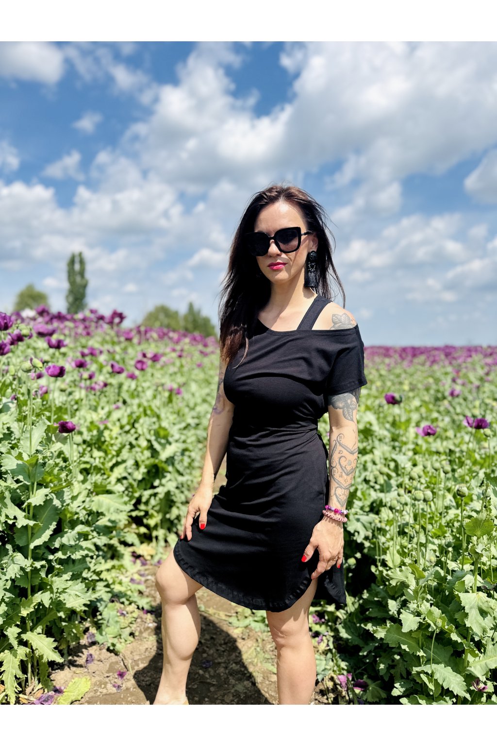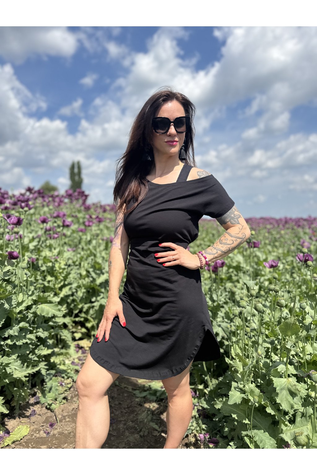Letní volné šaty se spadlým ramenem. Šaty jsou z černého bavlna/elastan úpletu. Vzadu mají krásný třpytivý detail v podobě lurexové pruženky.