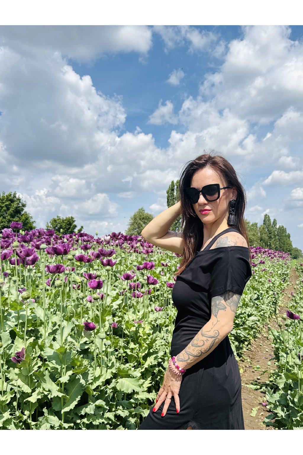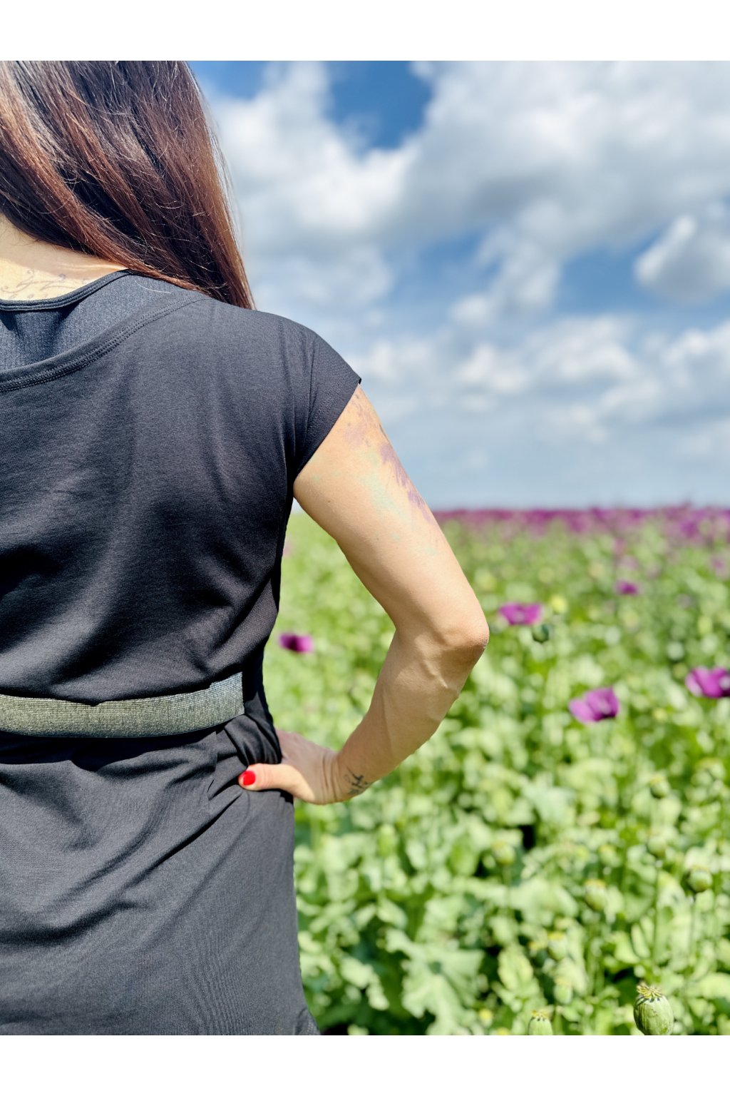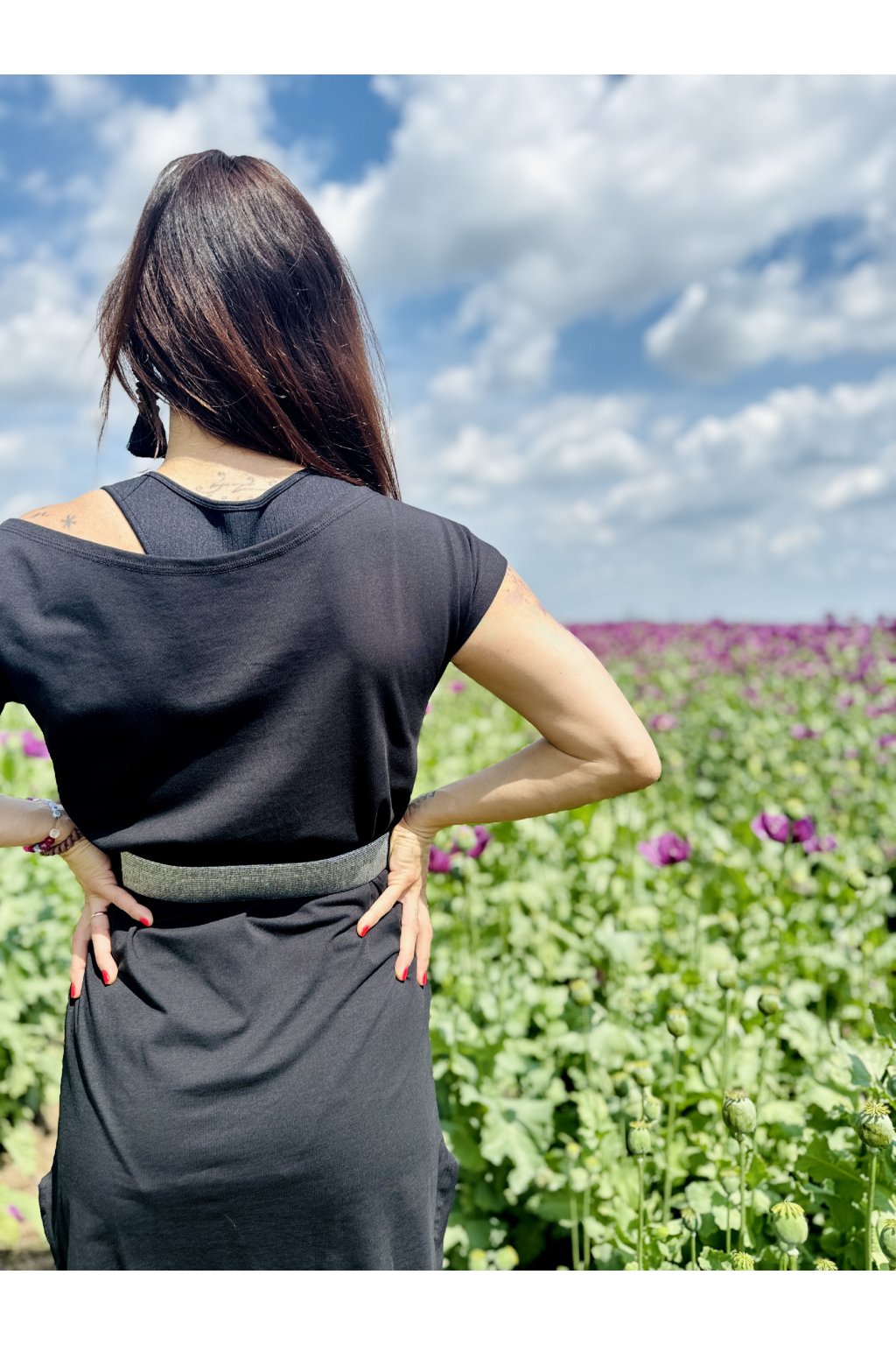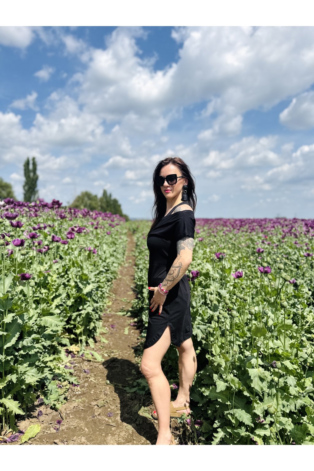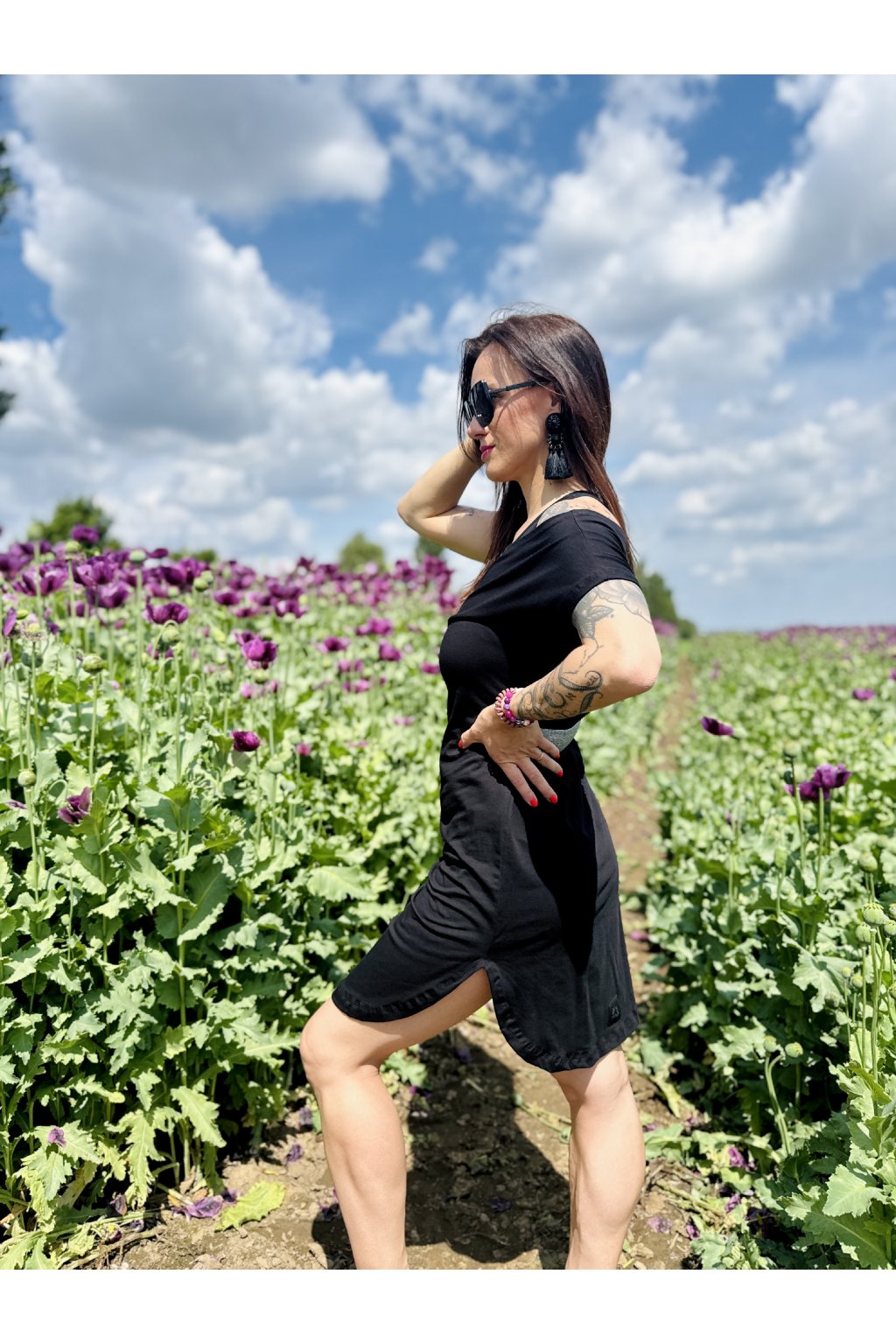 Letní volné šaty se spadlým ramenem. Šaty jsou z černého bavlna/elastan úpletu. Vzadu mají krásný třpytivý detail v podobě lurexové pruženky.