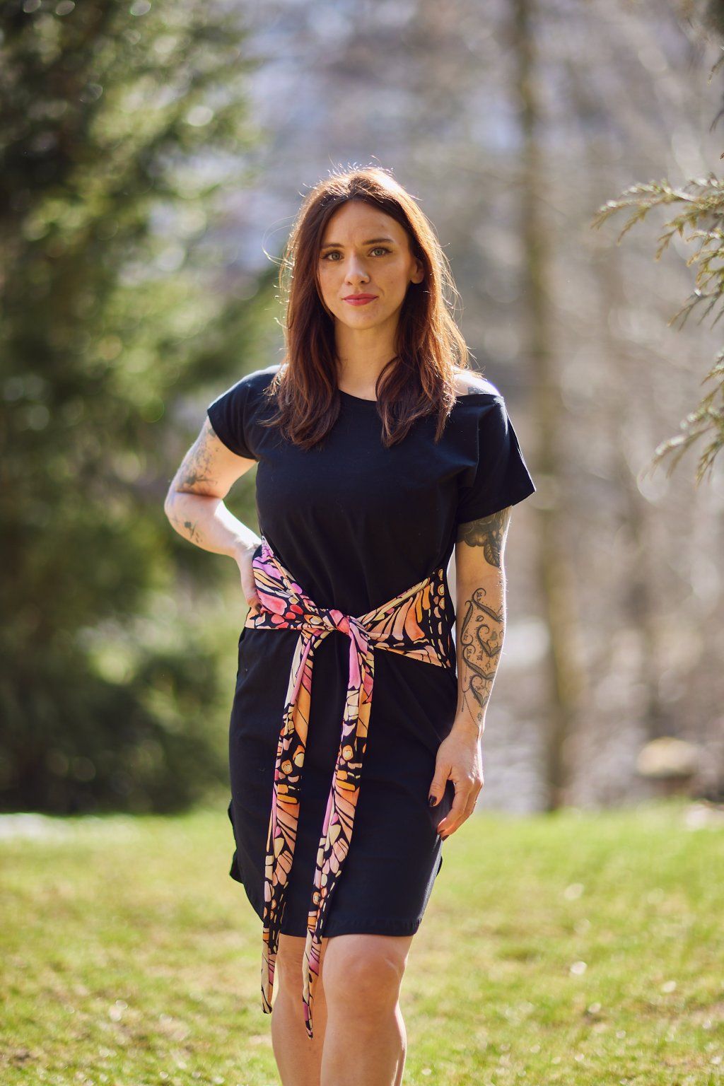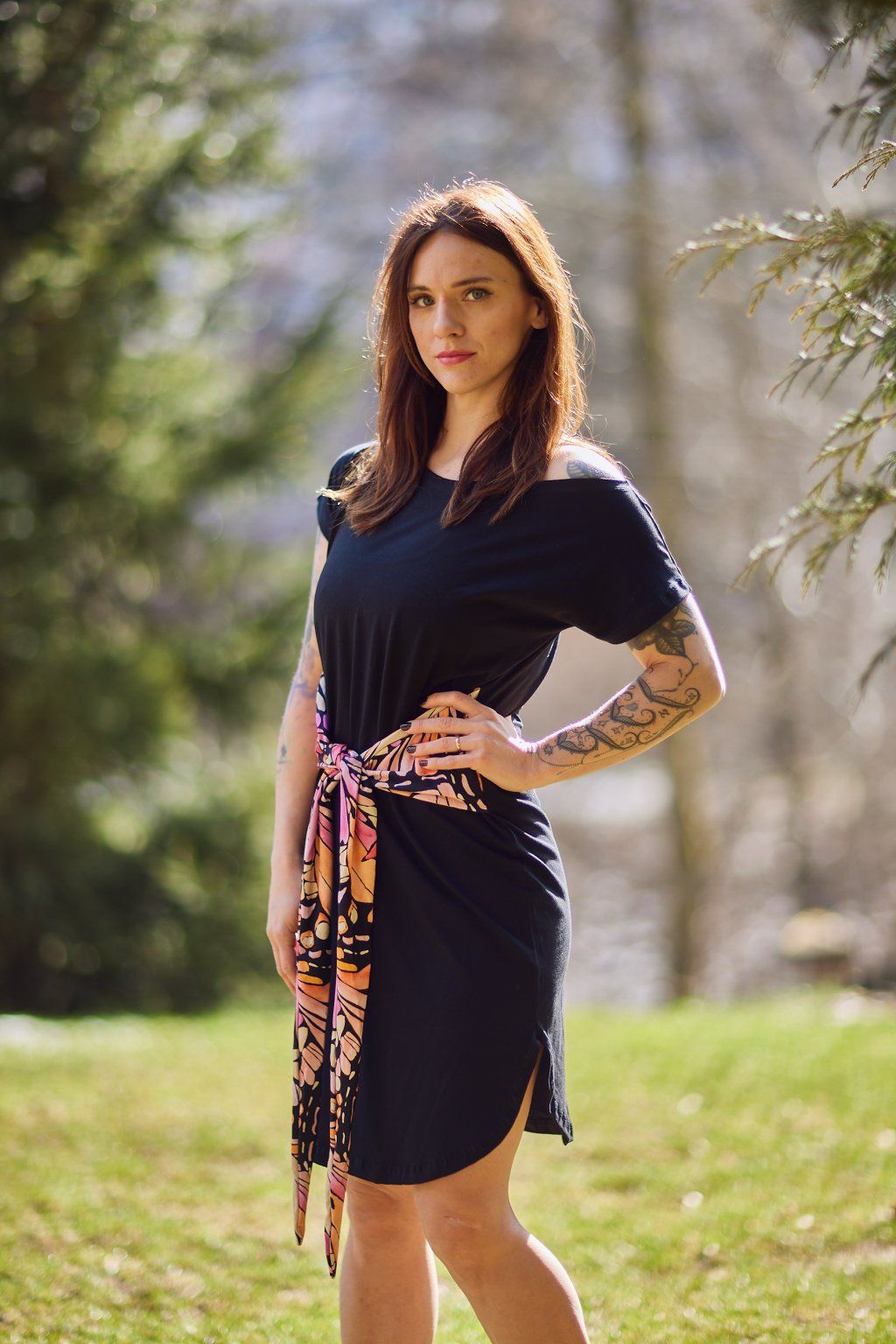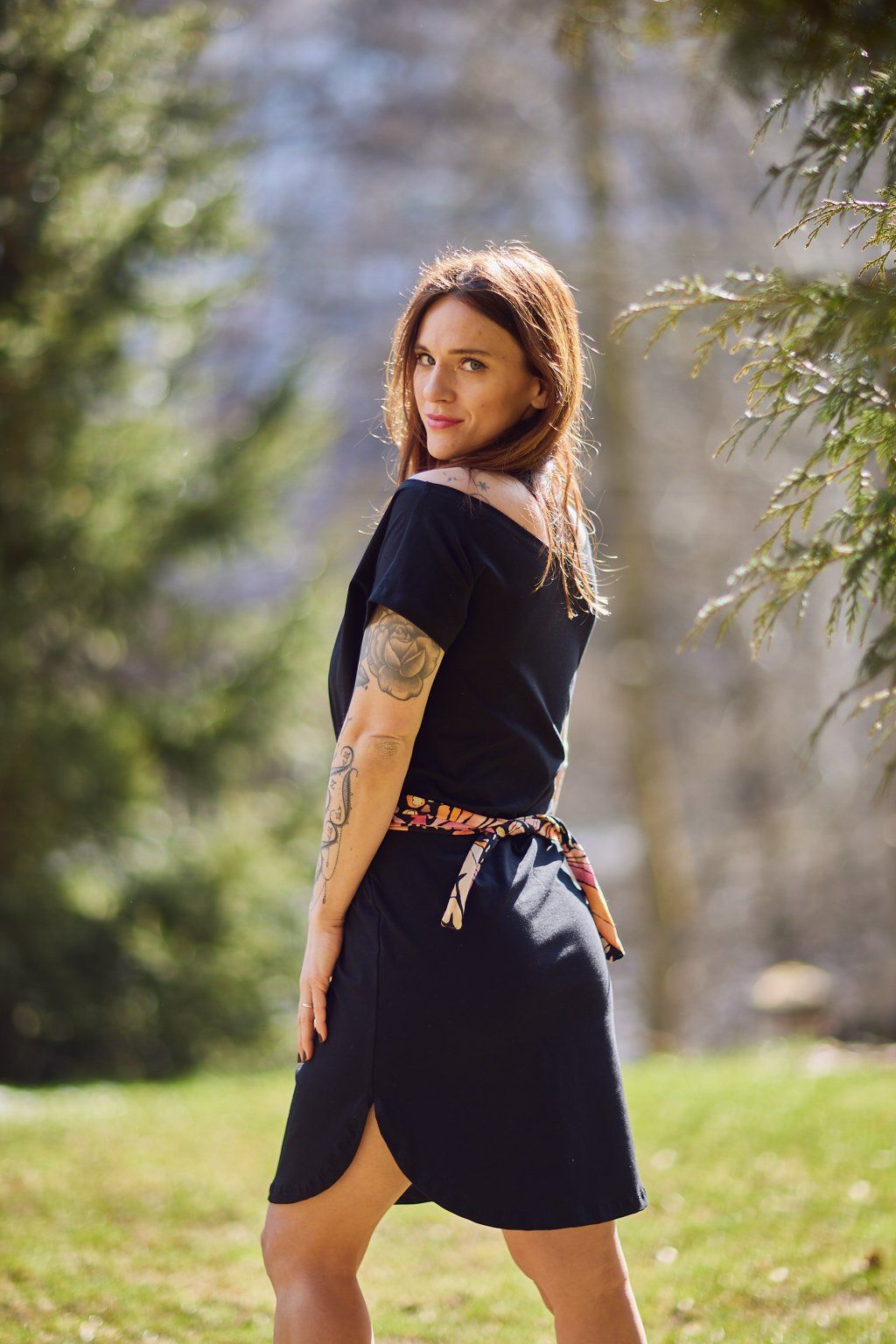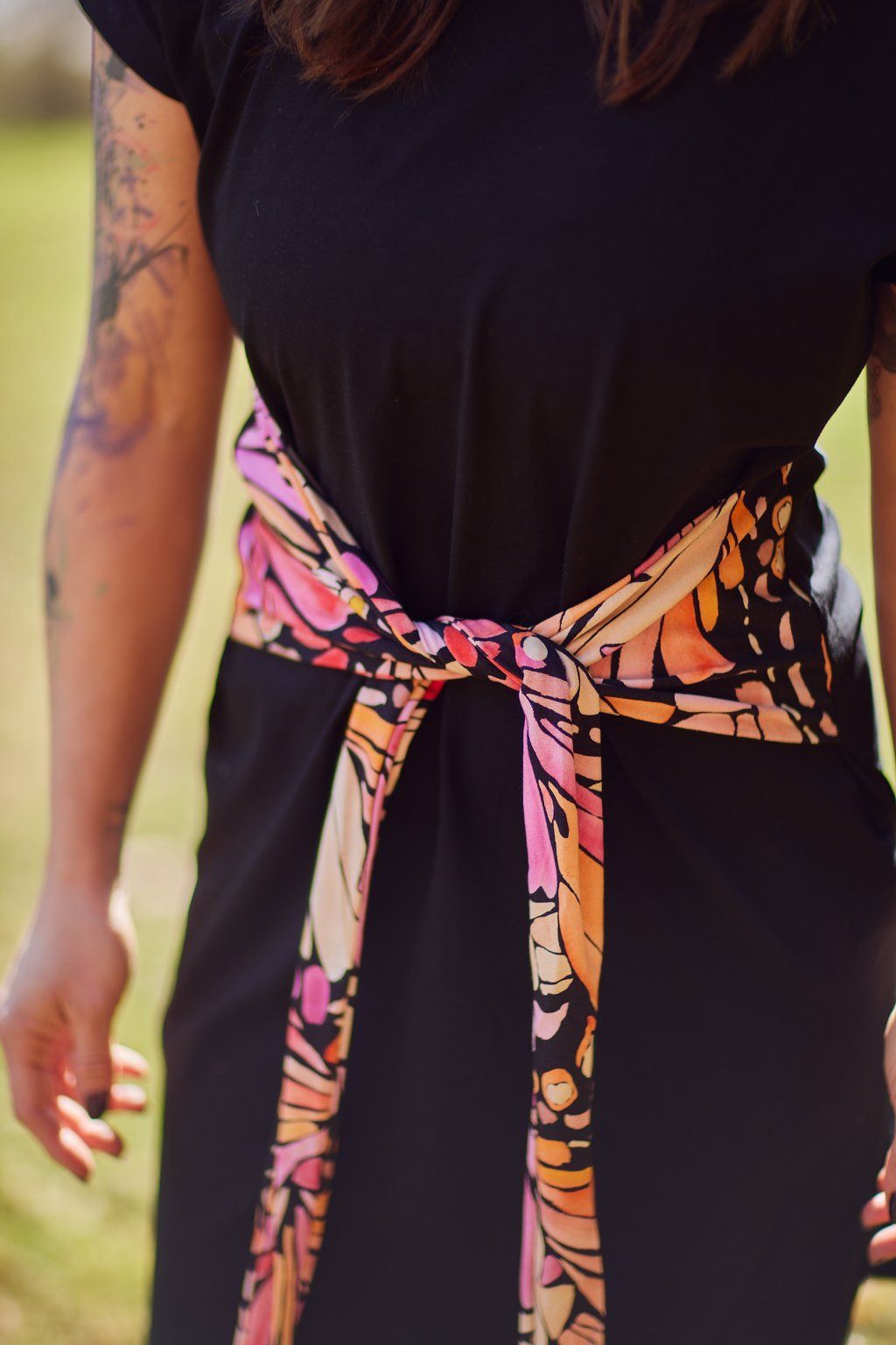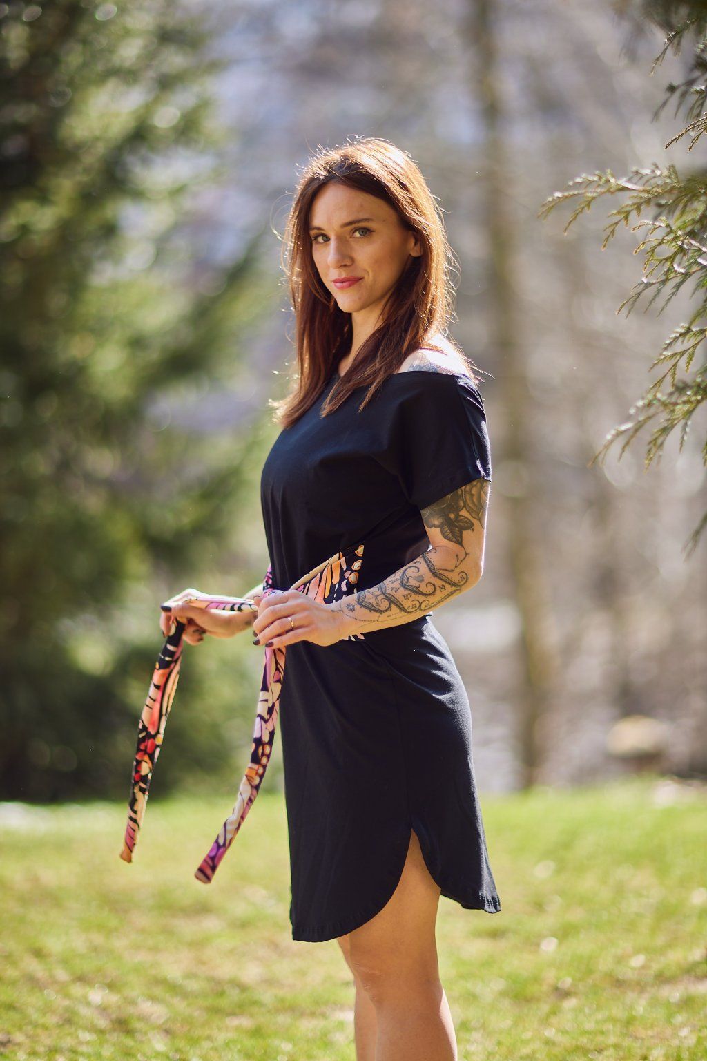 Letní volné šaty se spadlým ramenem na zavazování v pase na několik způsobů. Šaty jsou z černého bavlna/elastan úpletu. Vázanka je z jemné barevné viskózy.