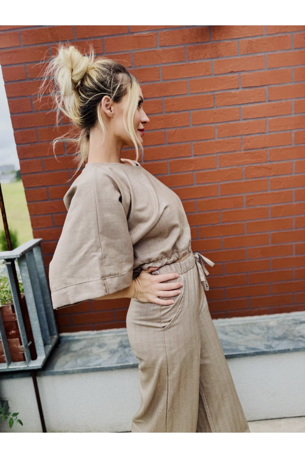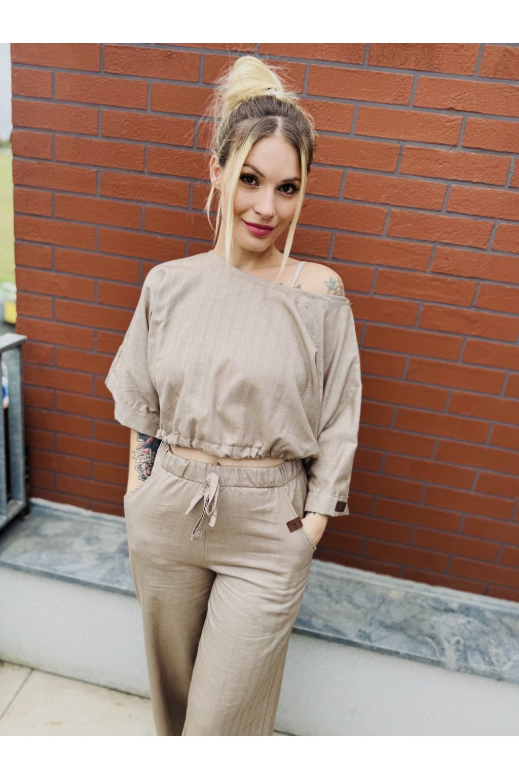 Kalhoty BROWNIE jsou ušité z příjemné bavlněné tkaniny. V pase jsou do gumy a mají dvě kapsy a široké nohavice.