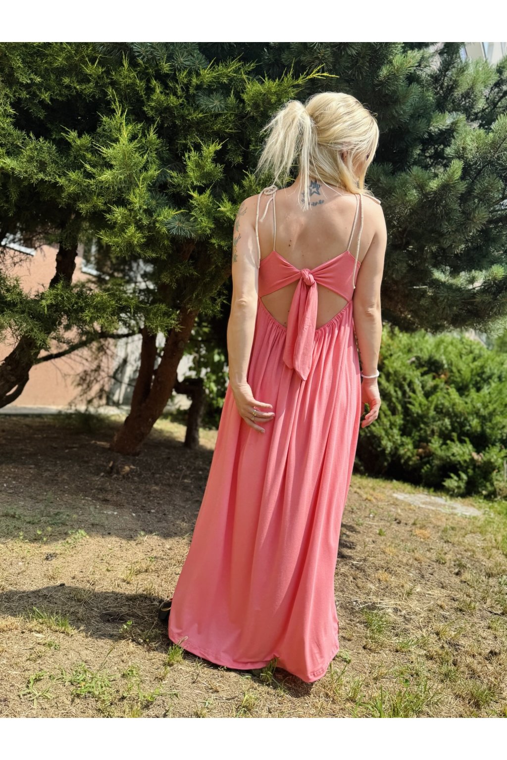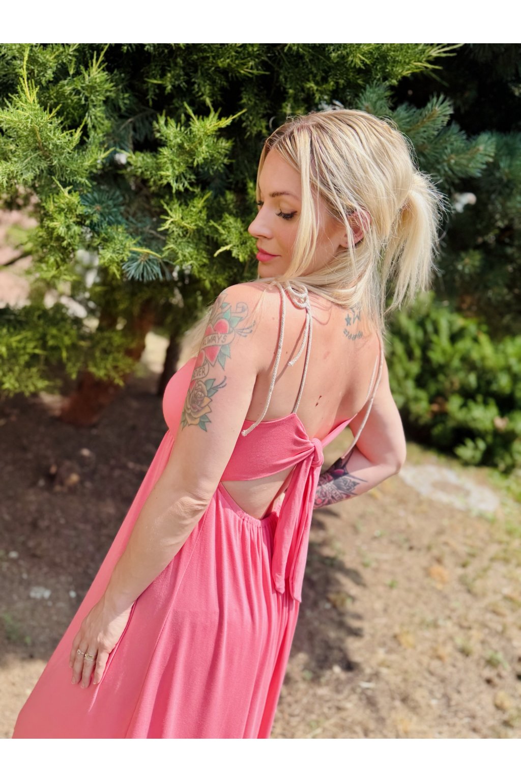Šaty jsou na ramínka, mají zavazovací top vzadu na mašli, takže jsou dobře nastavitelné. V předním díle podprsenky je uvnitř nažehlený vlizelín, aby lépe držela tvar. Sukně je na zadním díle rafinovaně vykrojená. Šaty mají částečně odhalená záda.