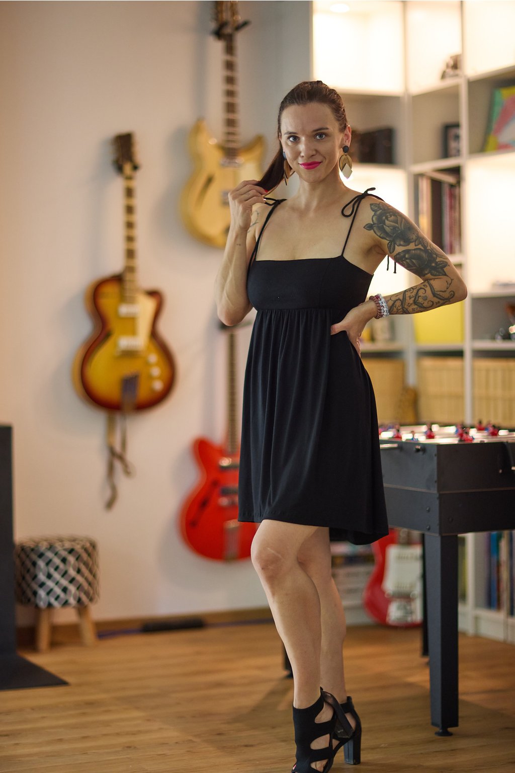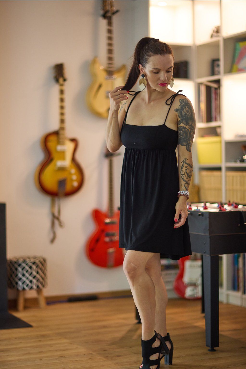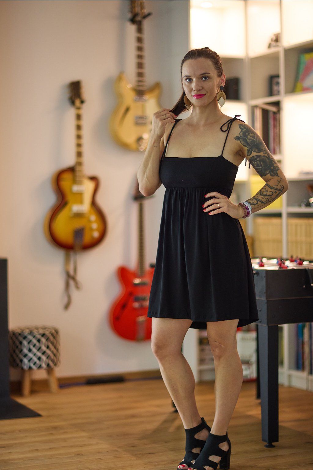 Šaty jsou na ramínka, mají zavazovací top vzadu na mašli, takže jsou dobře nastavitelné. V předním díle podprsenky je uvnitř nažehlený vlizelín, aby lépe držela tvar. Sukně je na zadním díle rafinovaně vykrojená. Šaty mají částečně odhalená záda.