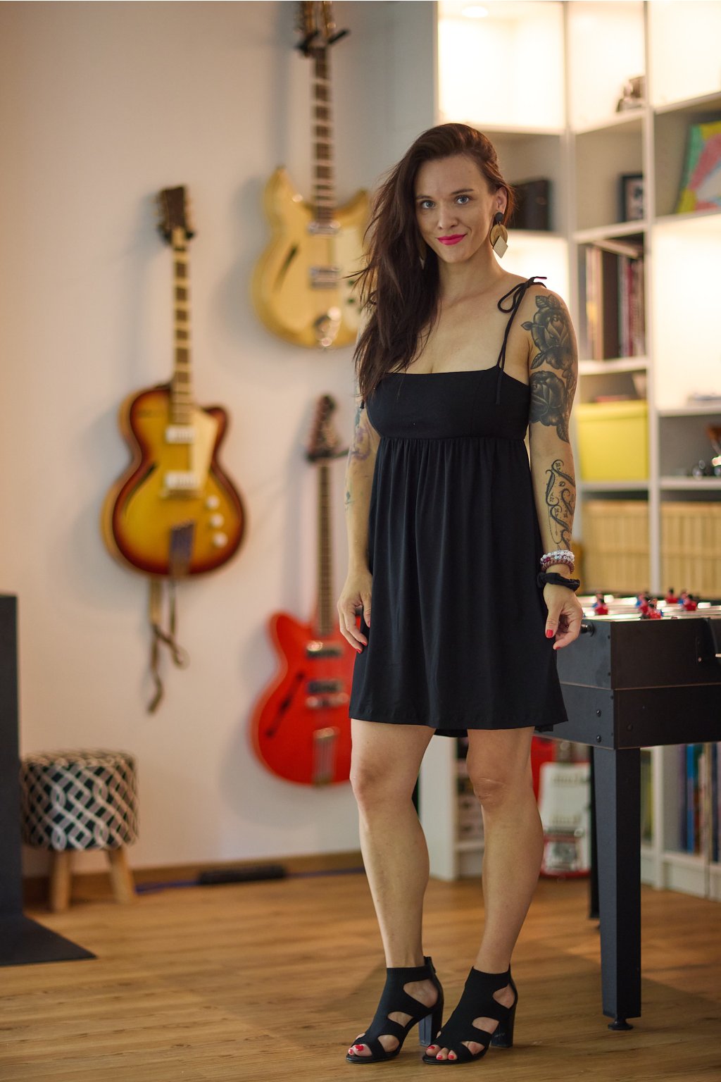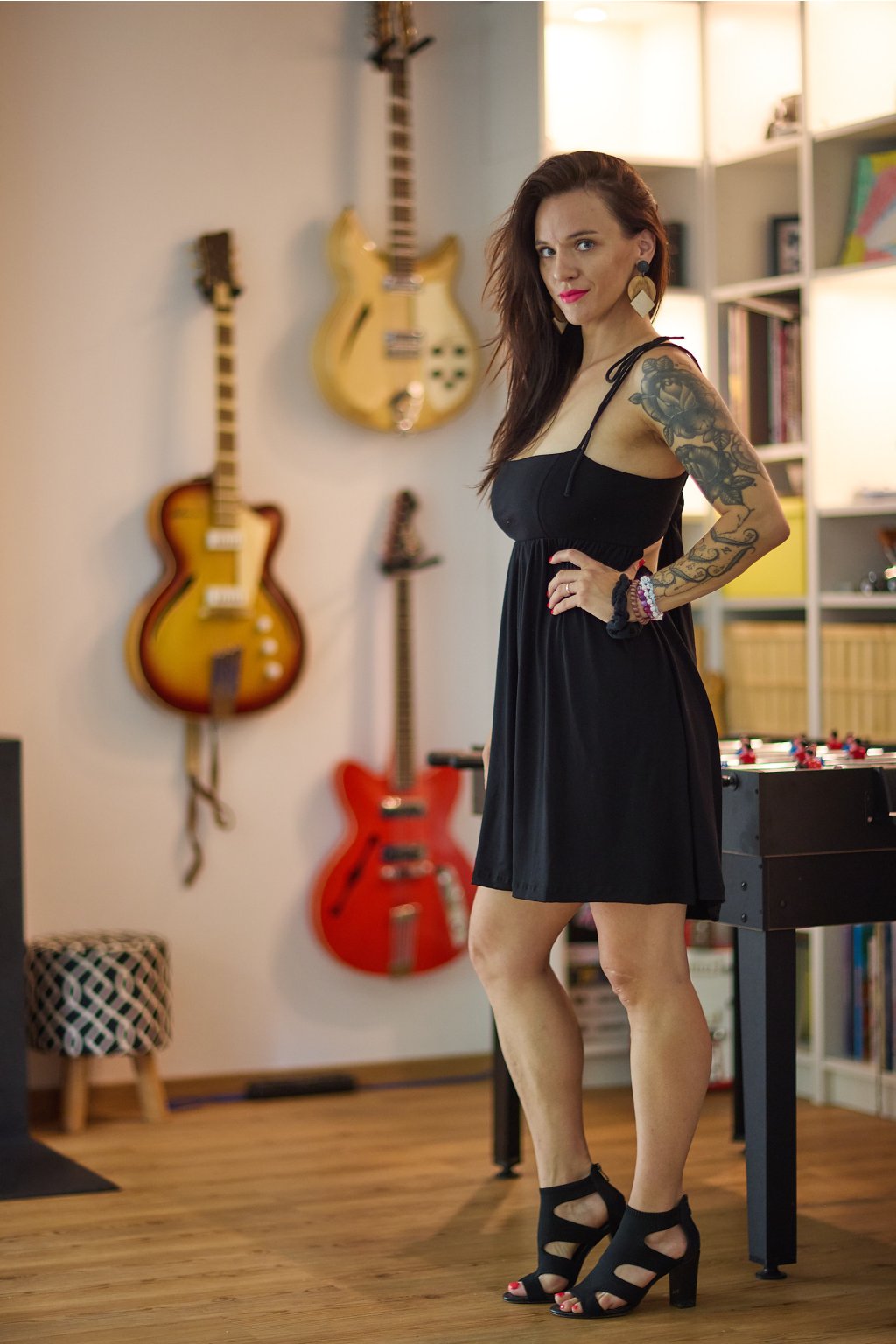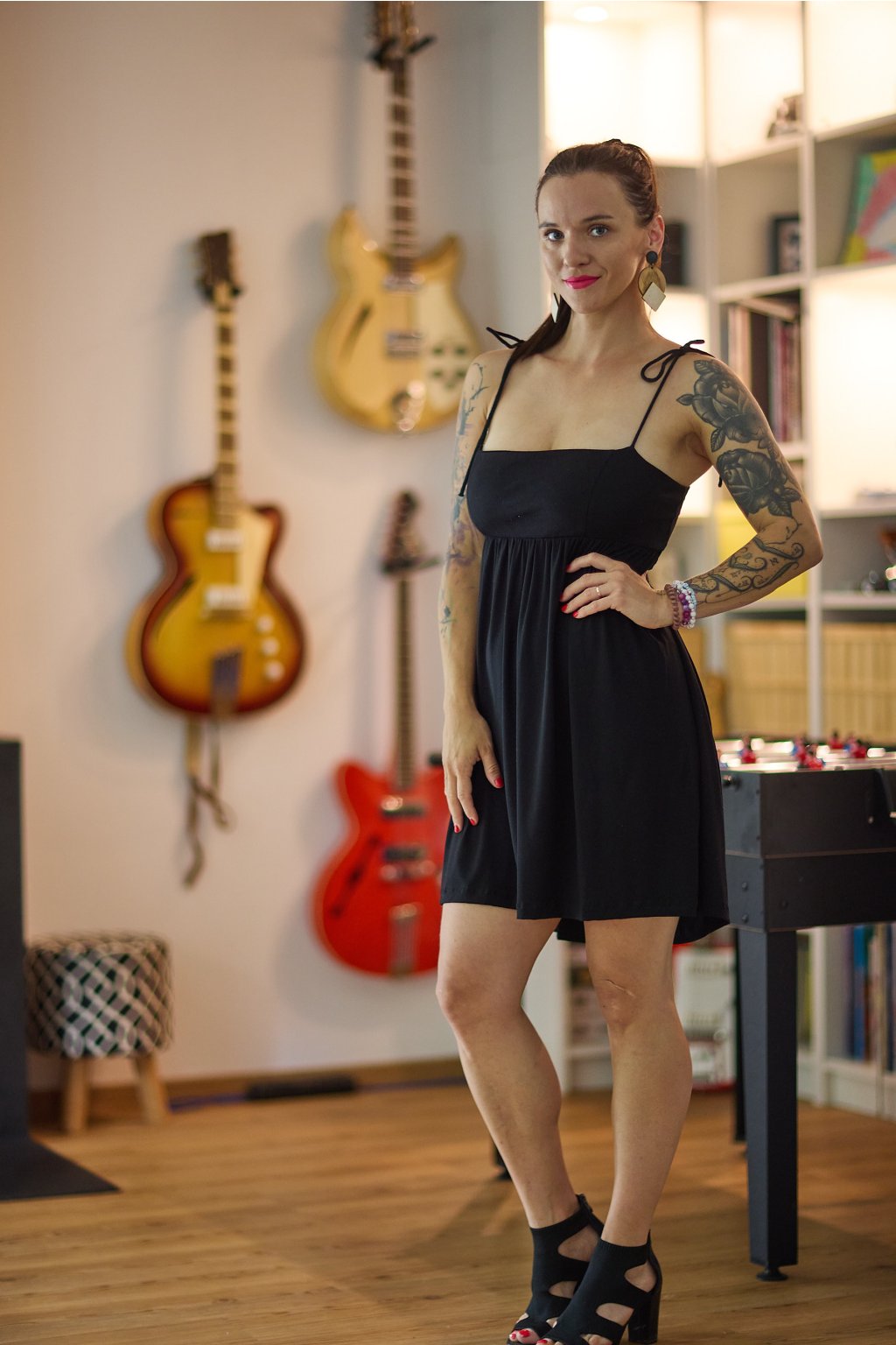 Šaty jsou na ramínka, mají zavazovací top vzadu na mašli, takže jsou dobře nastavitelné. V předním díle podprsenky je uvnitř nažehlený vlizelín, aby lépe držela tvar. Sukně je na zadním díle rafinovaně vykrojená. Šaty mají částečně odhalená záda.