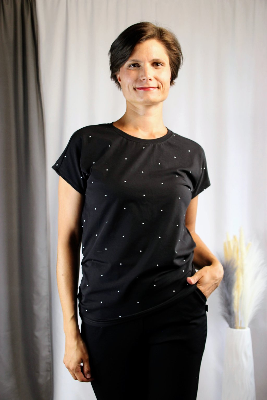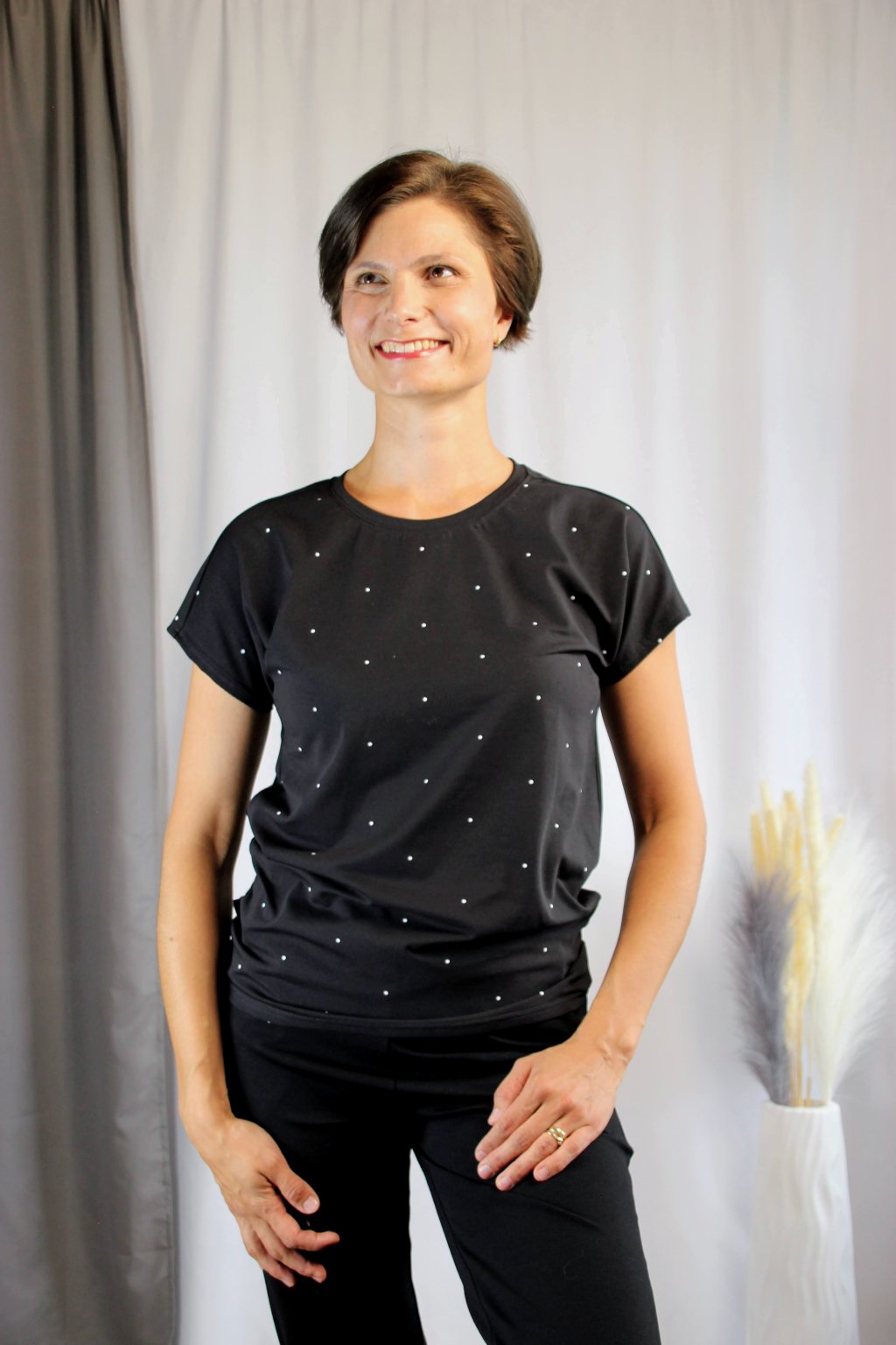 Další důležitou hodnotou je pro ni udržitelná výroba 🌱. Tričko šijeme v Česku, v malých dávkách a s minimálním odpadem, abychom šetřili přírodu a podporovali lokální řemeslníky. Věříme, že móda může být krásná a zároveň ohleduplná. 👗