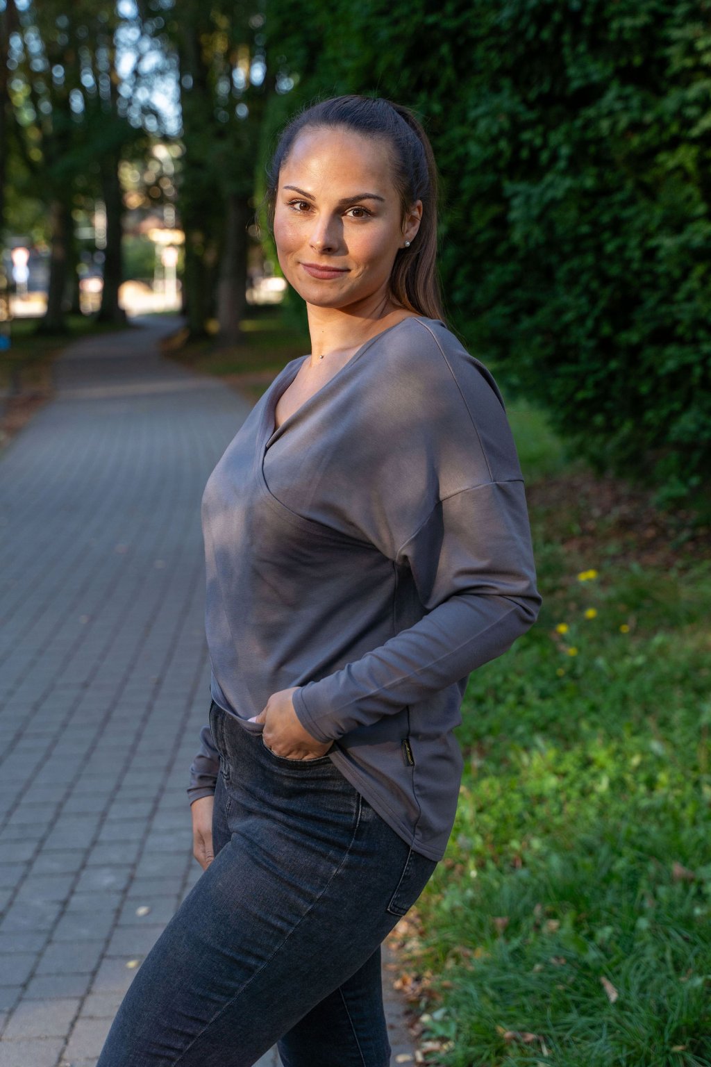 Že je šedá nezajímavá? Naopak! V téhle barvě se skrývá rafinovanost a šmrnc – je nenápadná, ale právě proto si s ní můžete chytře pohrát. Je jen na vás, jestli ji oživíte barevnými doplňky, nebo necháte vyniknout její čistou eleganci. V grafitově šedém zavinovacím topu se budete vždy cítit svá – ať už si ho obléknete do práce, na setkání s přáteli nebo na večerní procházku městem. 🩶