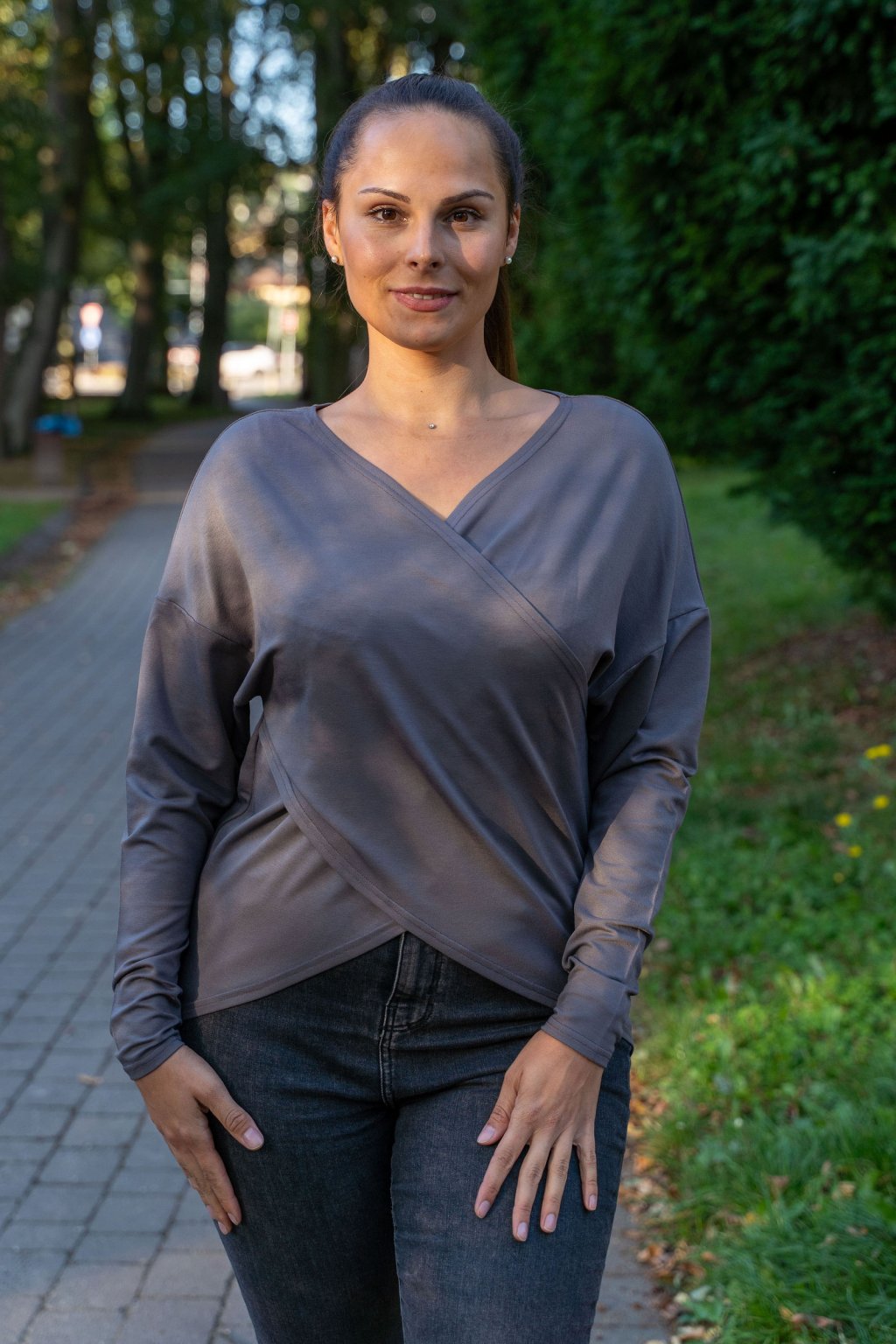 Přestože tento dámský top nevypadá na první pohled jako kojicí, miminko v něm díky zavinovacímu střihu pohodlně nakojíte – bez nutnosti složitě manipulovat se zipy. Je to přirozené, jednoduché a praktické řešení, které ocení každá máma.