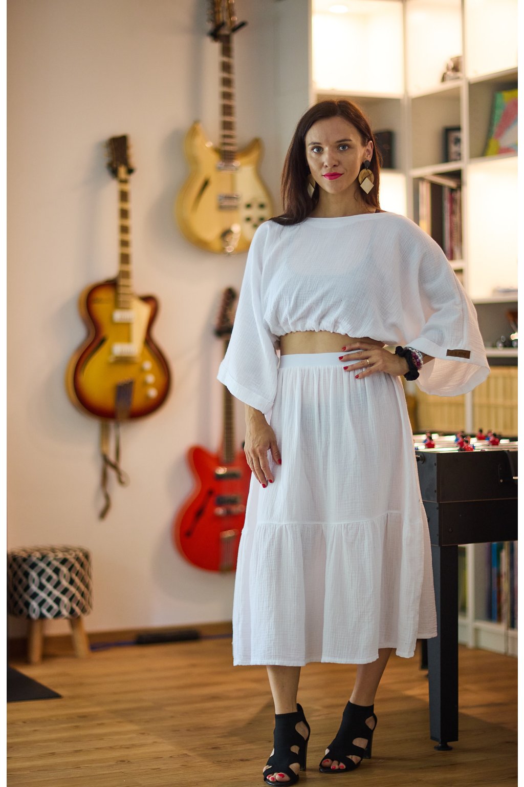 Top je ušitý z bavlněného mušelínu. V pase je nastavitelný gumičkou. Uni velikost sedí od XS do XL.