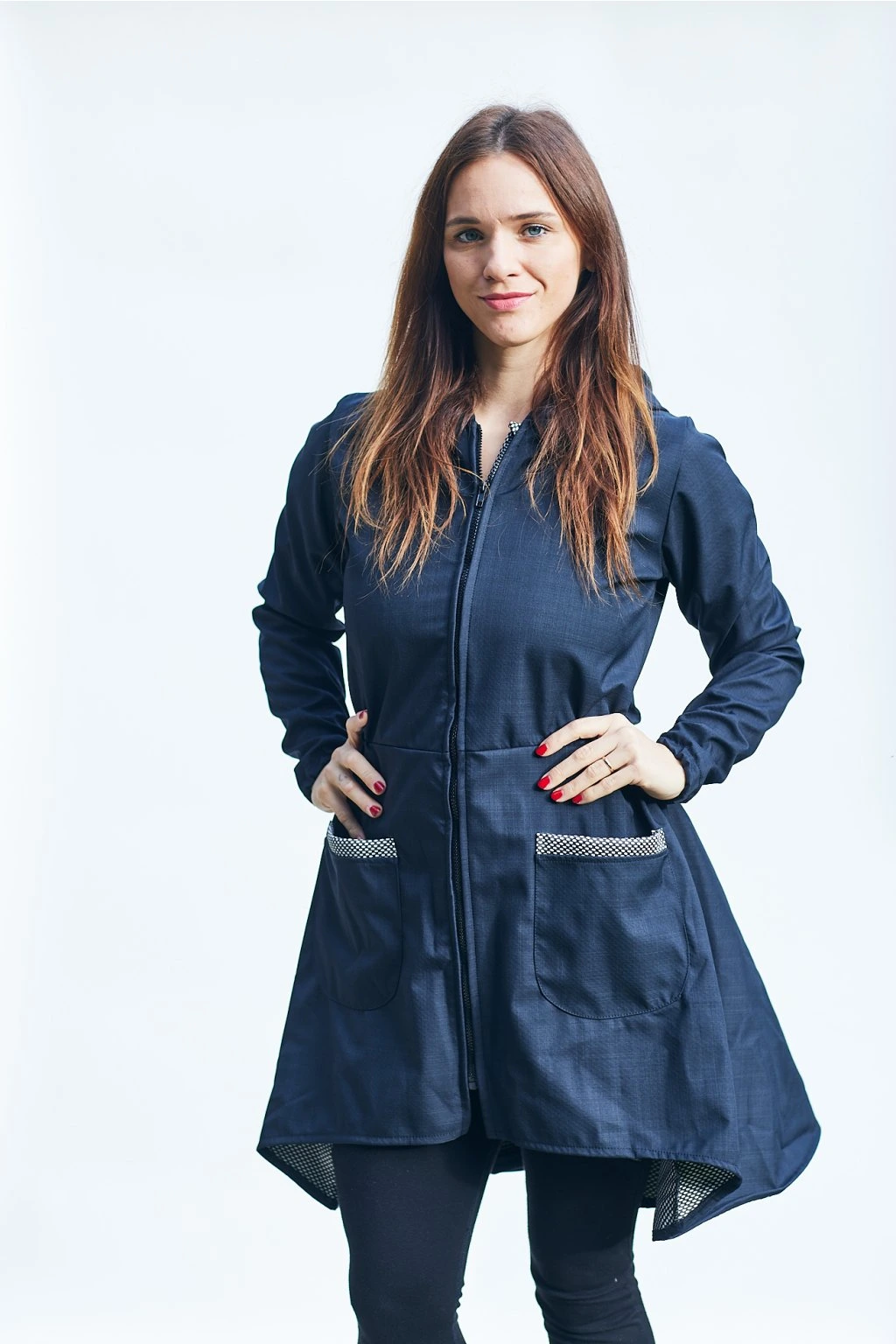 Má okrasnou nabíranou sukni. Vpředu je na zip do sportovnějšího stylu s kapsami. Barva je černá se vzorkem. Kabátek se dá nosit na jaře, na podzim, s teplejšími vrstvami i v zimě.