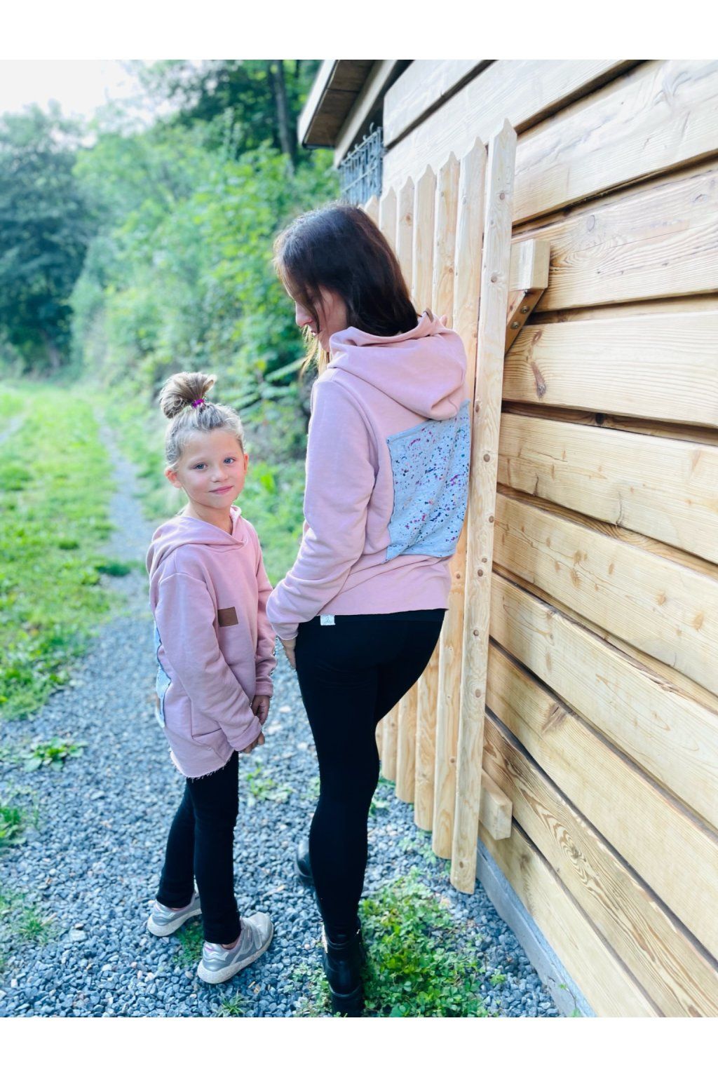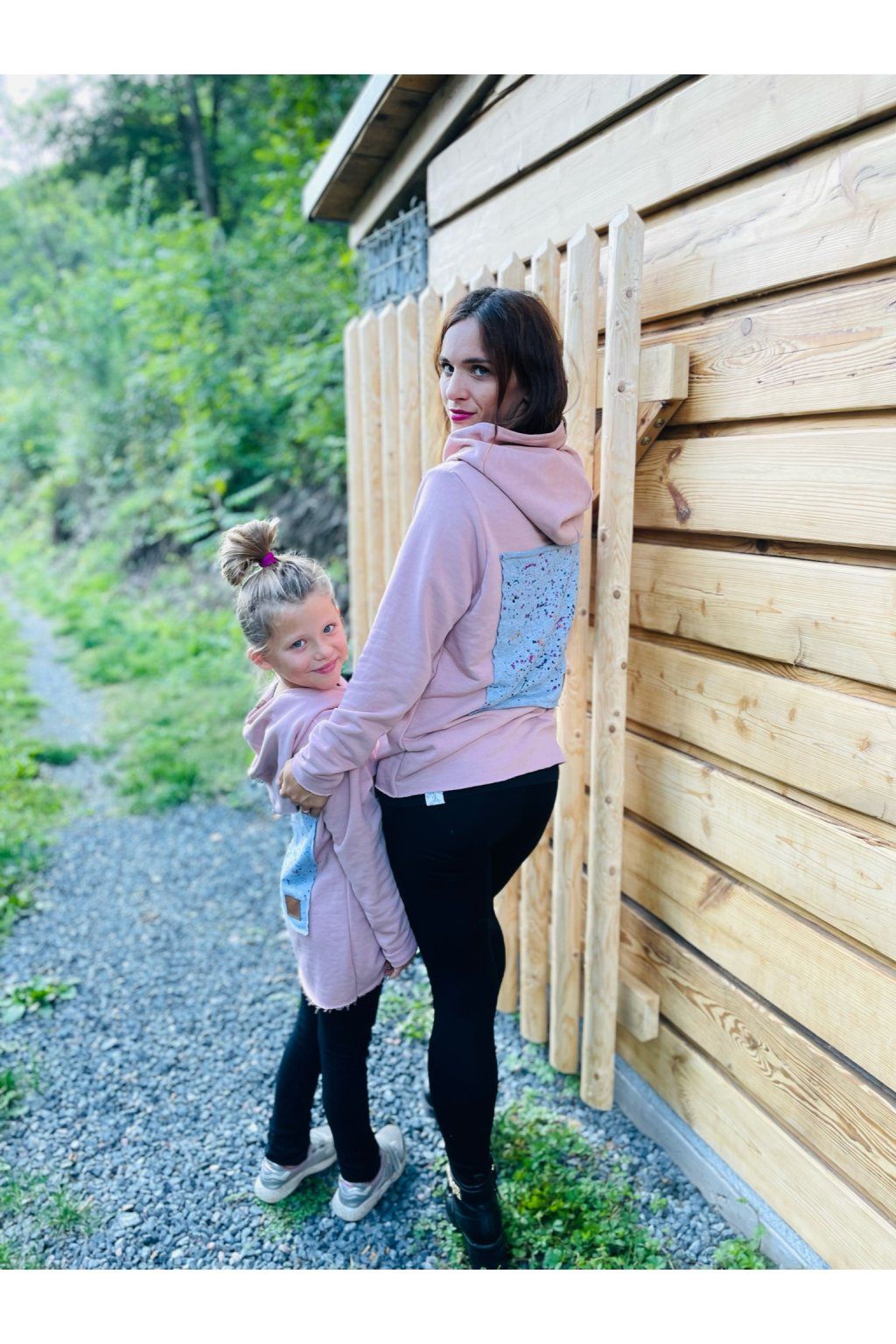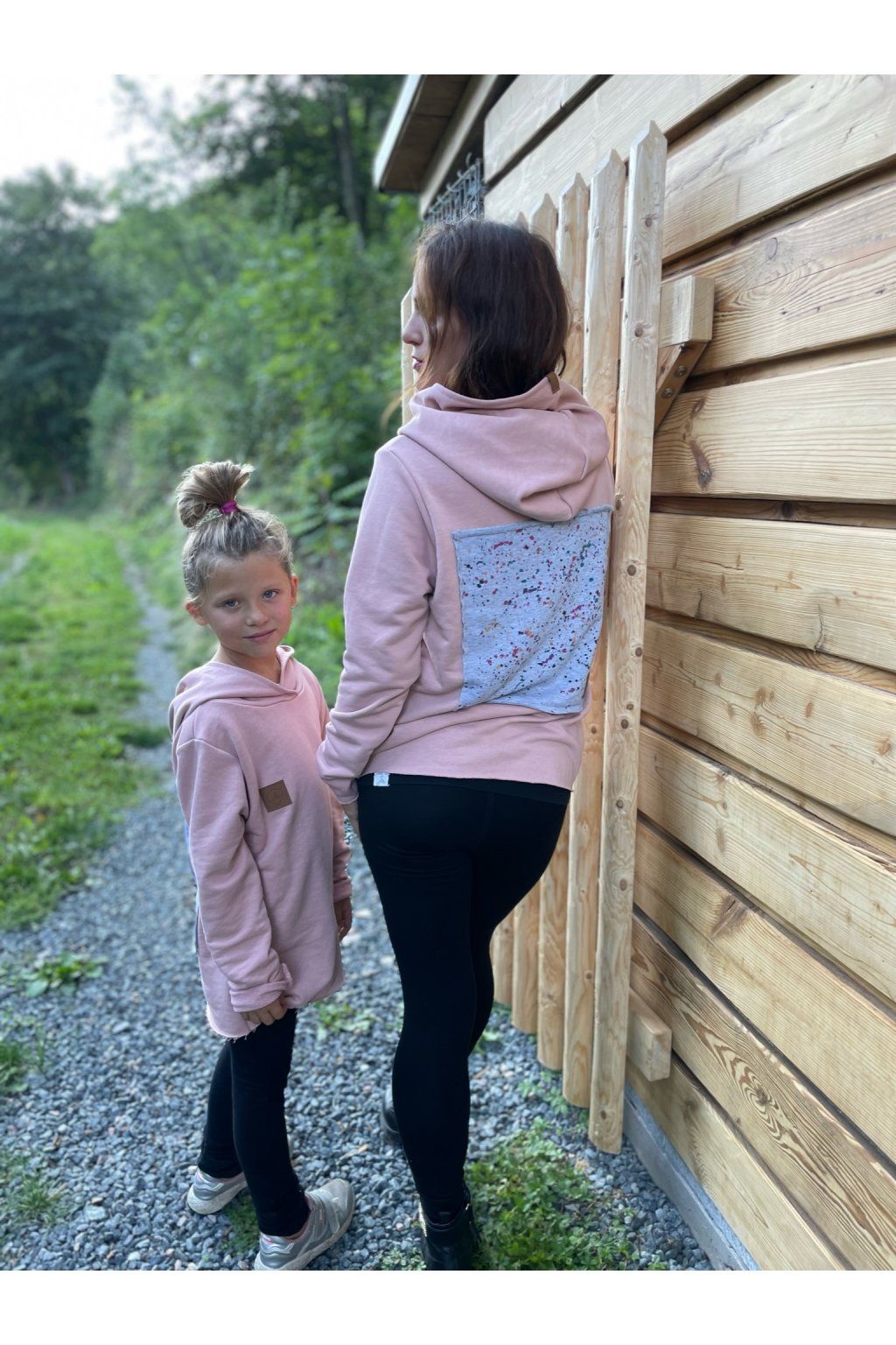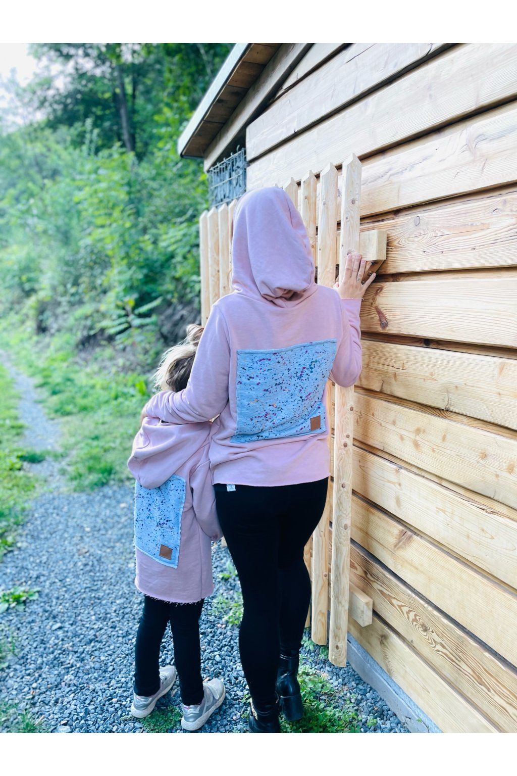 Stylová mikina má spíše volnější střih, je ušitá ze světle růžové teplákoviny, která se na okrajích třepí. Mikina má kapuci a vzadu obrázek, který zvlášť kreslíme, takže každý je originál.