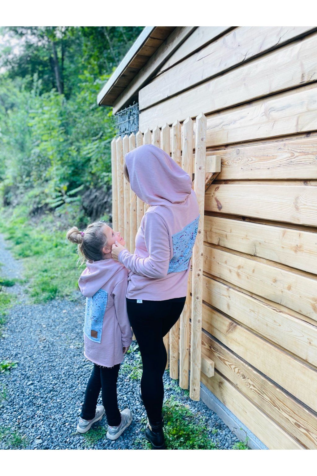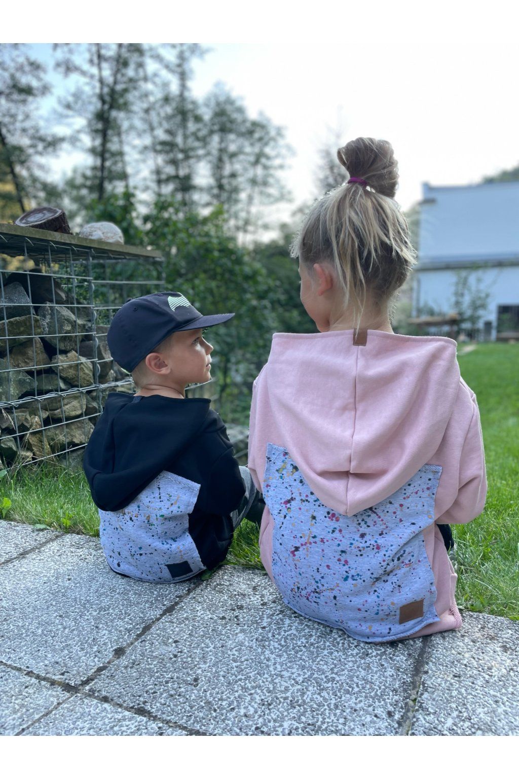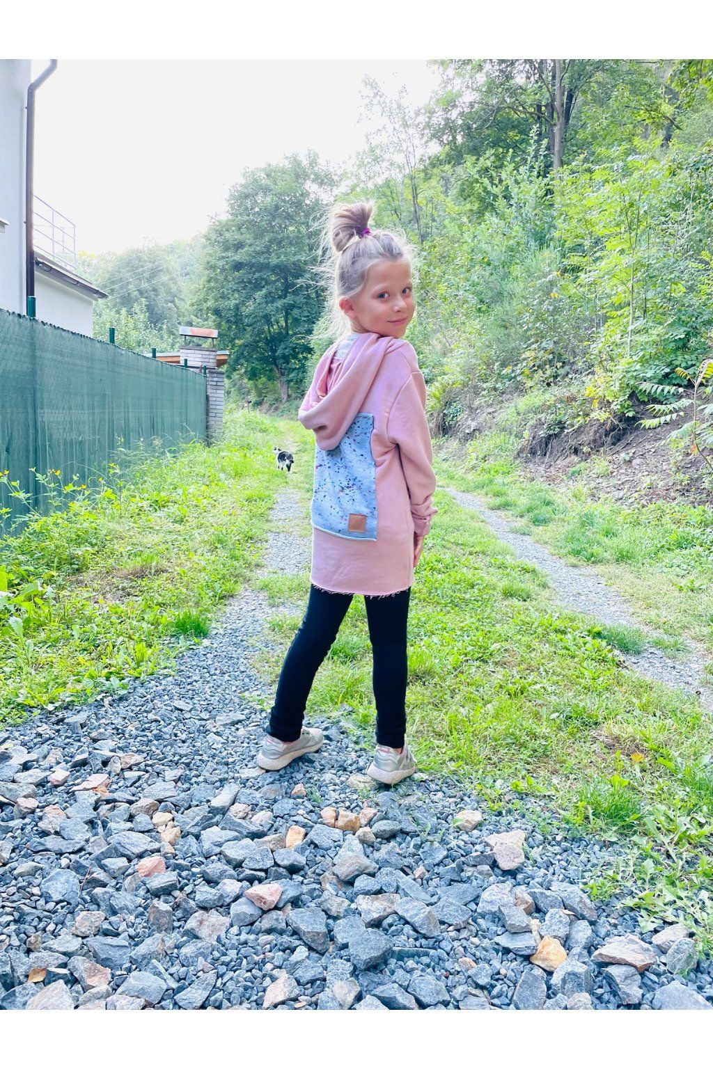 Stylová mikina má spíše volnější střih, je ušitá ze světle růžové teplákoviny, která se na okrajích třepí. Mikina má kapuci a vzadu obrázek, který zvlášť kreslíme, takže každý je originál.