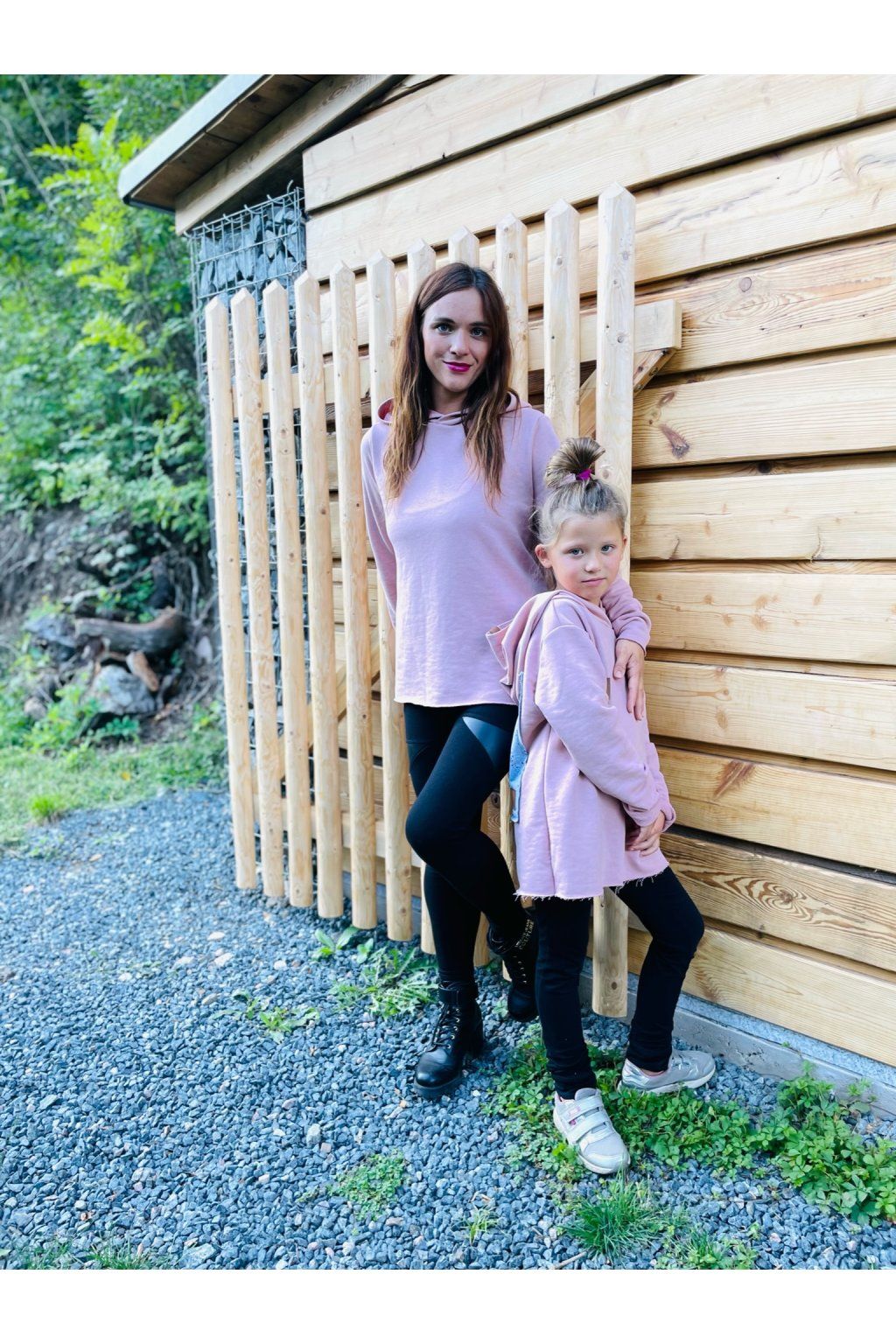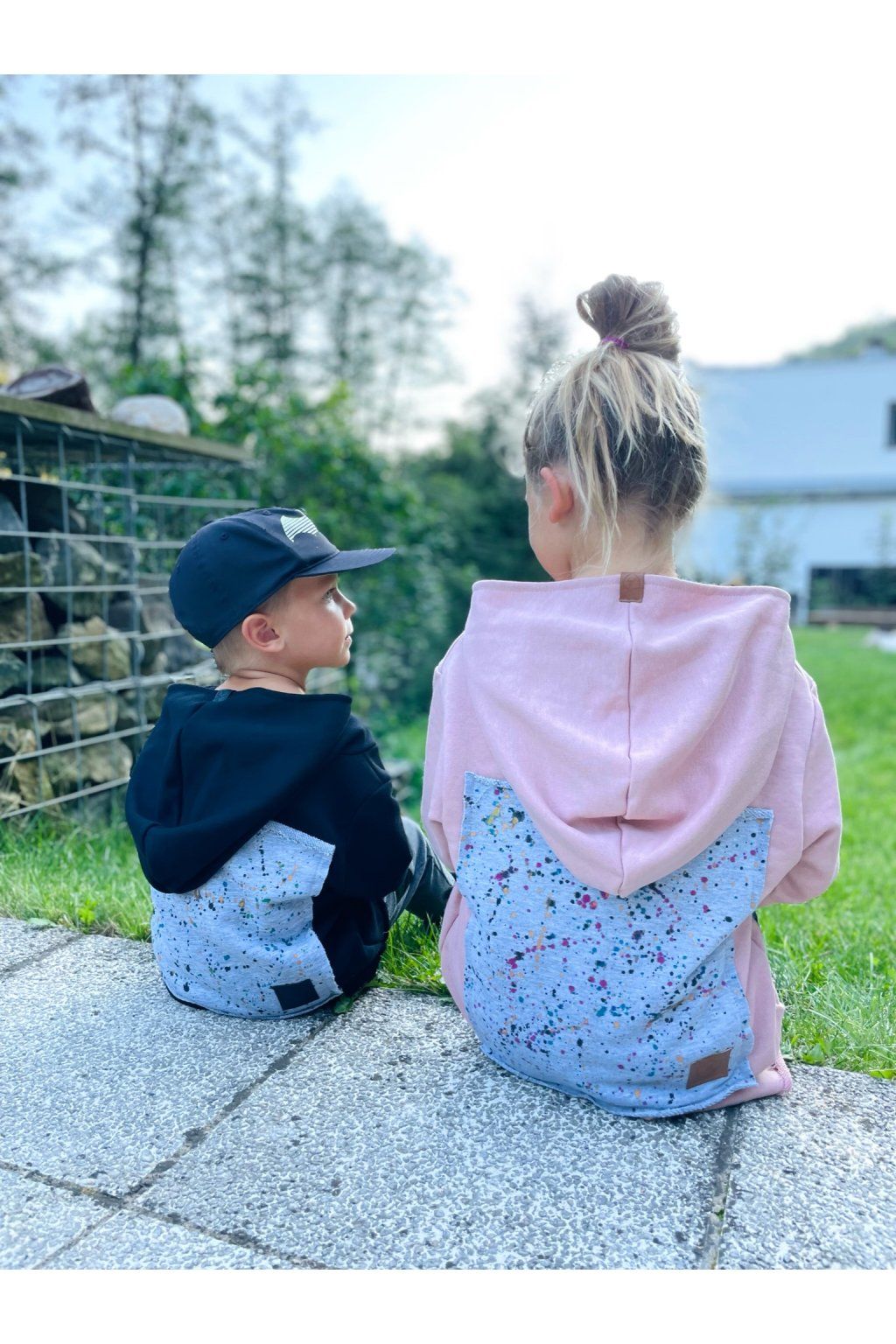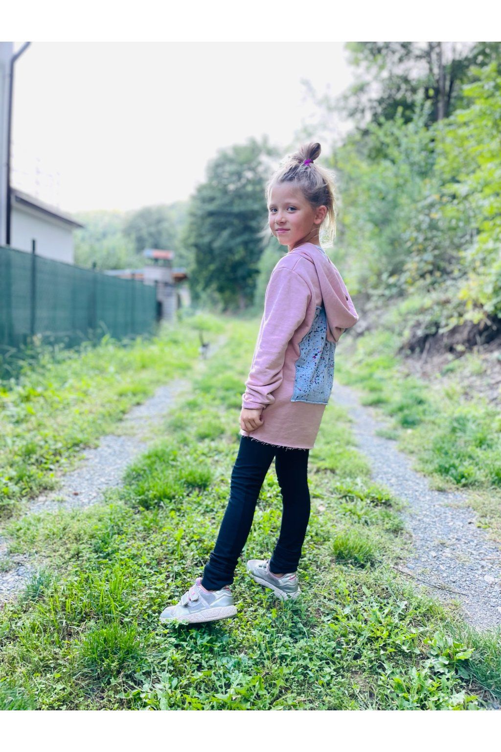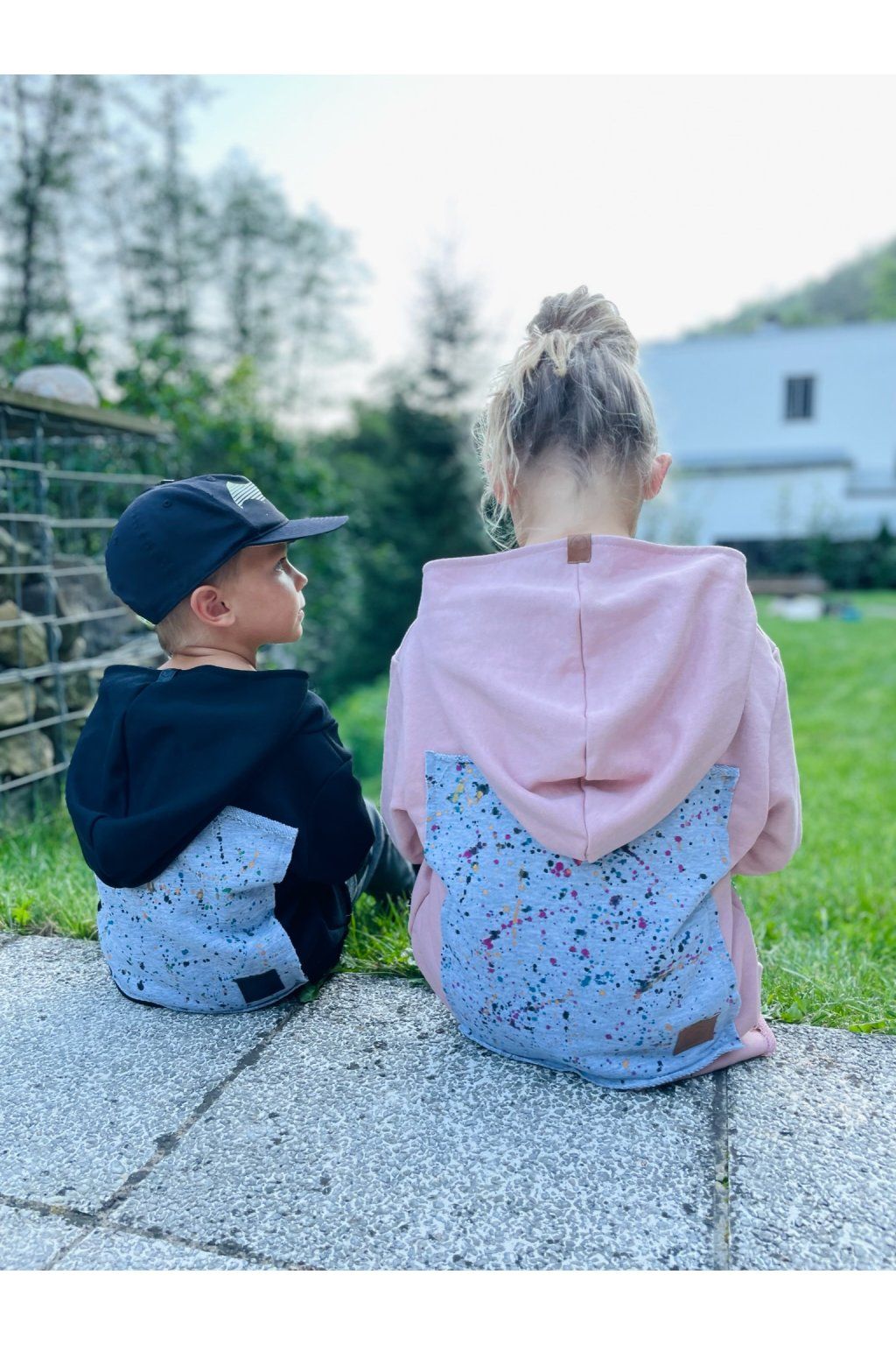Stylová mikina má spíše volnější střih, je ušitá ze světle růžové teplákoviny, která se na okrajích třepí. Mikina má kapuci a vzadu obrázek, který zvlášť kreslíme, takže každý je originál.