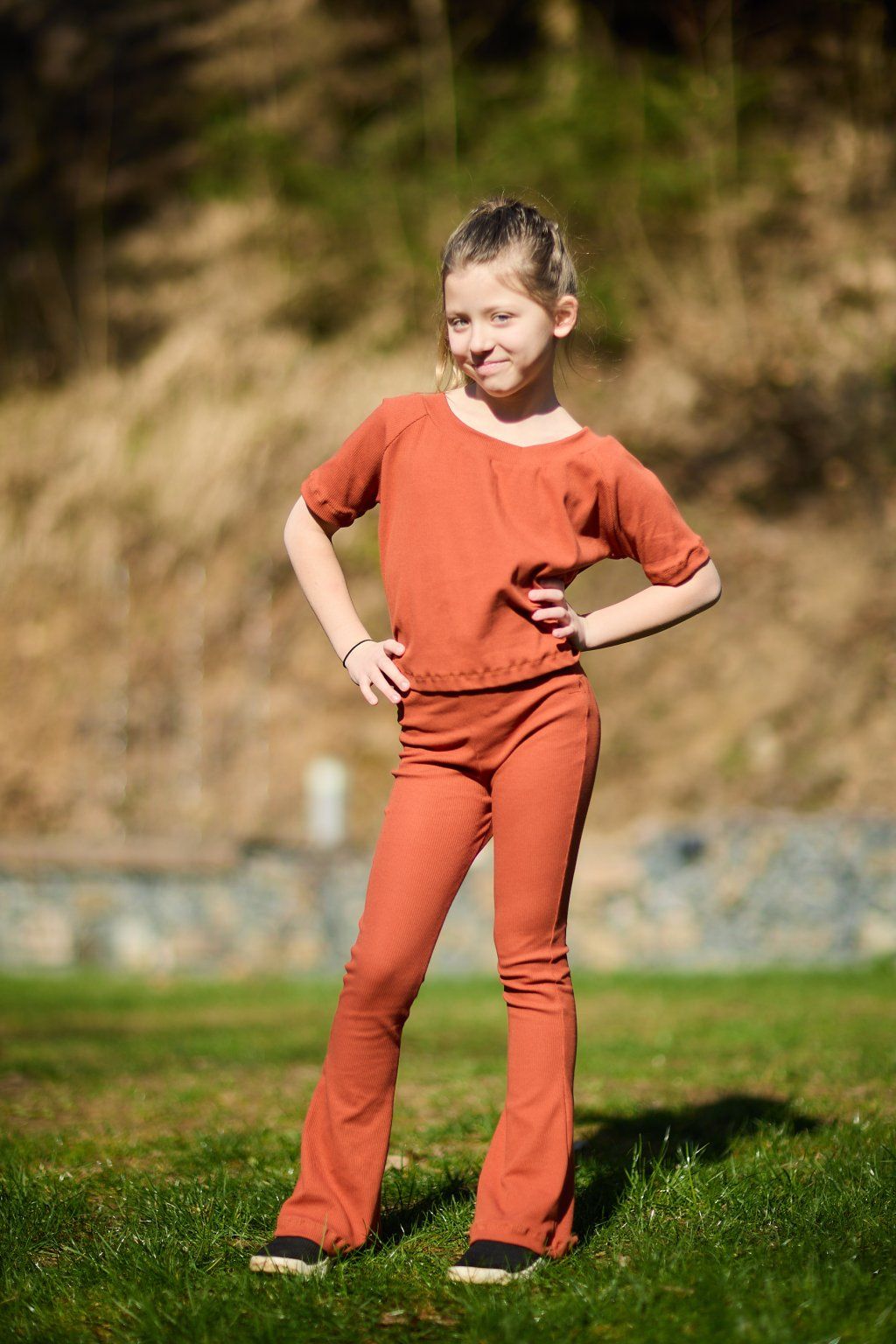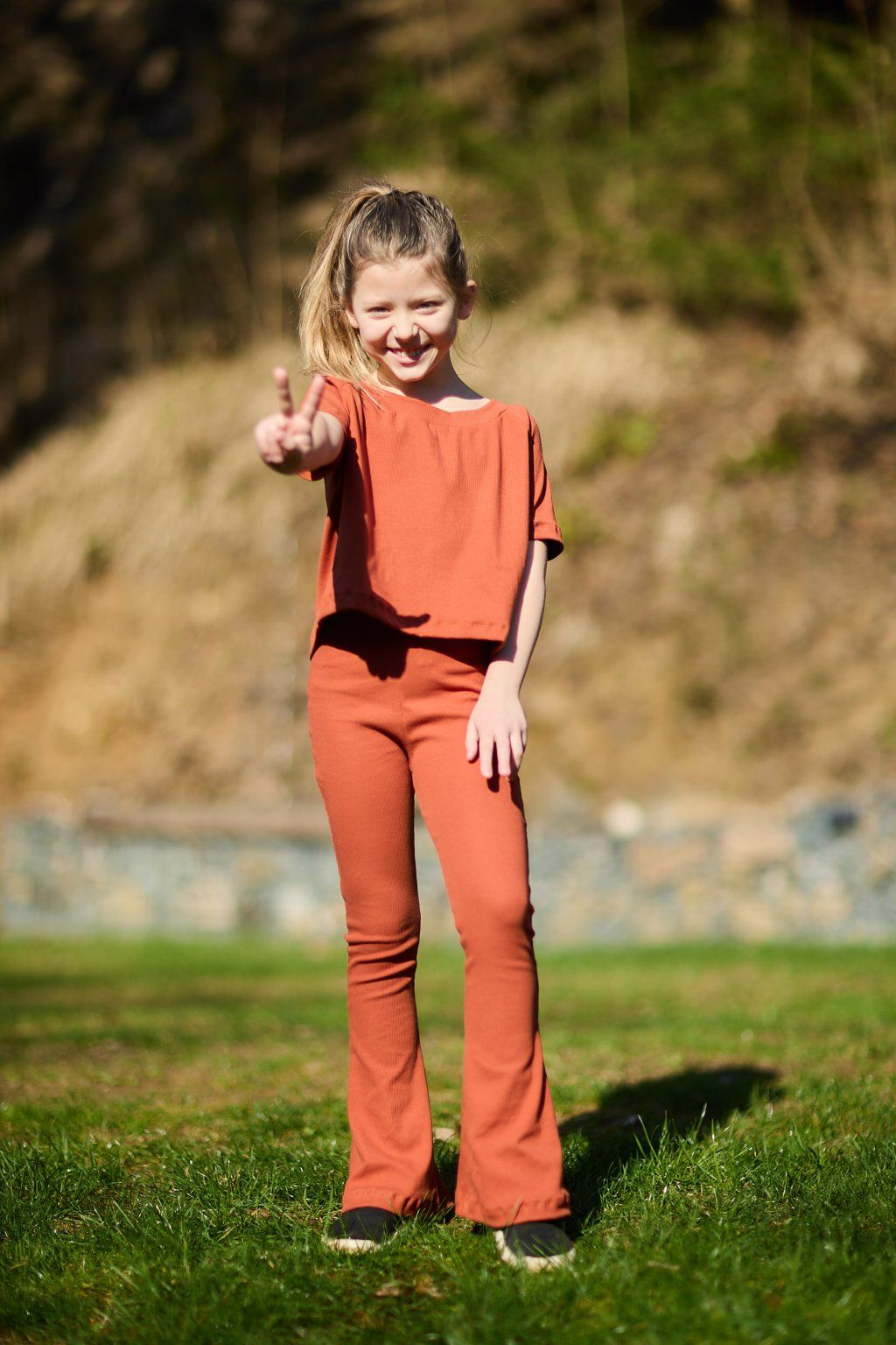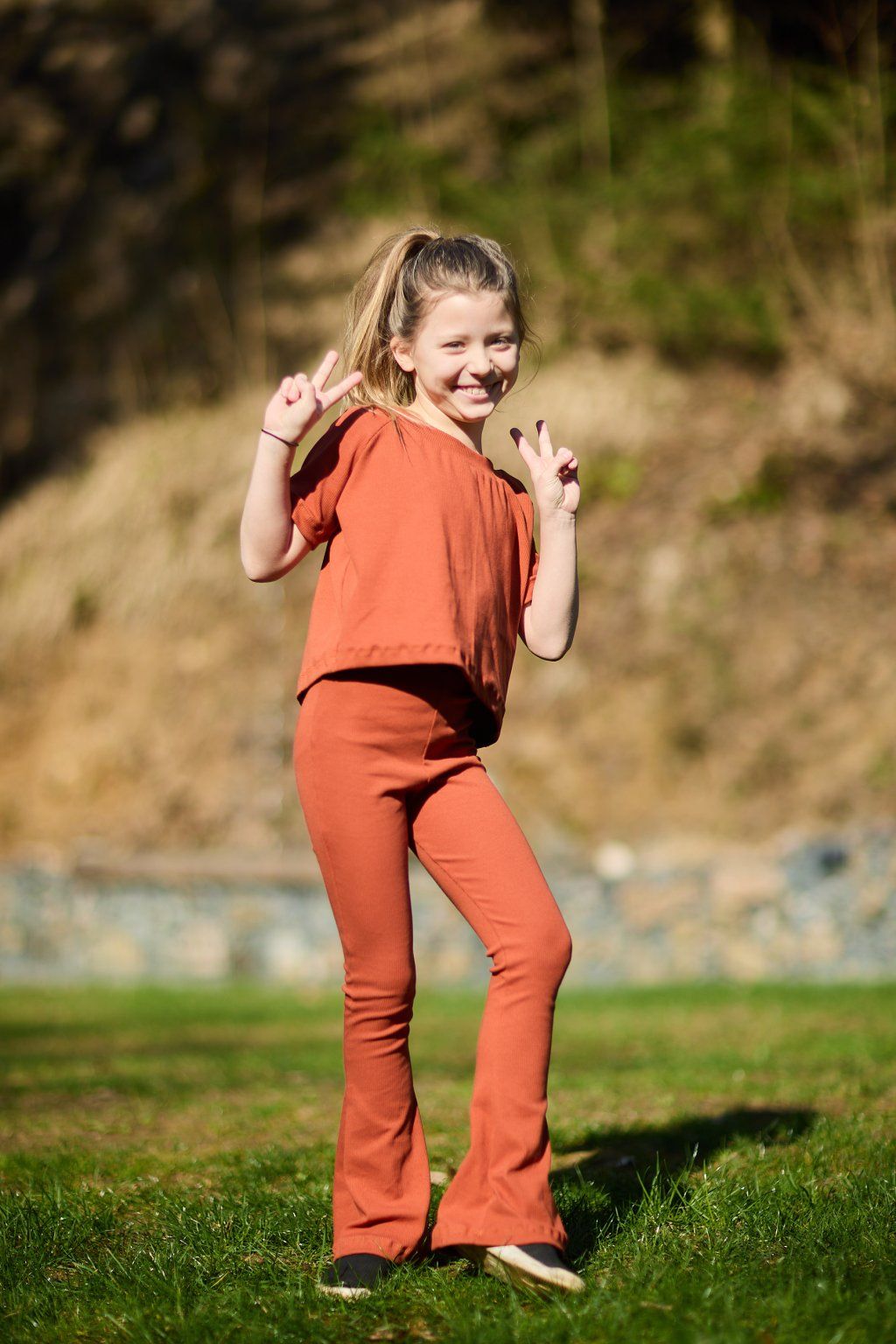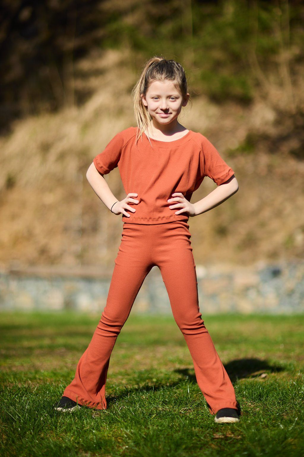 Kalhoty velikostně odpovídají a sedí dobře. CROP TOP má volnější střih. Modelka na fotografii měří 136 cm a na sobě má velikost 134/140.