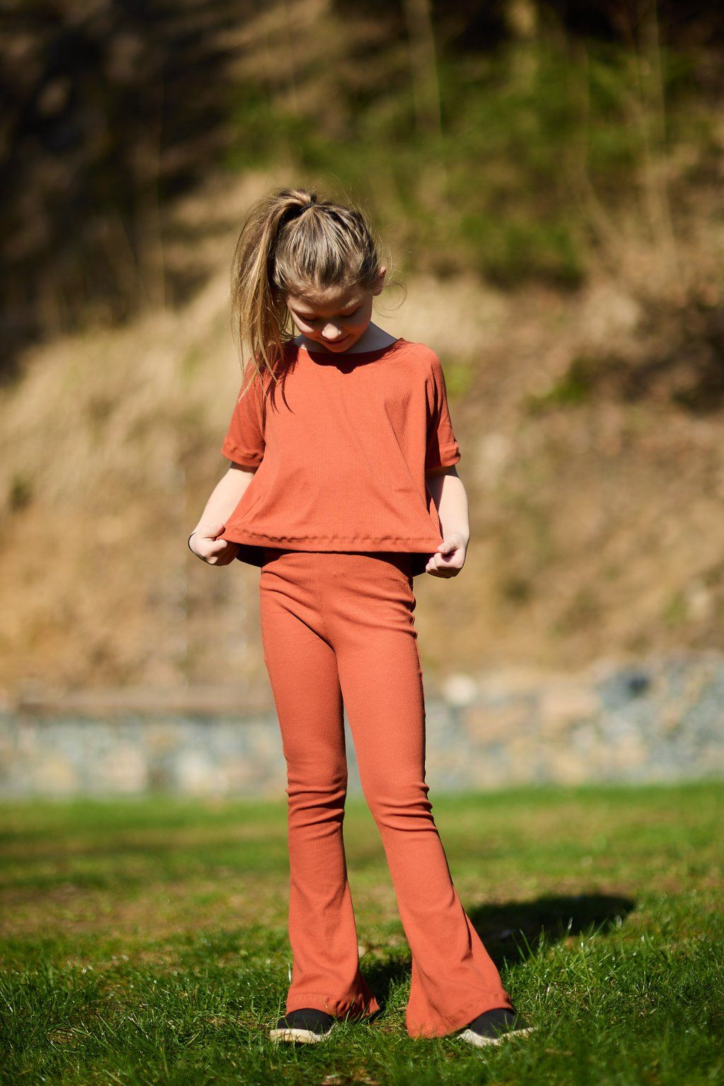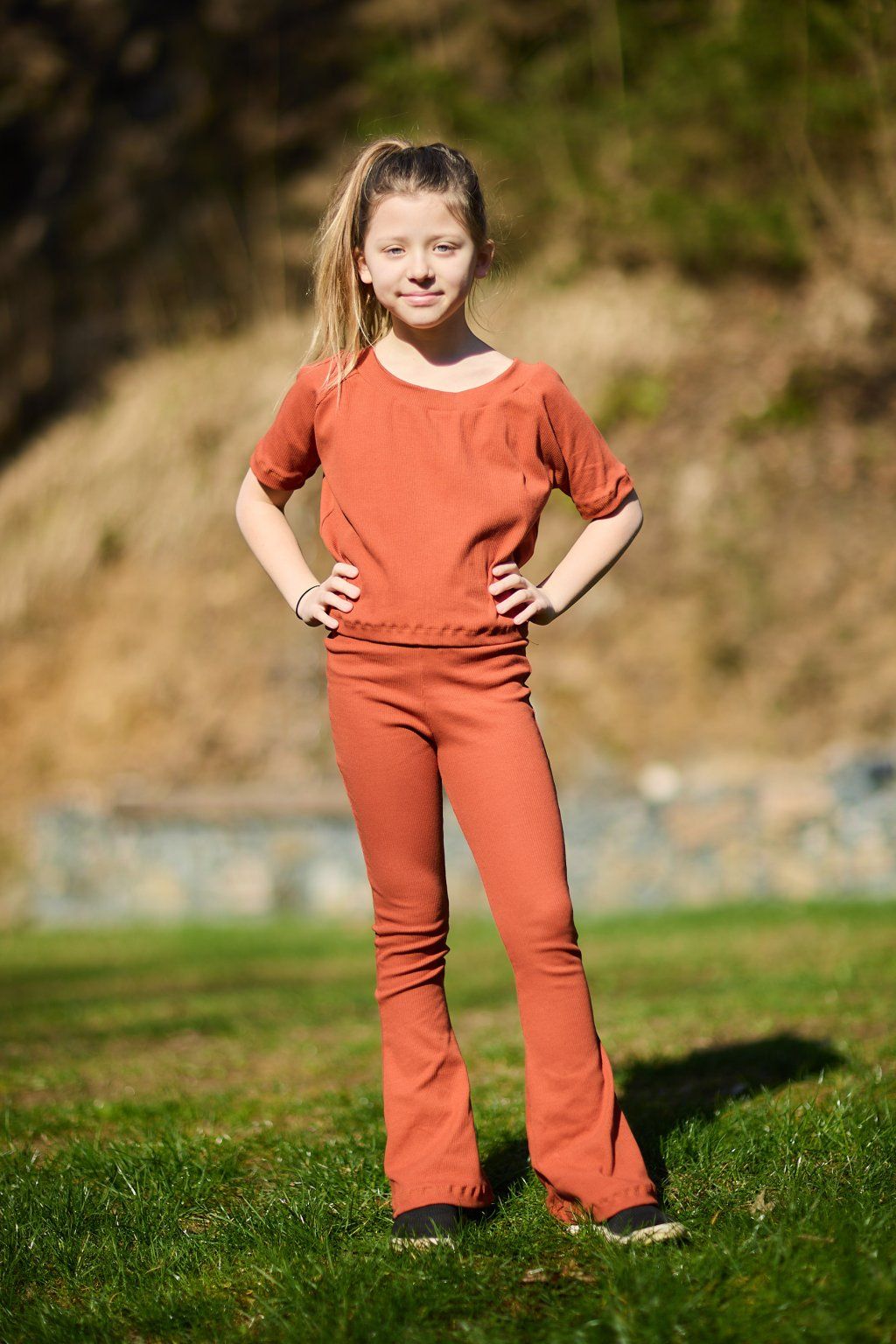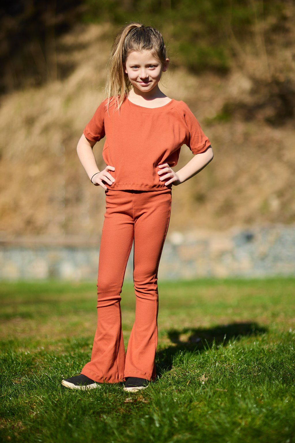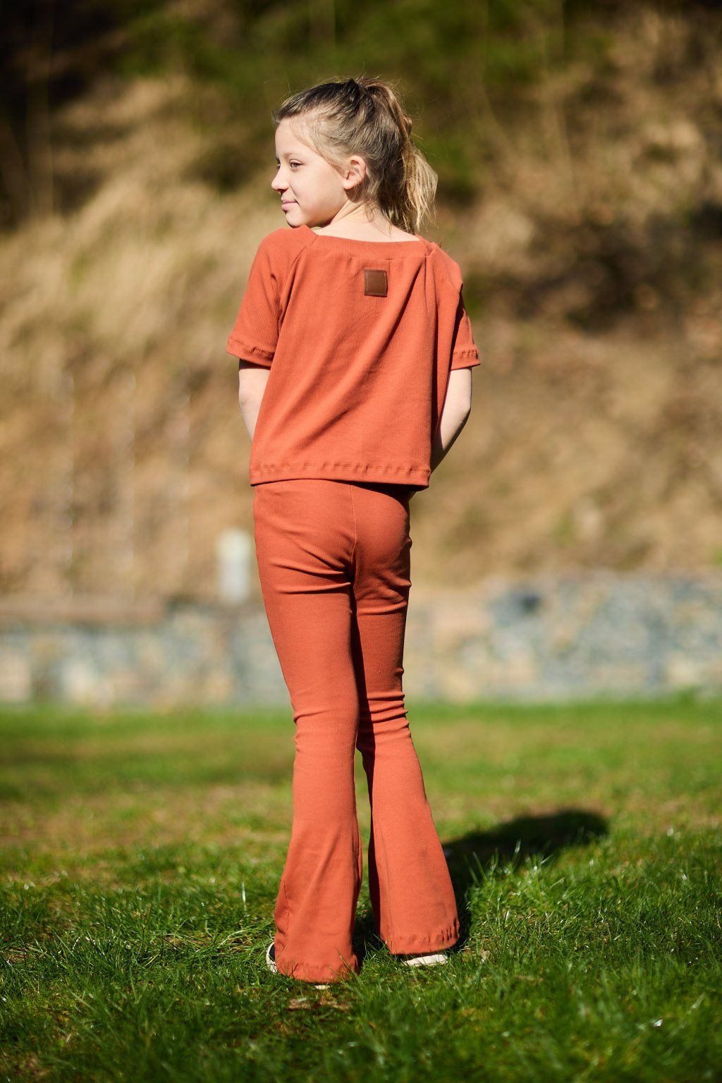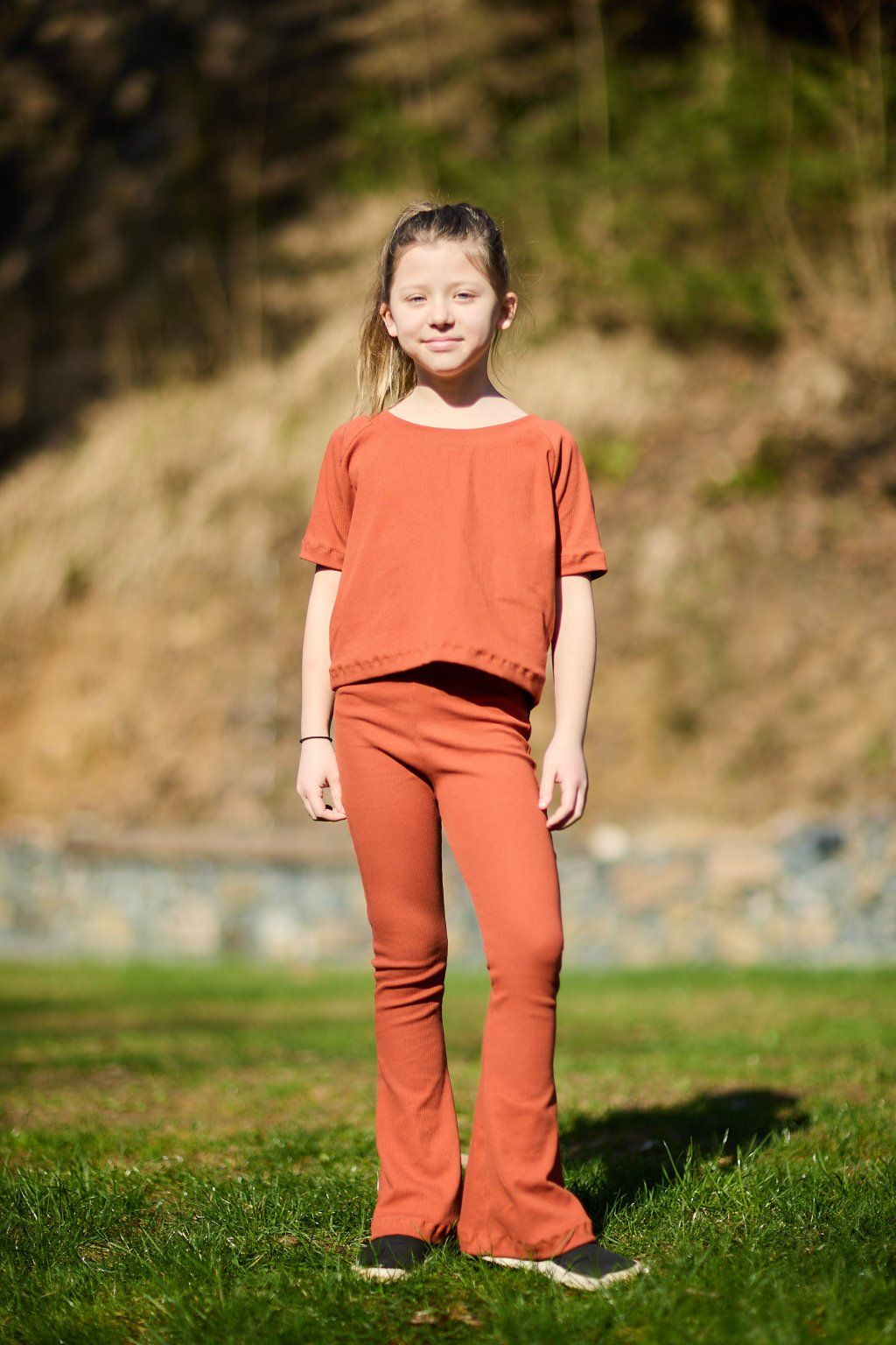Kalhoty velikostně odpovídají a sedí dobře. CROP TOP má volnější střih. Modelka na fotografii měří 136 cm a na sobě má velikost 134/140.