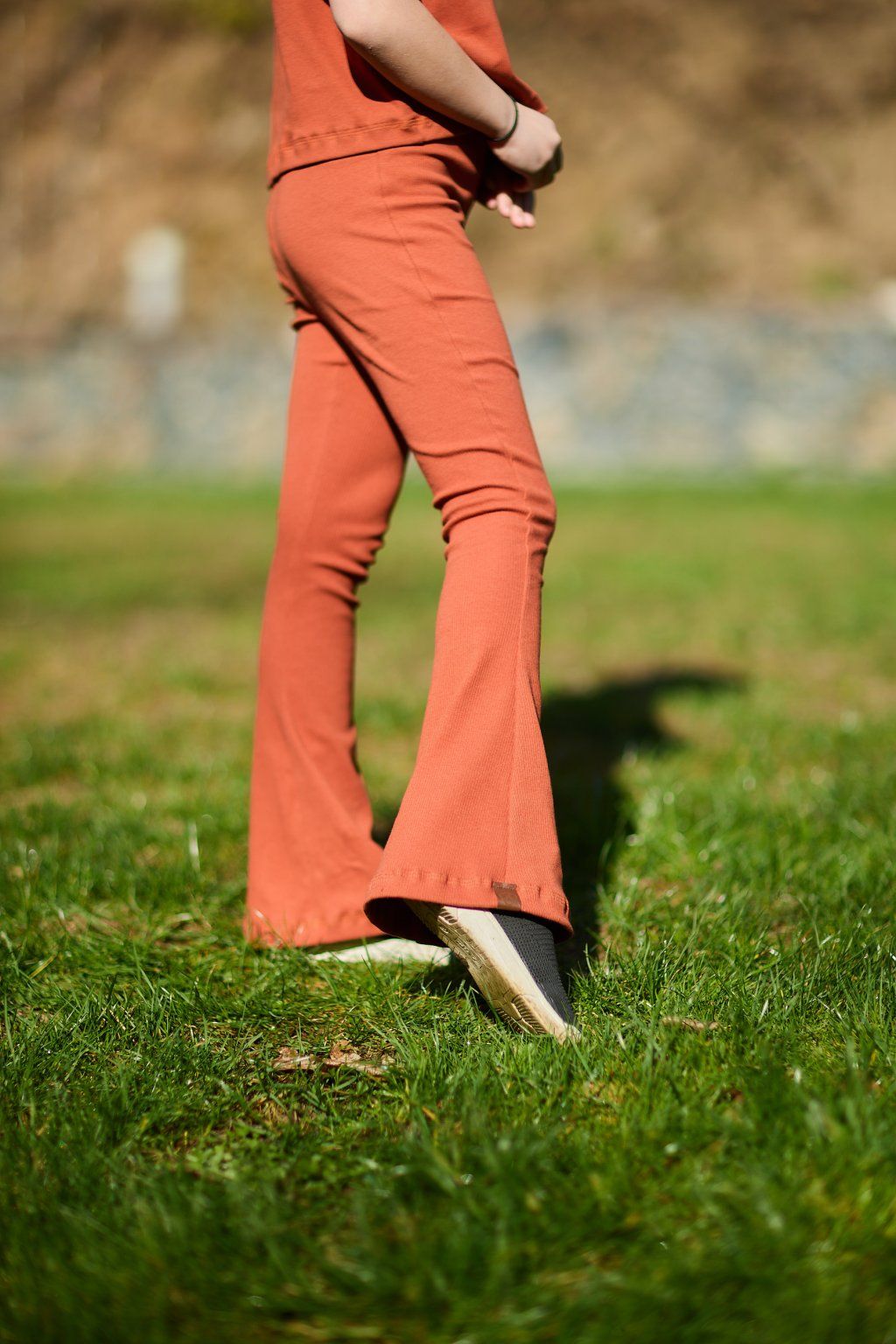 Zvonové kalhoty jsou ušité z příjemného žebrovaného úpletu. Je elastický, měkký a příjemný na nošení.