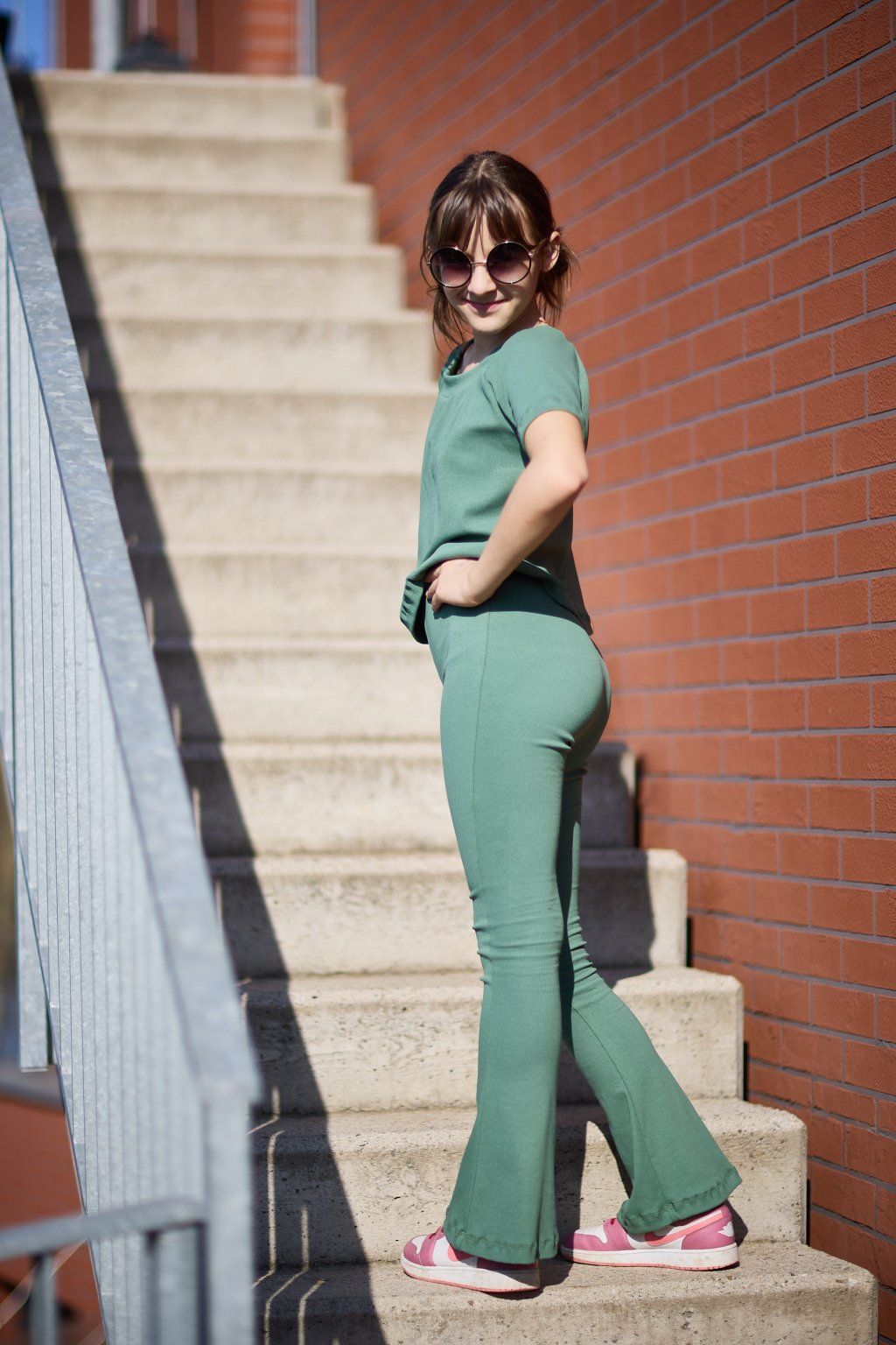 Zvonové kalhoty jsou ušité z příjemného žebrovaného úpletu. Je elastický, měkký a příjemný na nošení.