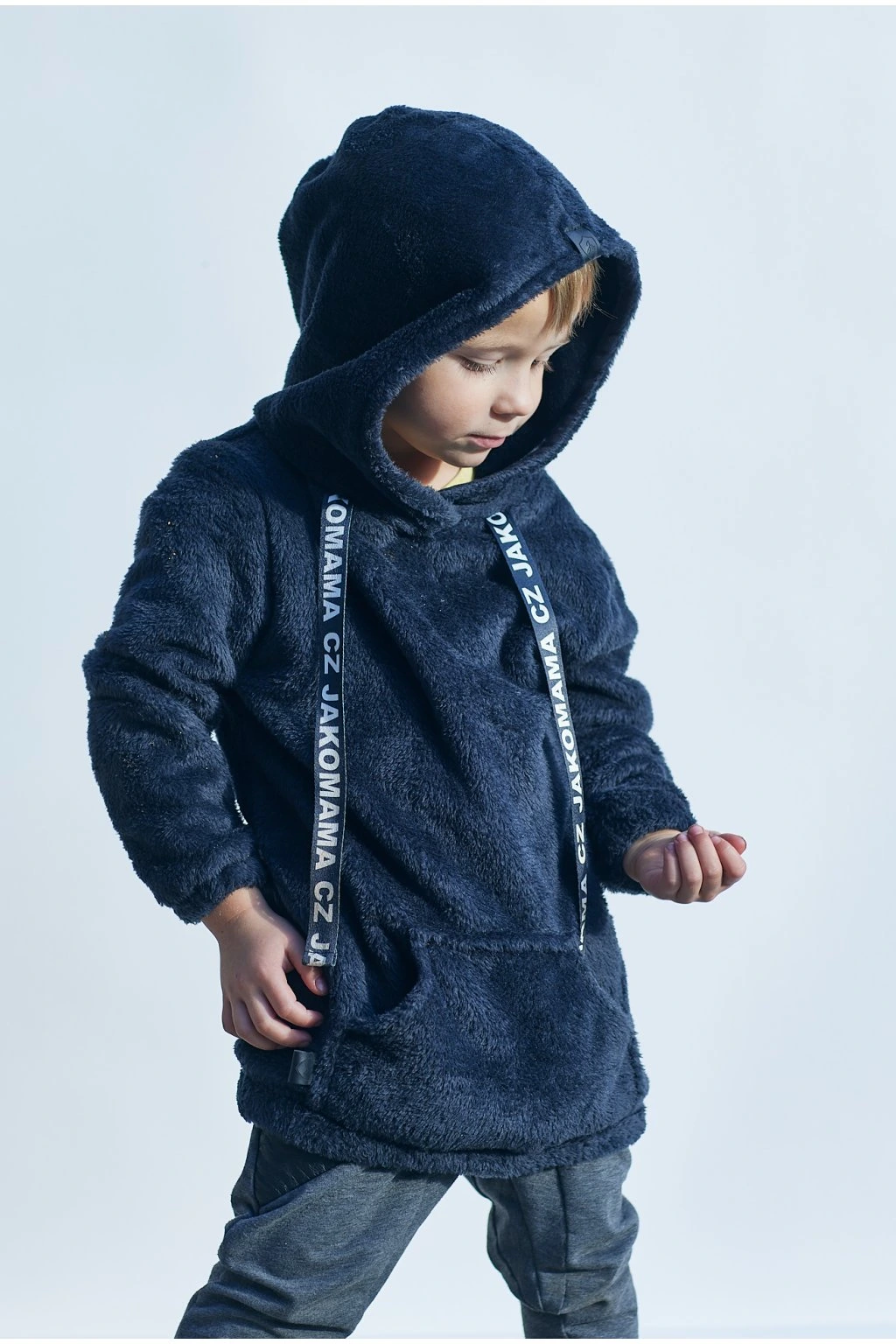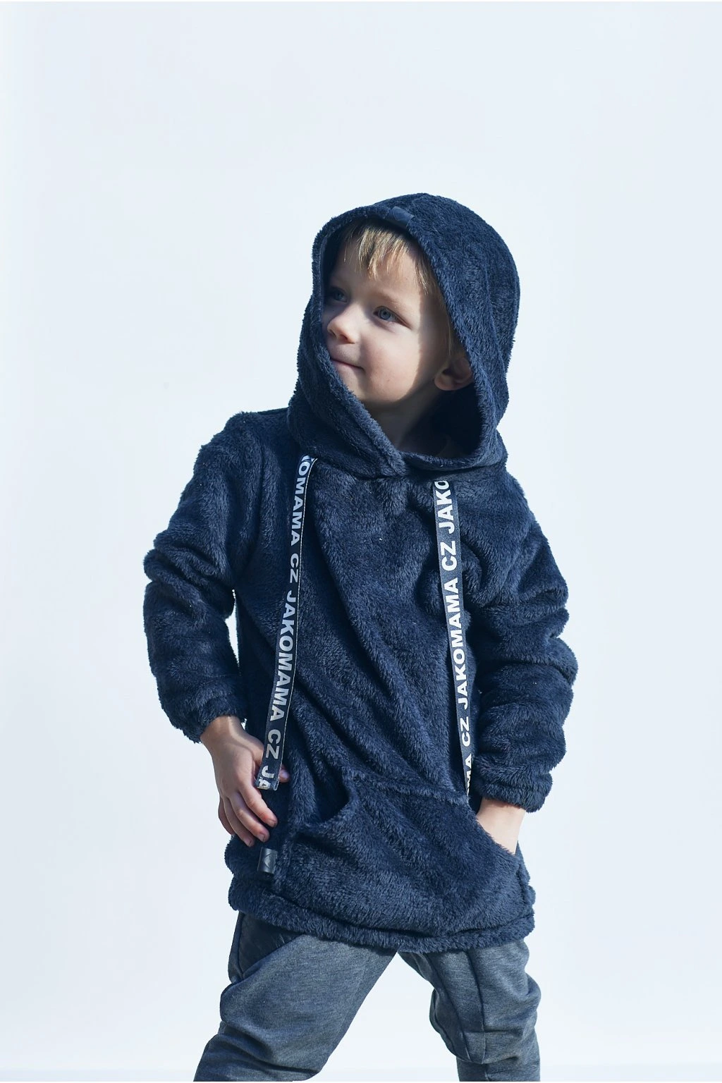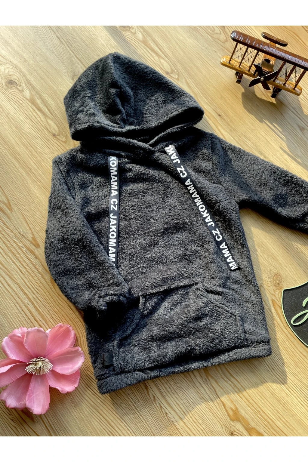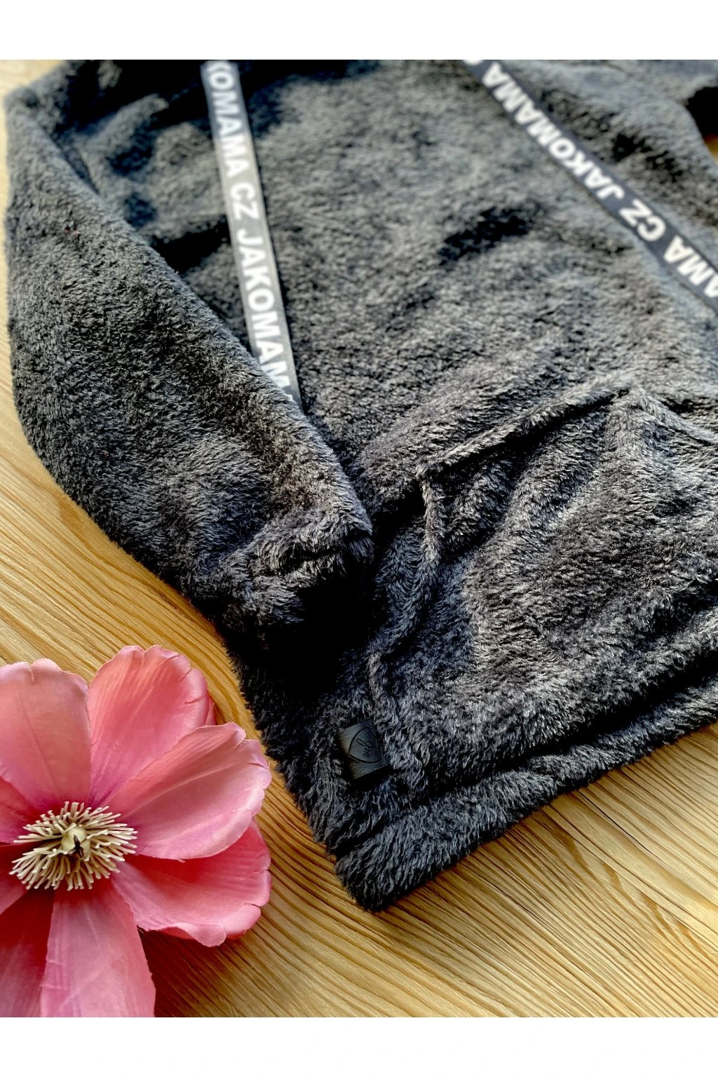 Teploučká zimní mikina má volnější a delší střih. Je ušitá z černého chlupatého fleecu. Spodní lem a rukávy jsou zakončené gumičkou. Mikina má kapuci a vpředu kapsu ze stejného materiálu. Ozdobená je vpředu saténovou stuhou s nápisem JAKOMAMA CZ.