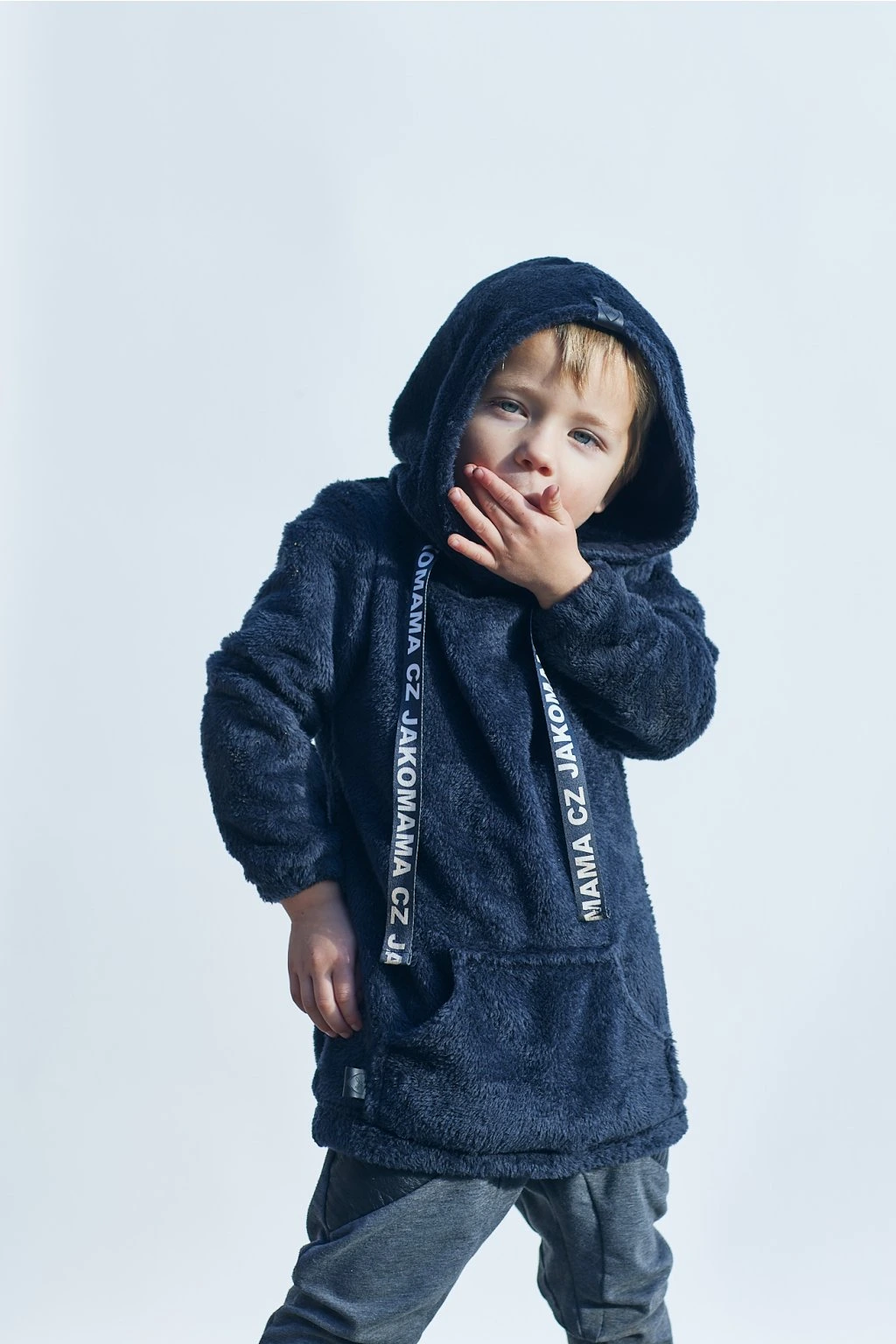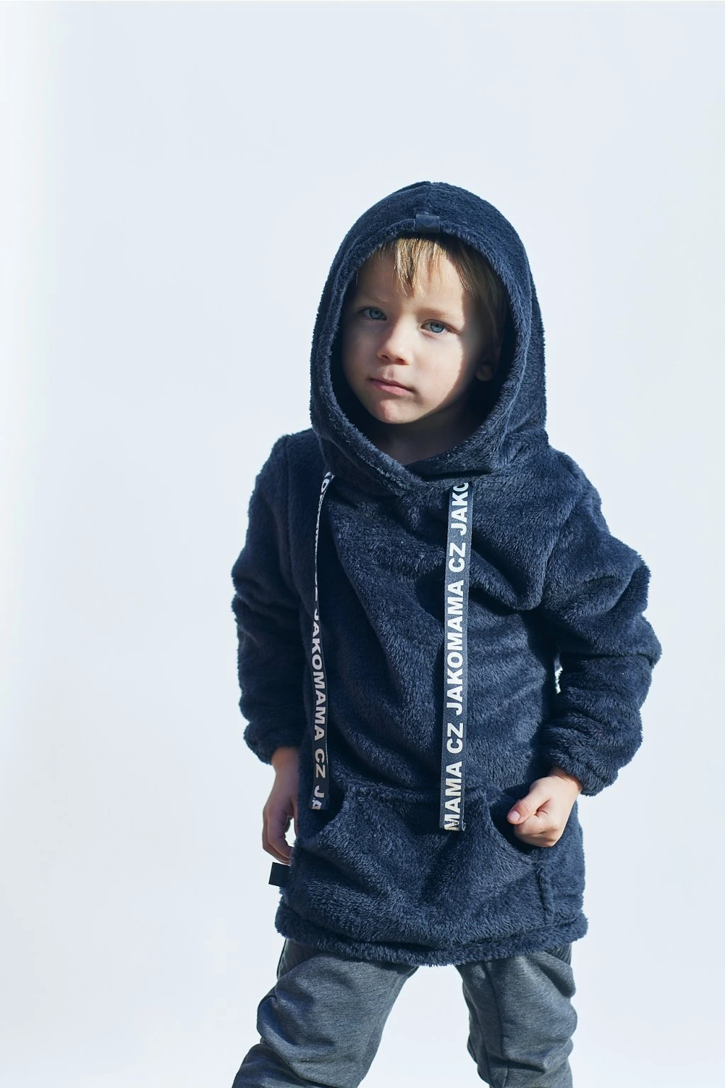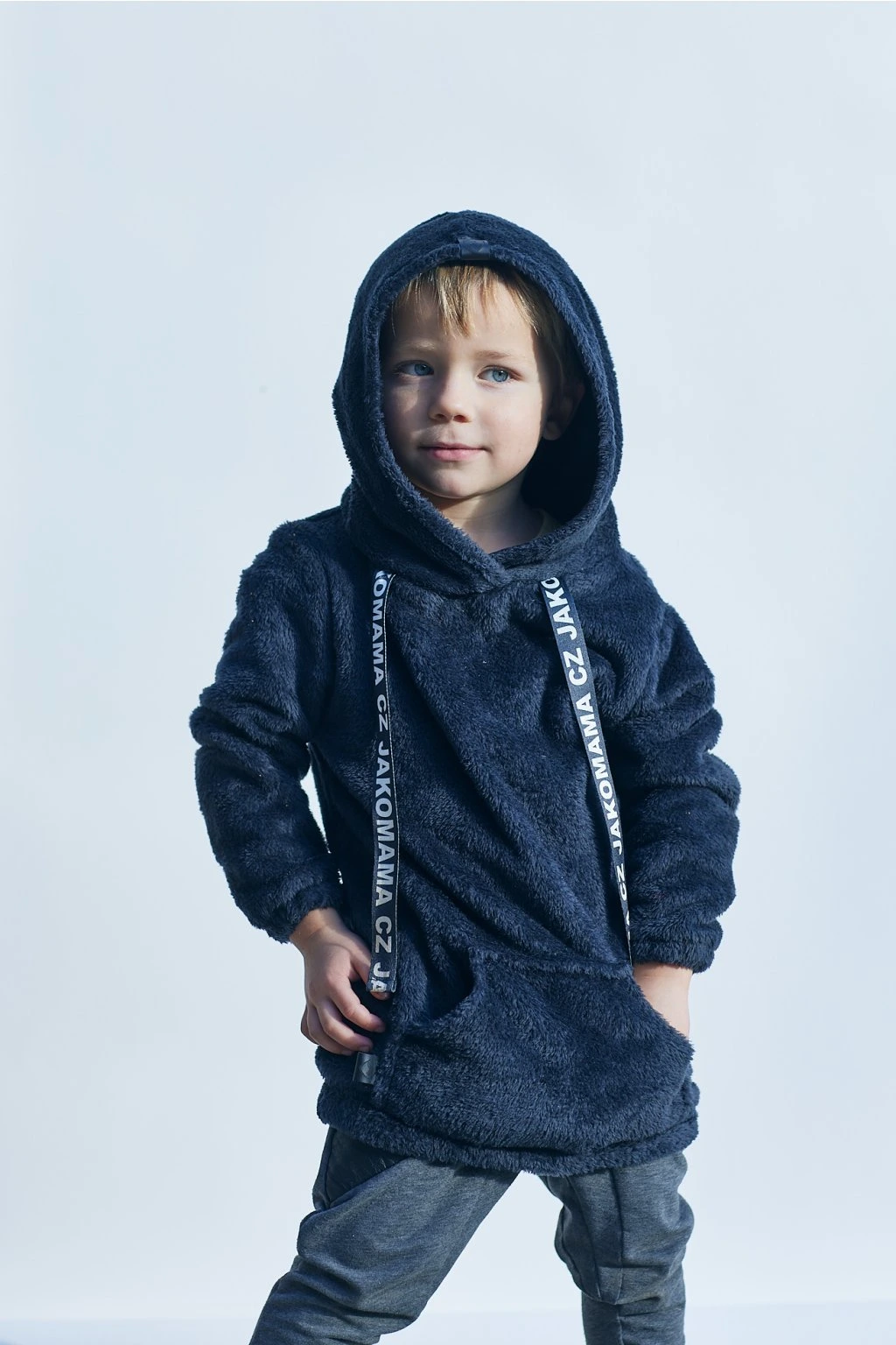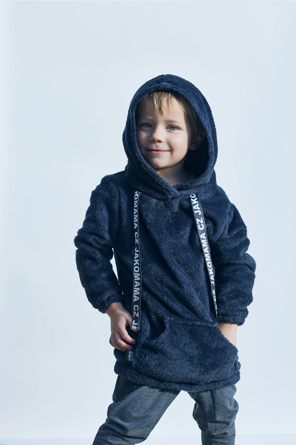 Teploučká zimní mikina má volnější a delší střih. Je ušitá z černého chlupatého fleecu. Spodní lem a rukávy jsou zakončené gumičkou. Mikina má kapuci a vpředu kapsu ze stejného materiálu. Ozdobená je vpředu saténovou stuhou s nápisem JAKOMAMA CZ.