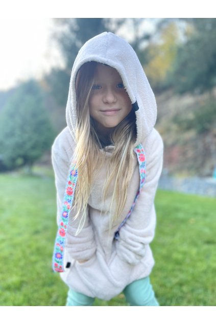 Teploučká zimní mikina má volnější střih a je ušitá z růžového chlupatého fleecu.Spodní lem a rukávy jsou zakončené gumičkou. Mikina má kapuci a vpředu kapsu zestejného materiálu.